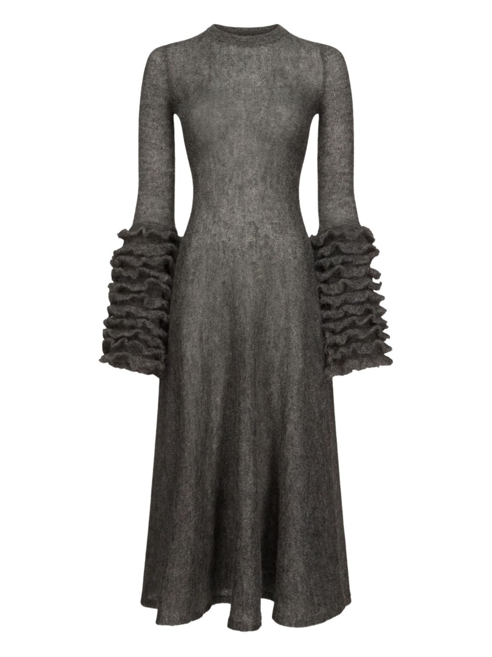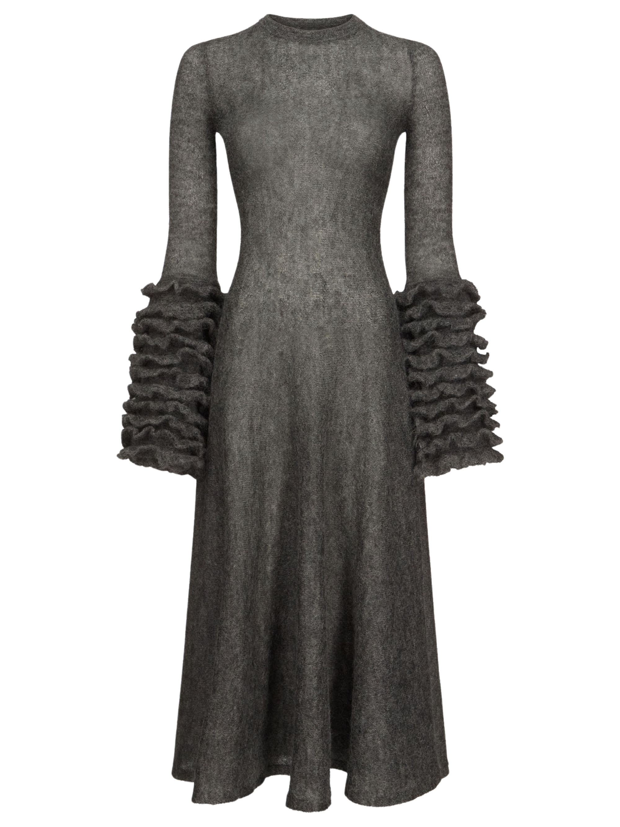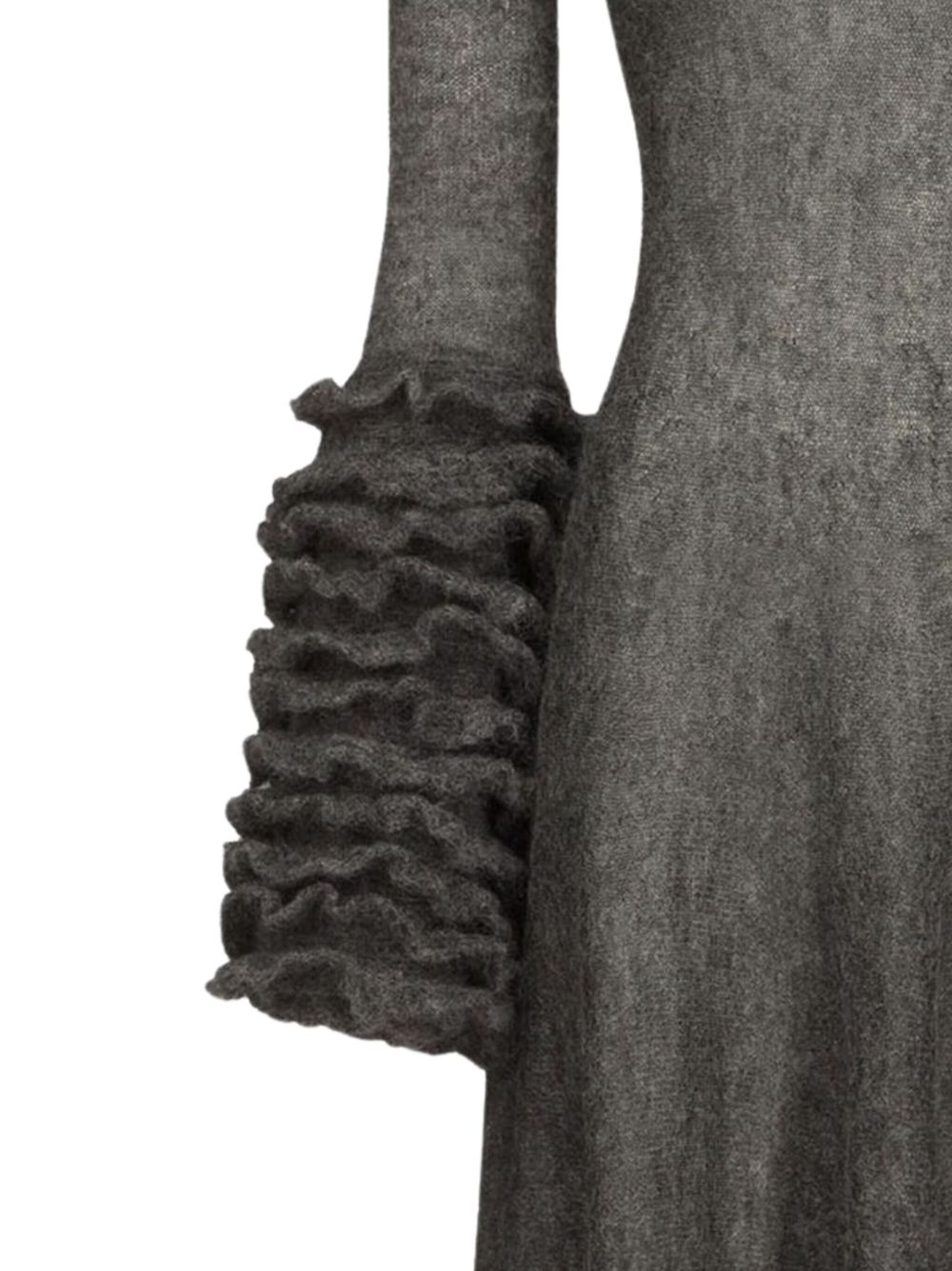 ALAIA grey mohair ruffle dress with a high neck, flared silhouette and crew neck.
