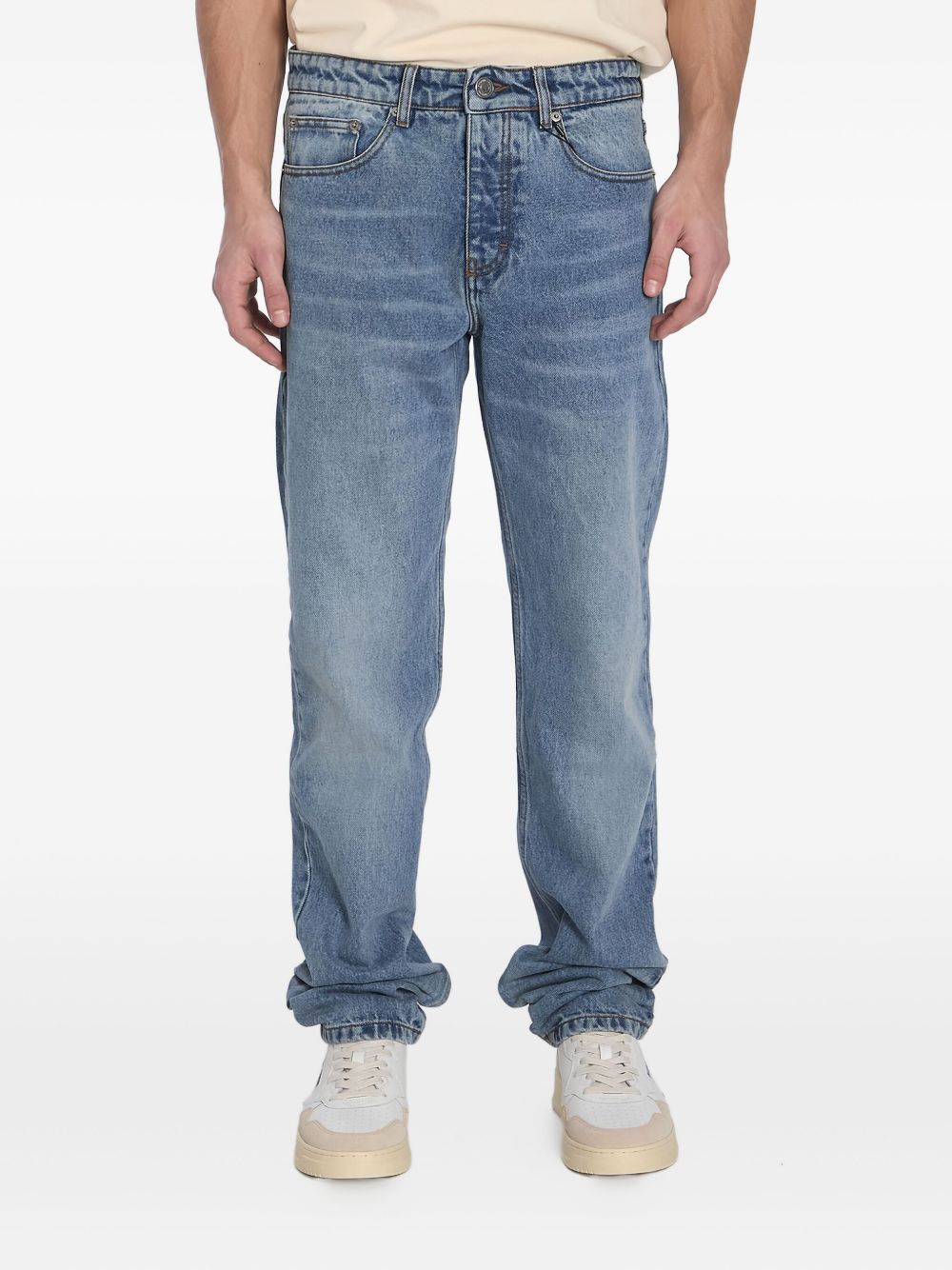 Straight-fit jeans by AMI PARIS in blue cotton, featuring a regular waist, 5-pocket style, front button and zip fastening, belt loops and logo on the back.