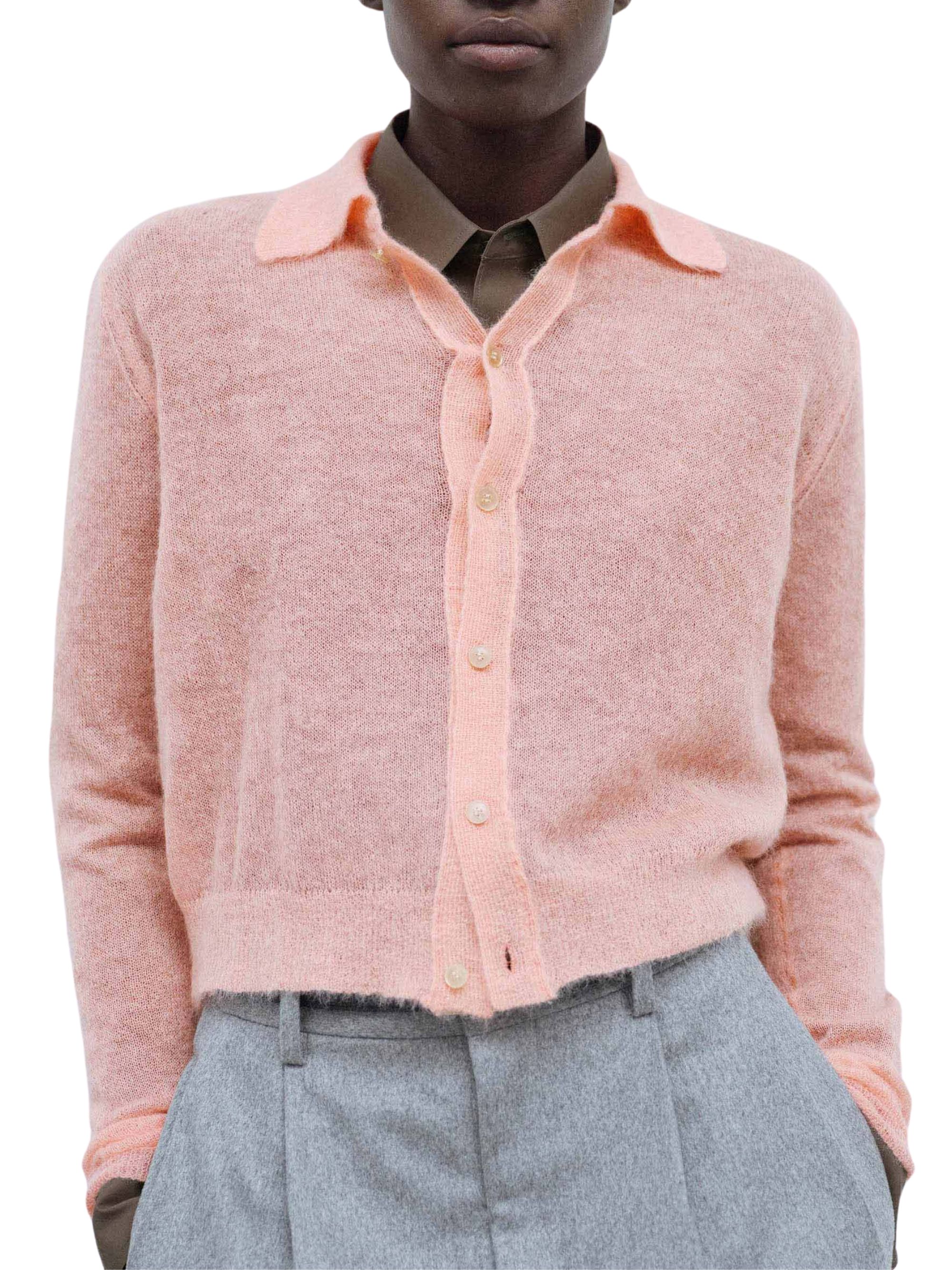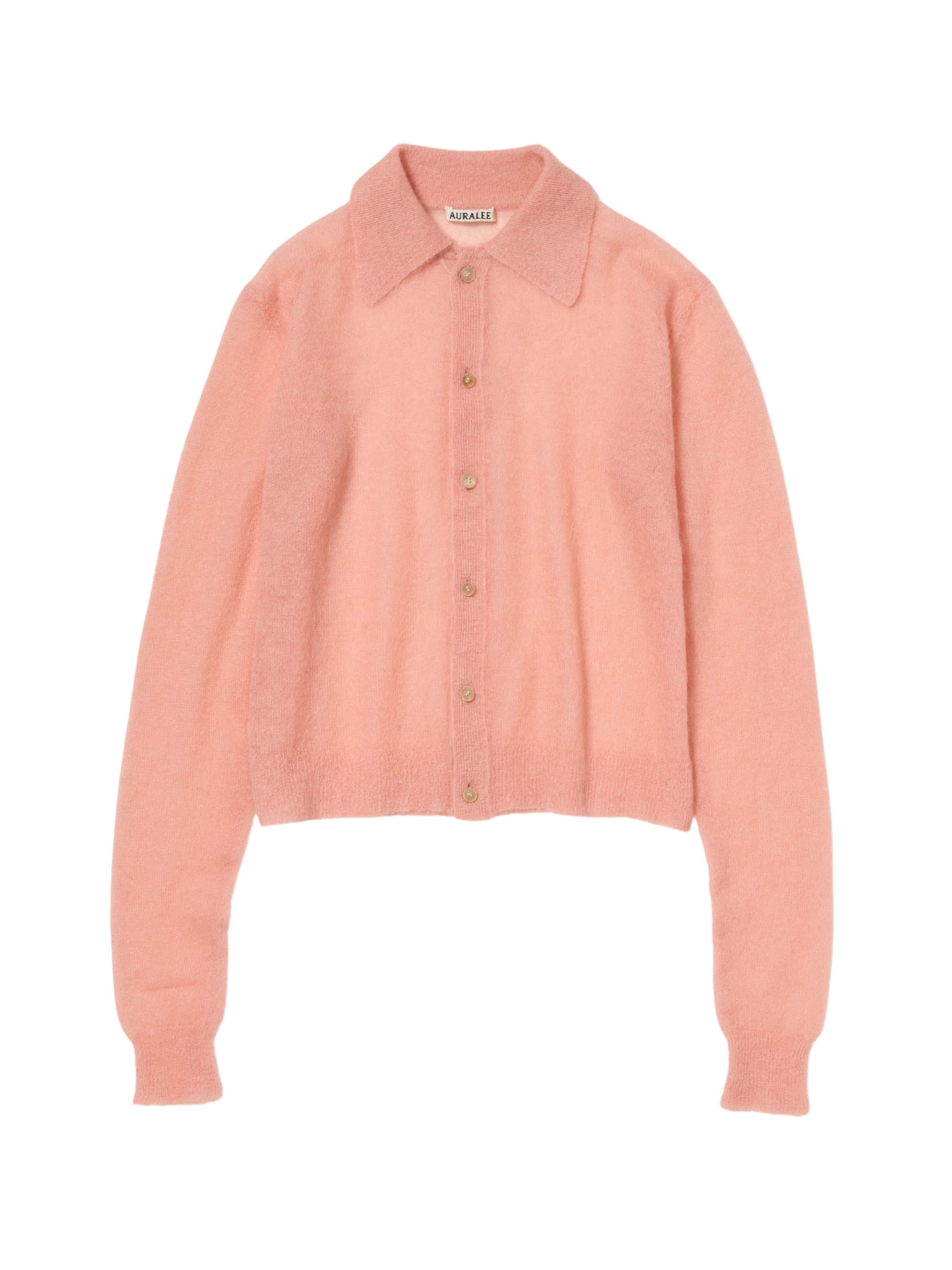Pink AURALEE mohair cardigan in brushed mohair wool, featuring a ribbed collar, cuffs, and a button closure.