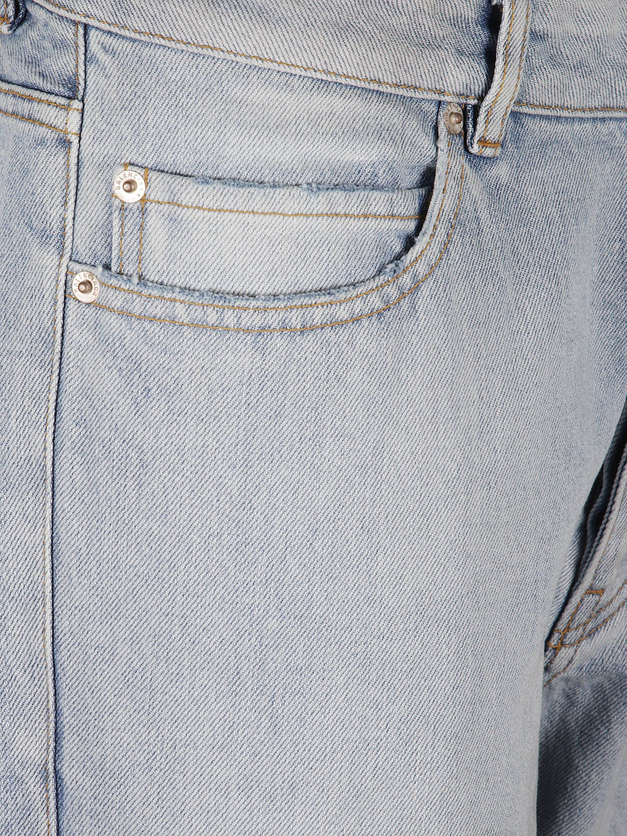 BALENCIAGA light blue distressed cotton denim jeans with a distressed, worn effect, a mid-rise, belt loops, a five-pocket design, a denim patch on the back, and a concealed zip closure.