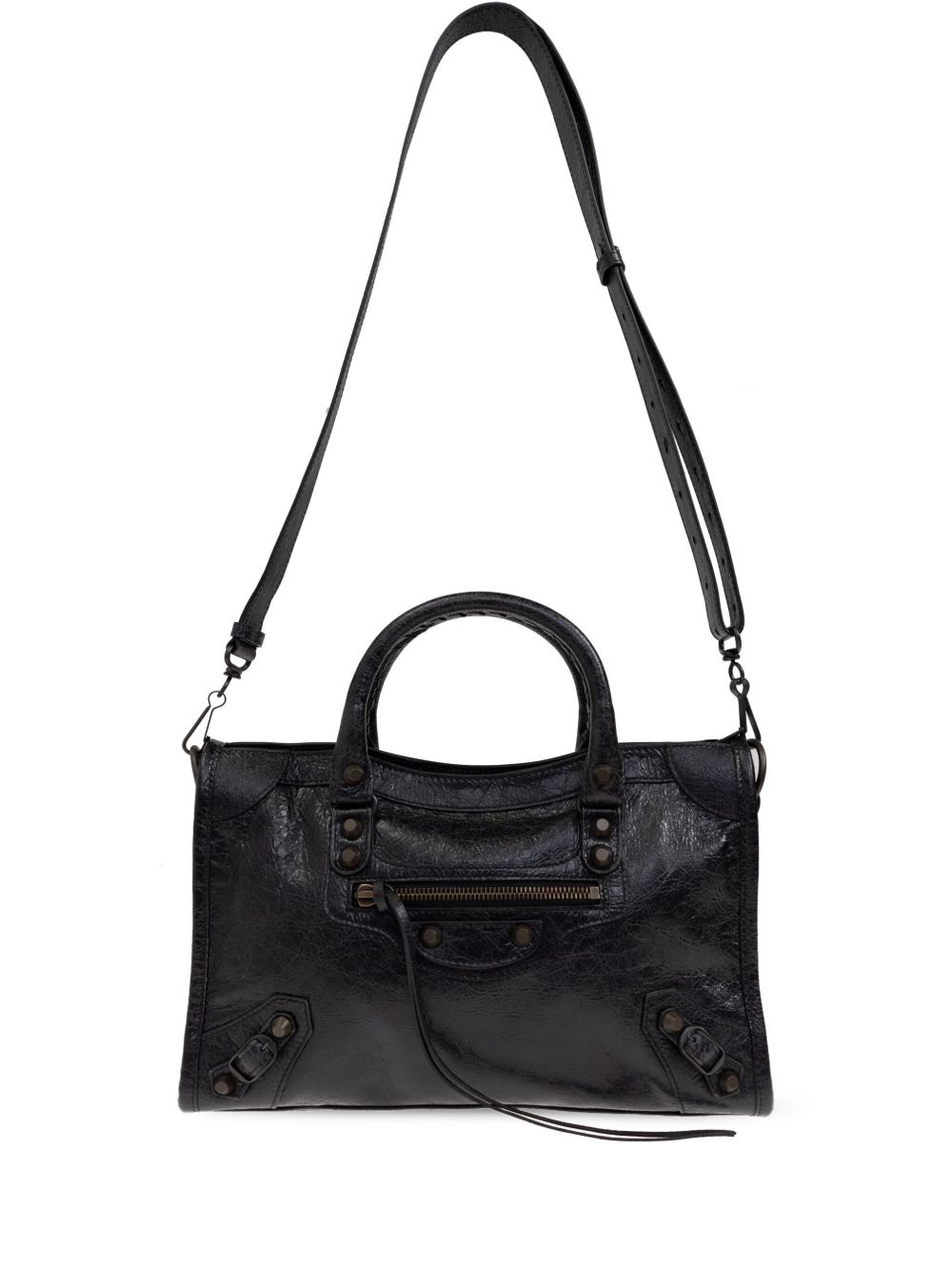 BALENCIAGA Le City small bag in black leather, featuring a removable and adjustable shoulder strap, brass hardware, zip closure with knotted leather zip pull and various internal and external pockets.