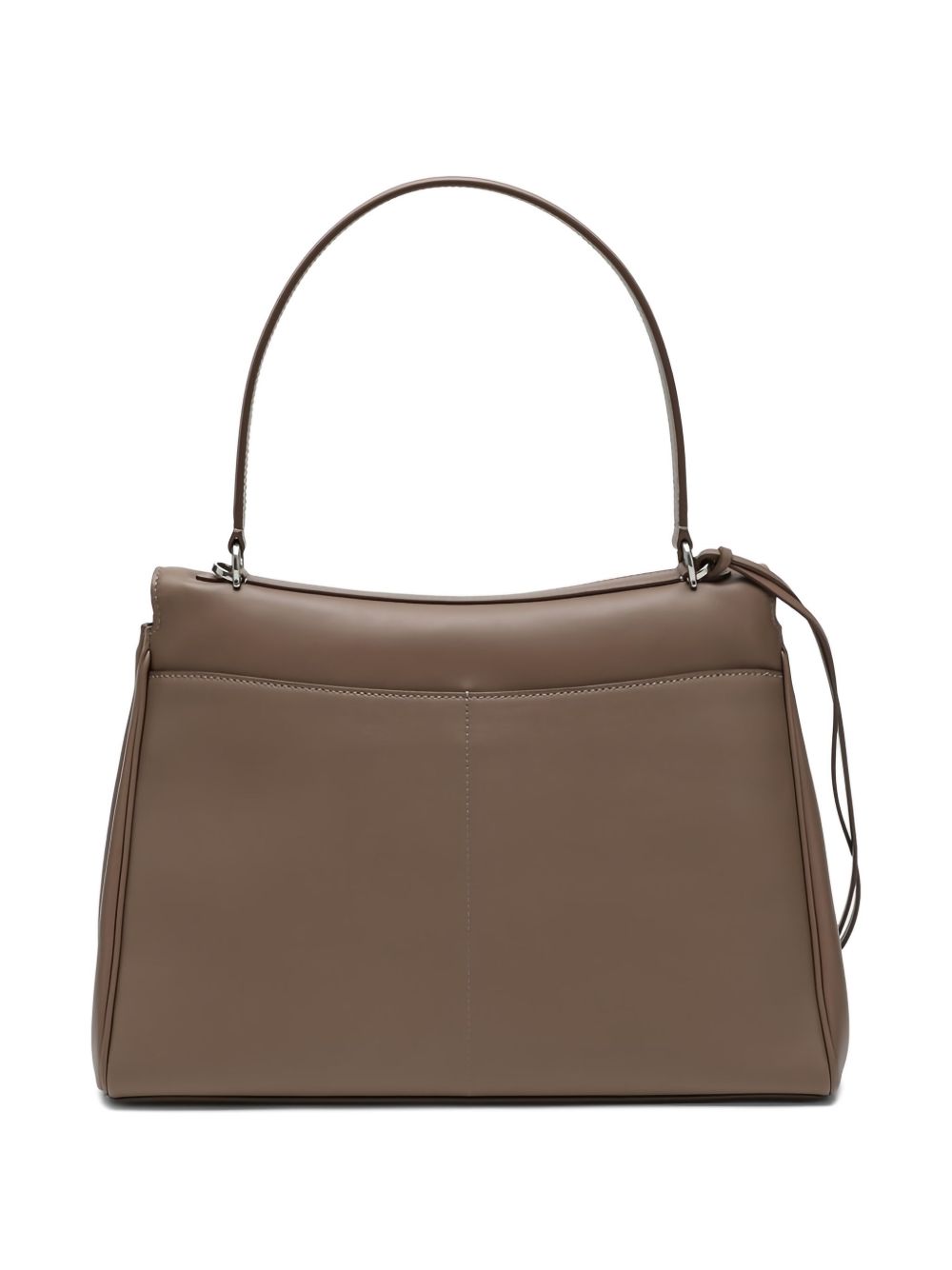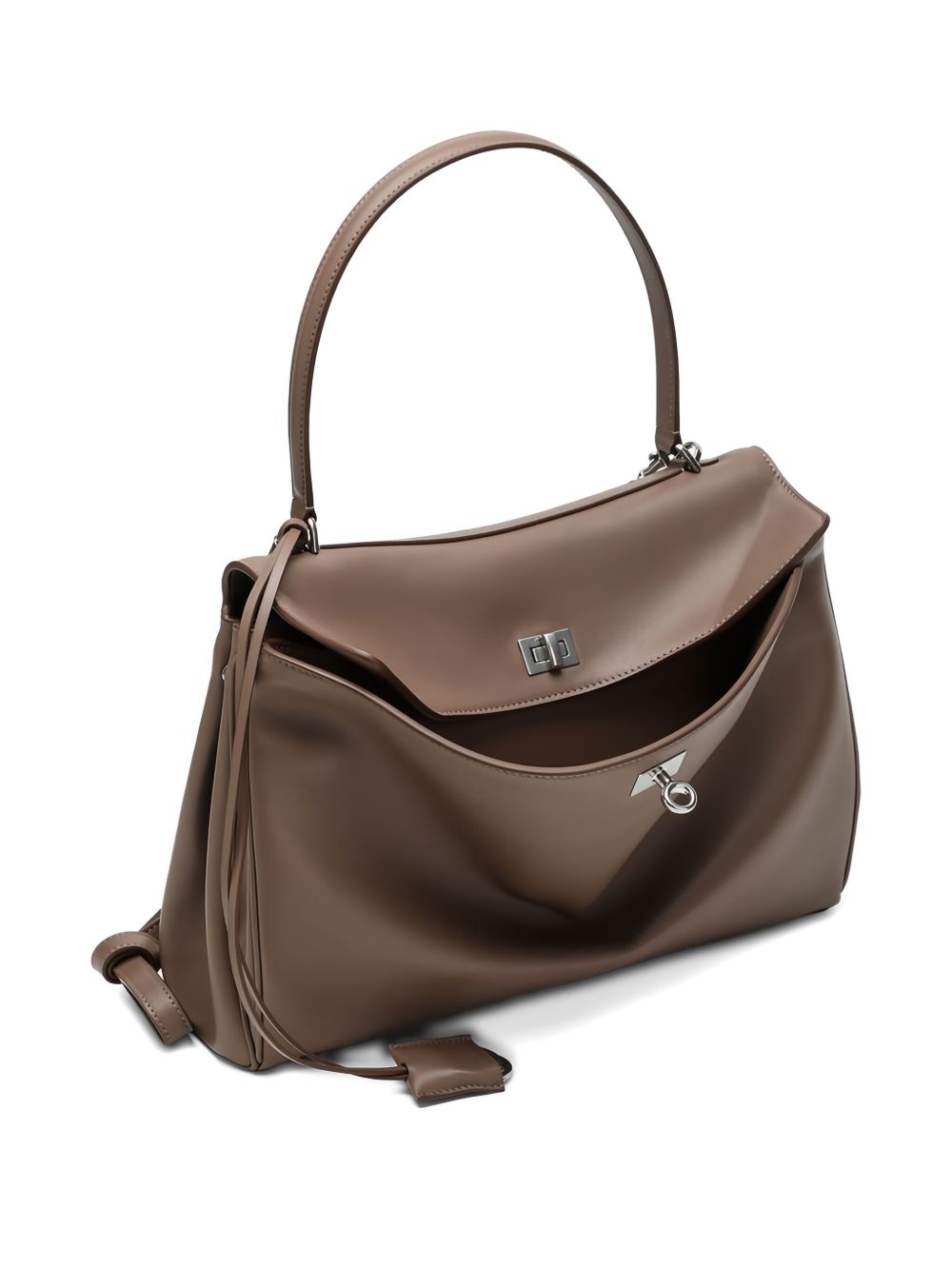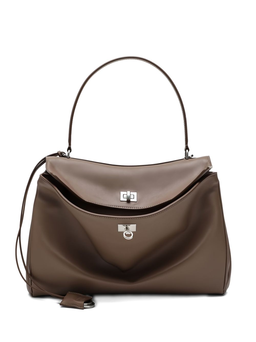 BALENCIAGA medium Rodeo bag in brown leather, featuring a removable shoulder strap, a removable key ring, silver hardware, a twist lock closure, brass feet, a main compartment and multiple pockets inside and on the back.