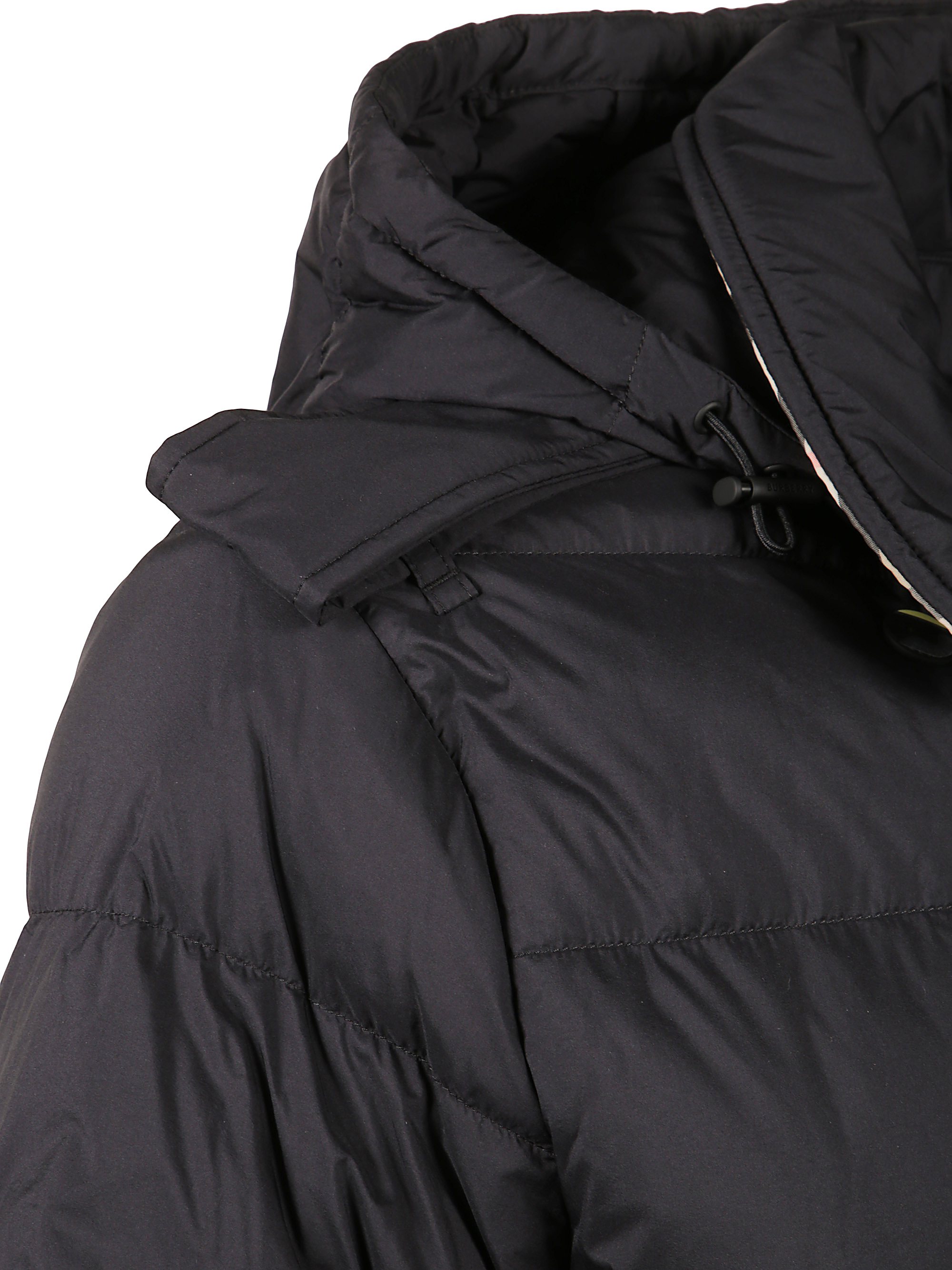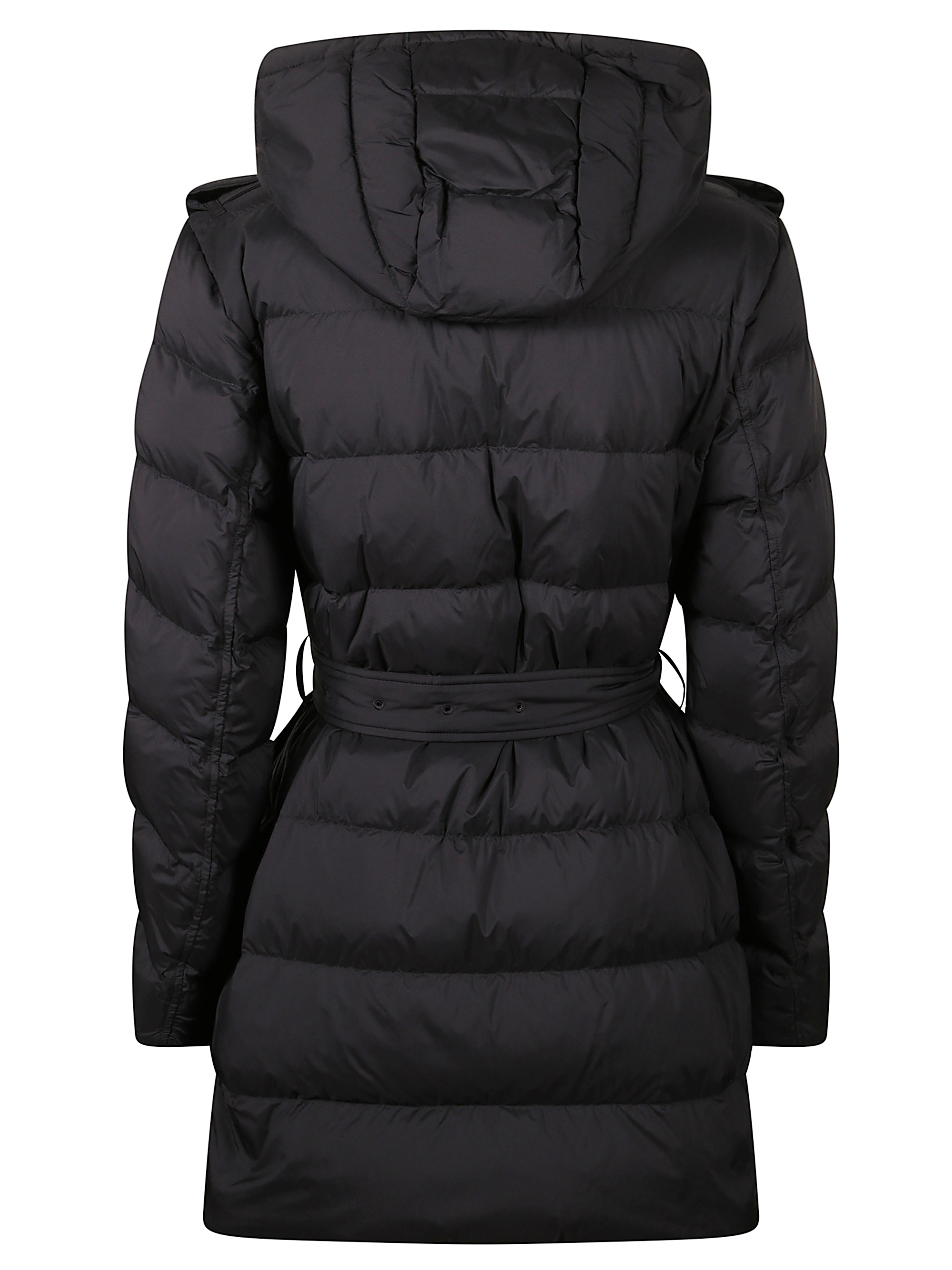 Black nylon belted hooded down jacket by BURBERRY, featuring a double-breasted snap button fastening, a belted waist and a checked undercollar.