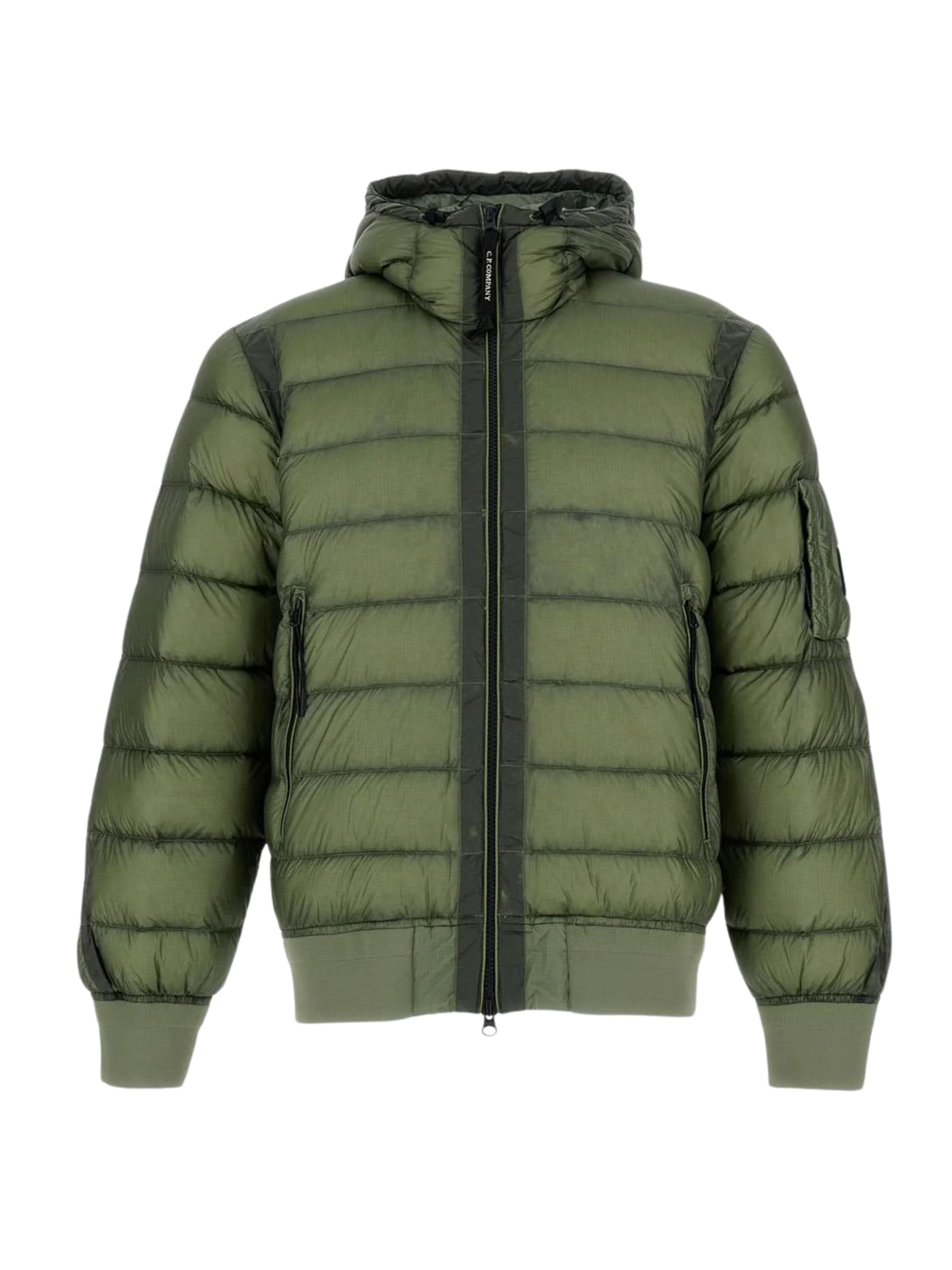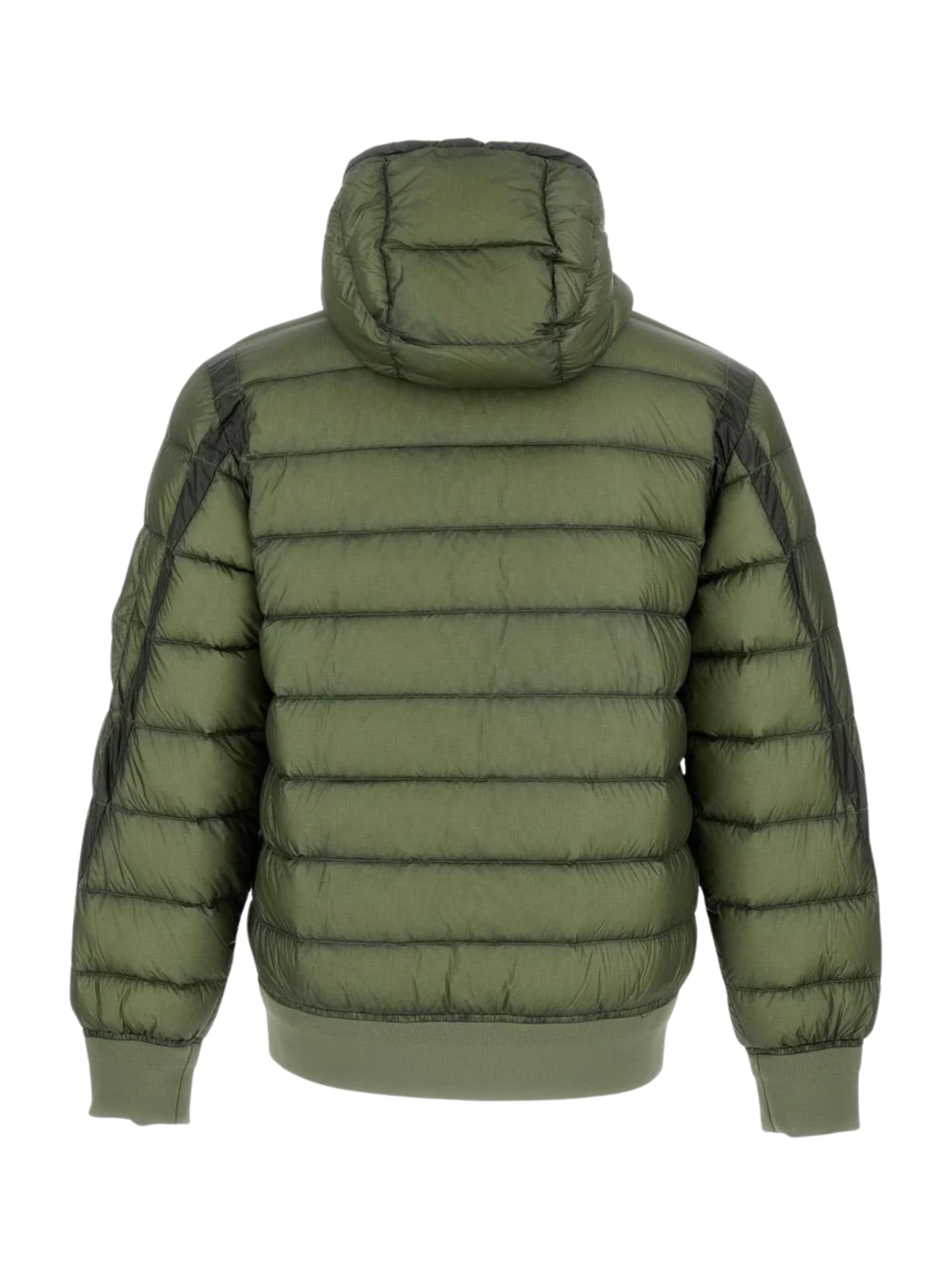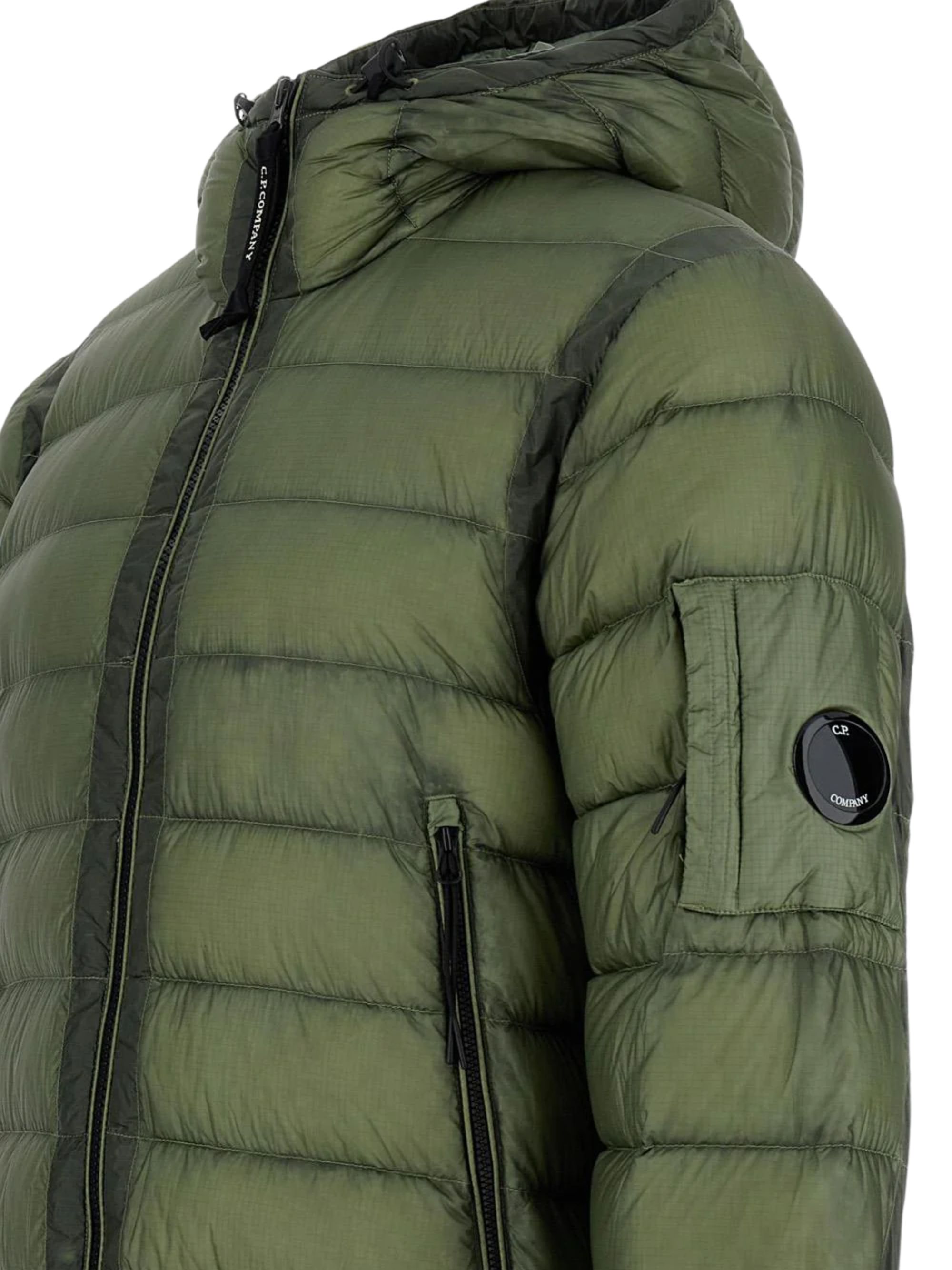C.P. DD-Shell jacket. COMPANY green duck down jacket with a quilted design, hooded neck, signature Lens motif, zip pockets, ribbed hem and cuffs, and a zip closure.