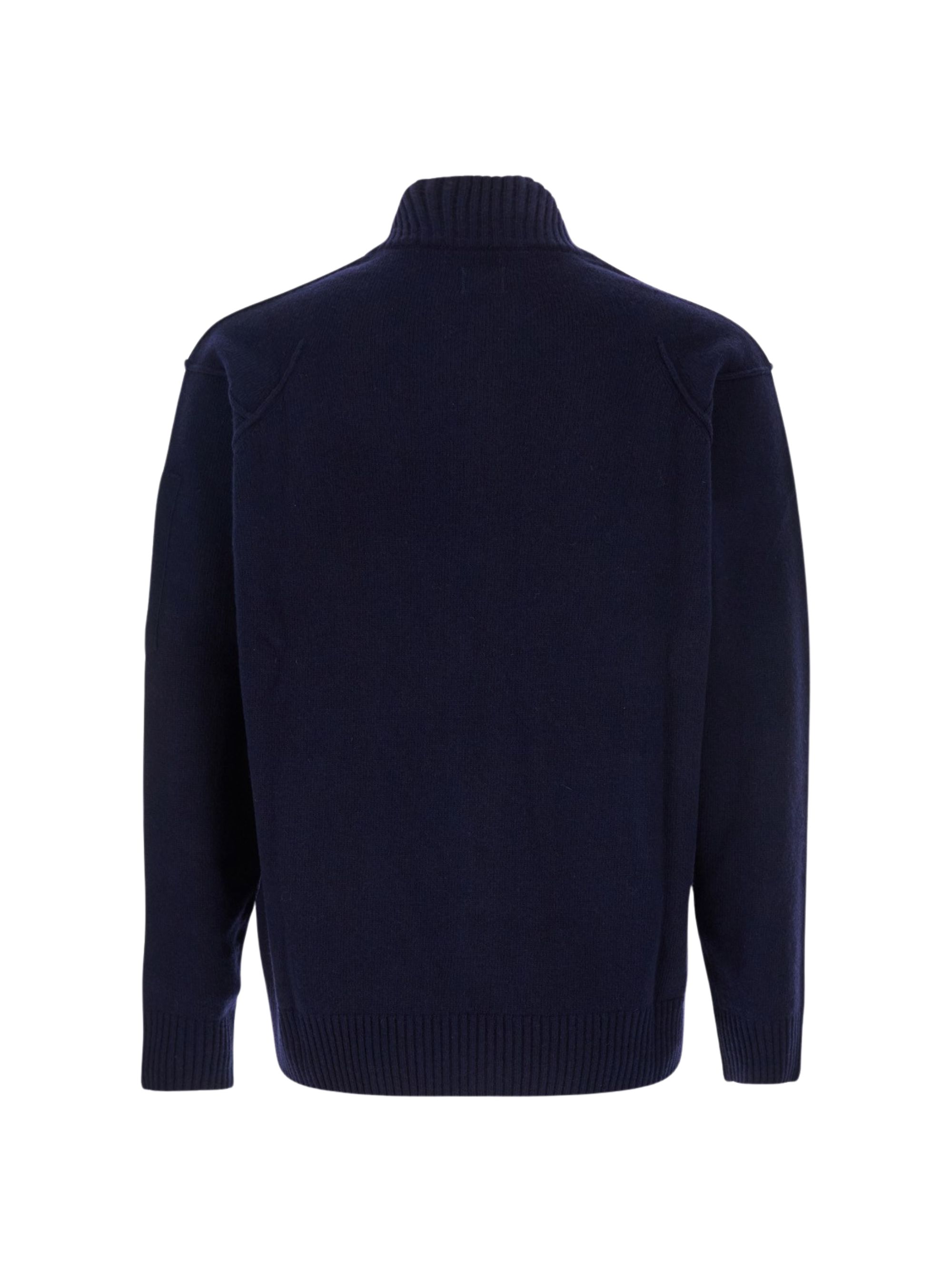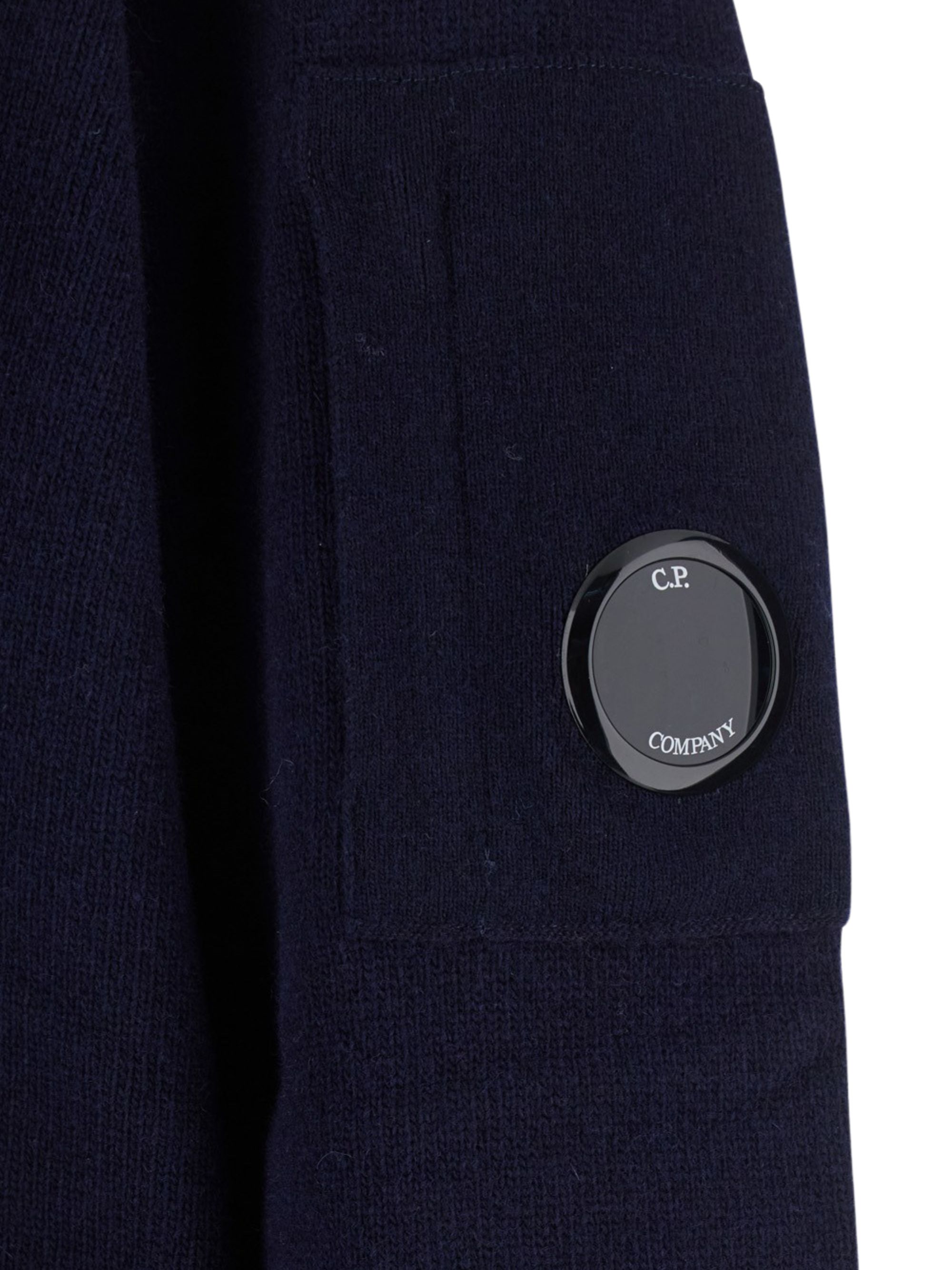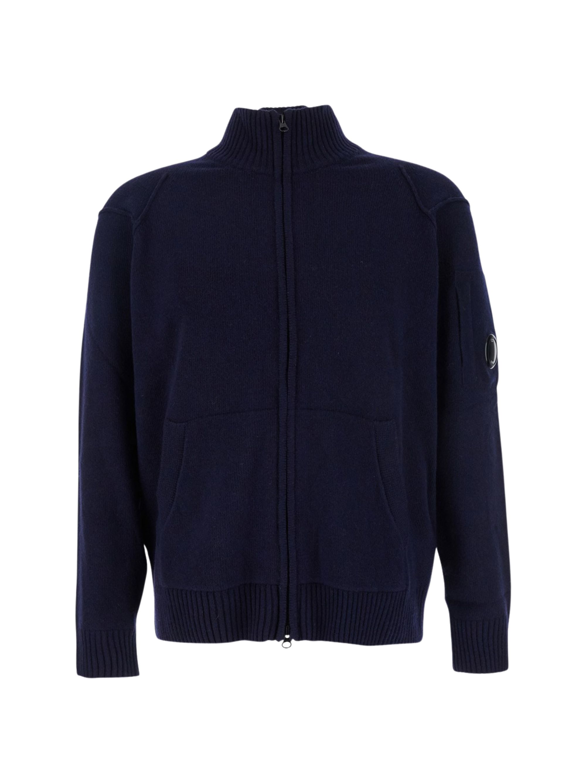 Blue wool knit cardigan by C.P. COMPANY with a ribbed hem and cuffs and a zip closure.