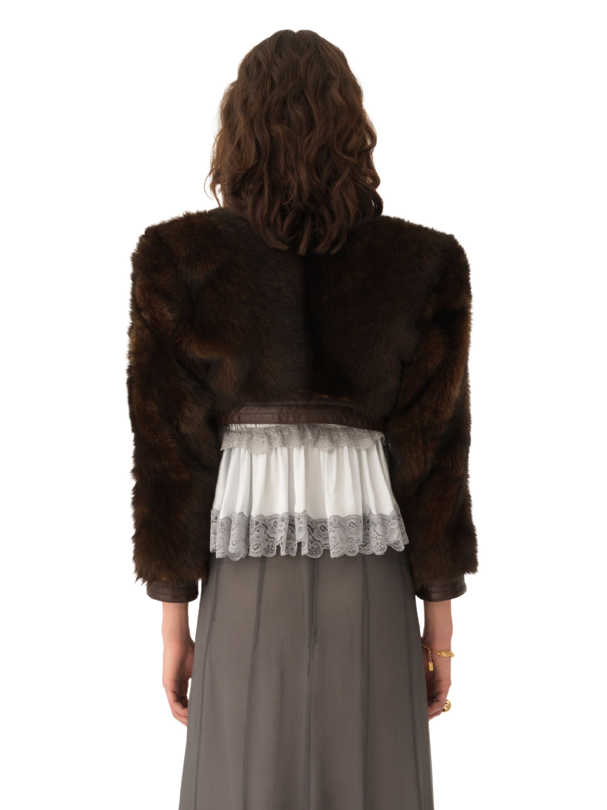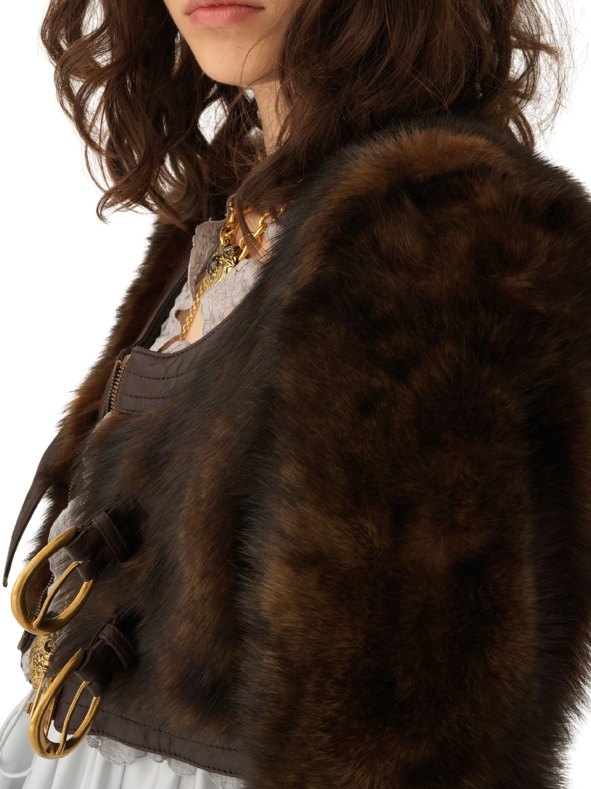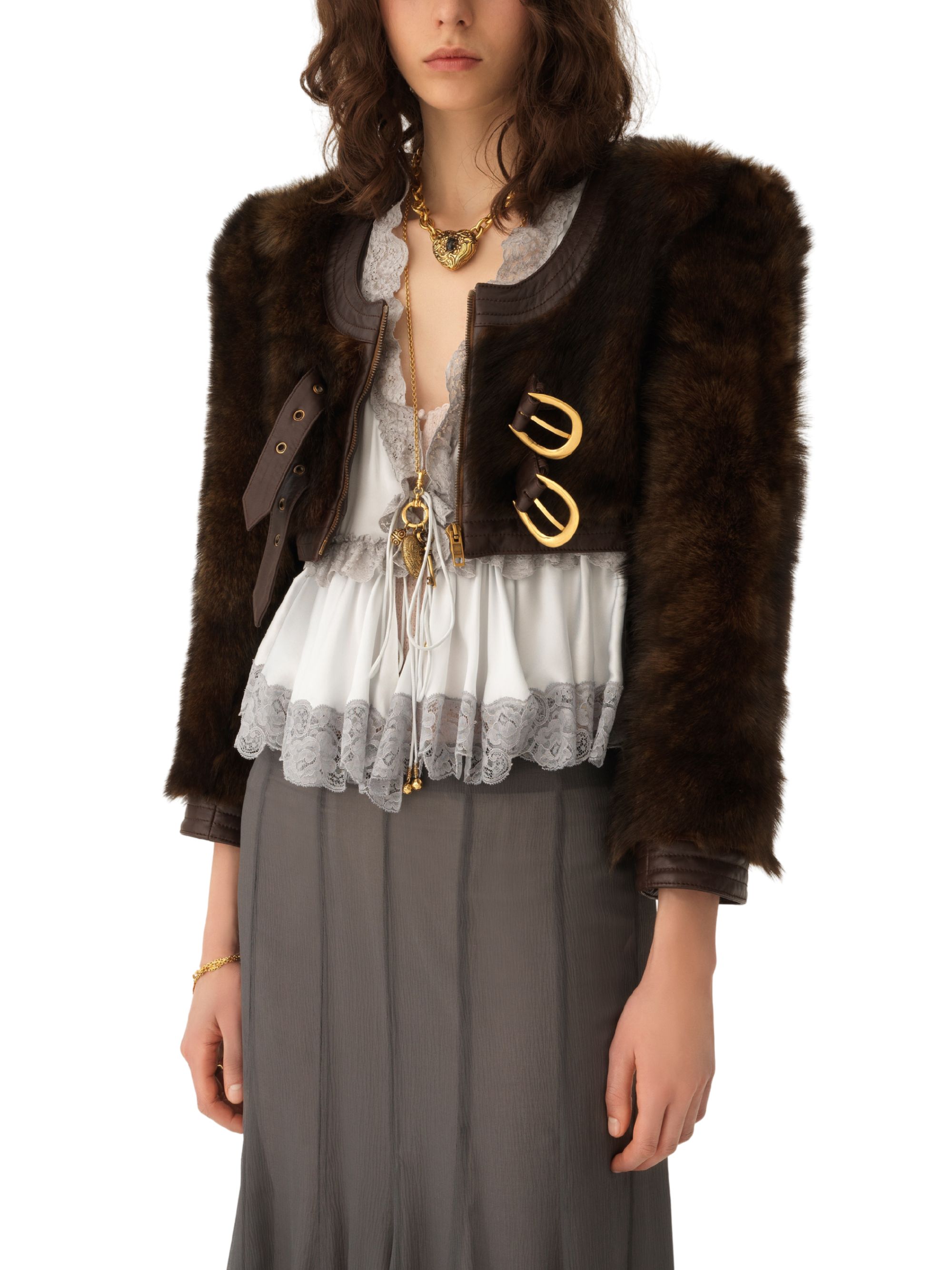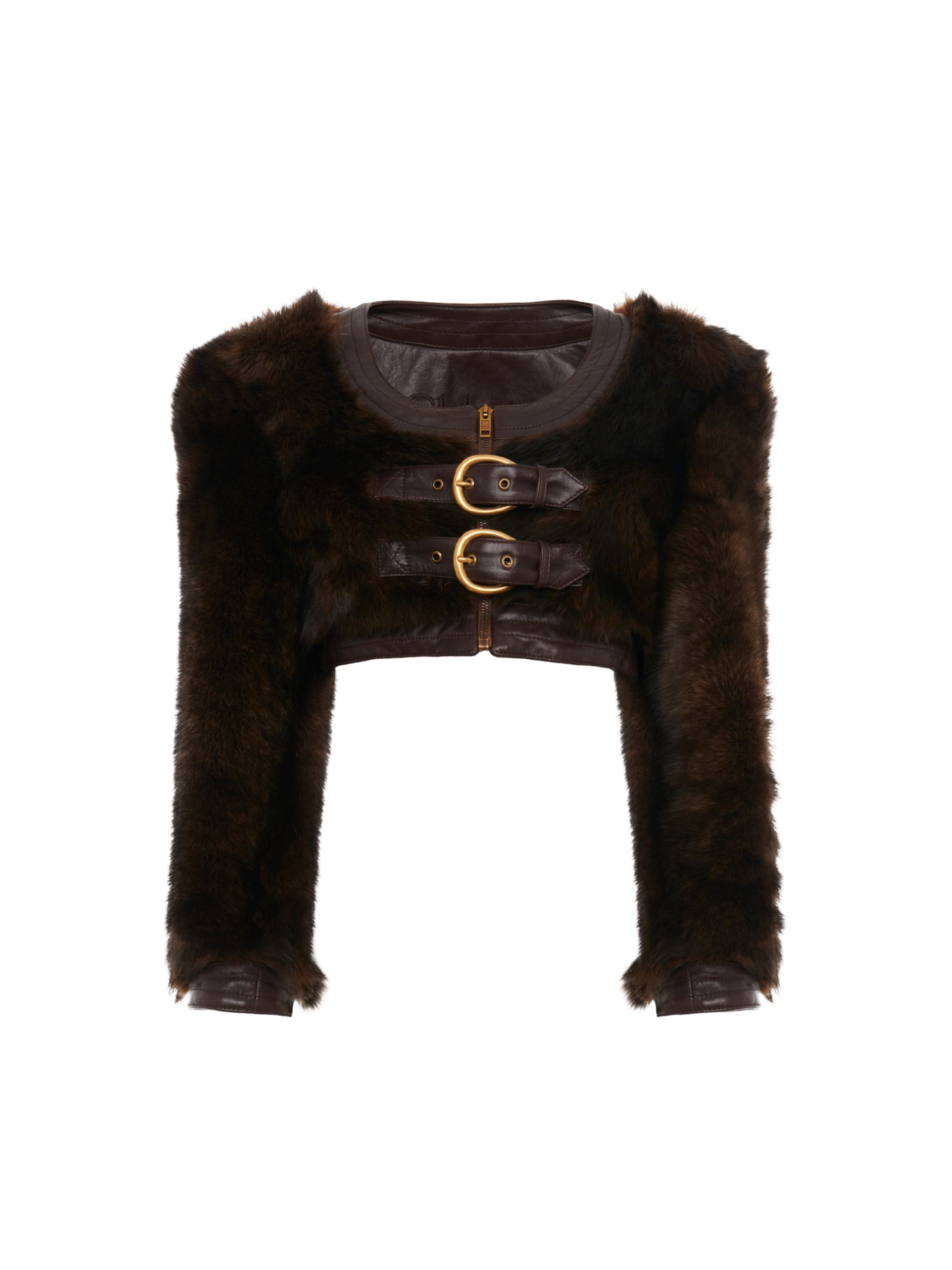 CHLOE' brown leather and fur cropped Spencer jacket with buckles, featuring smooth leather trim, a front zip fastening and buckled tabs.