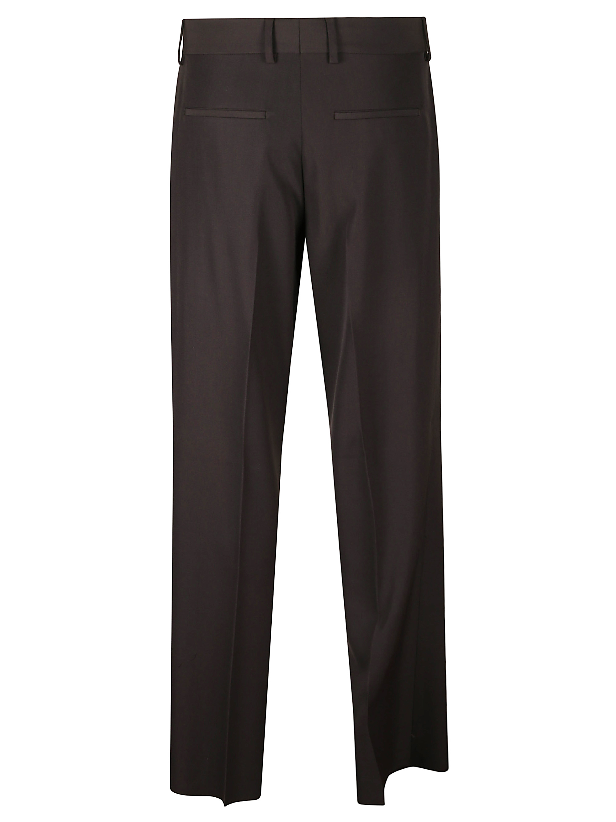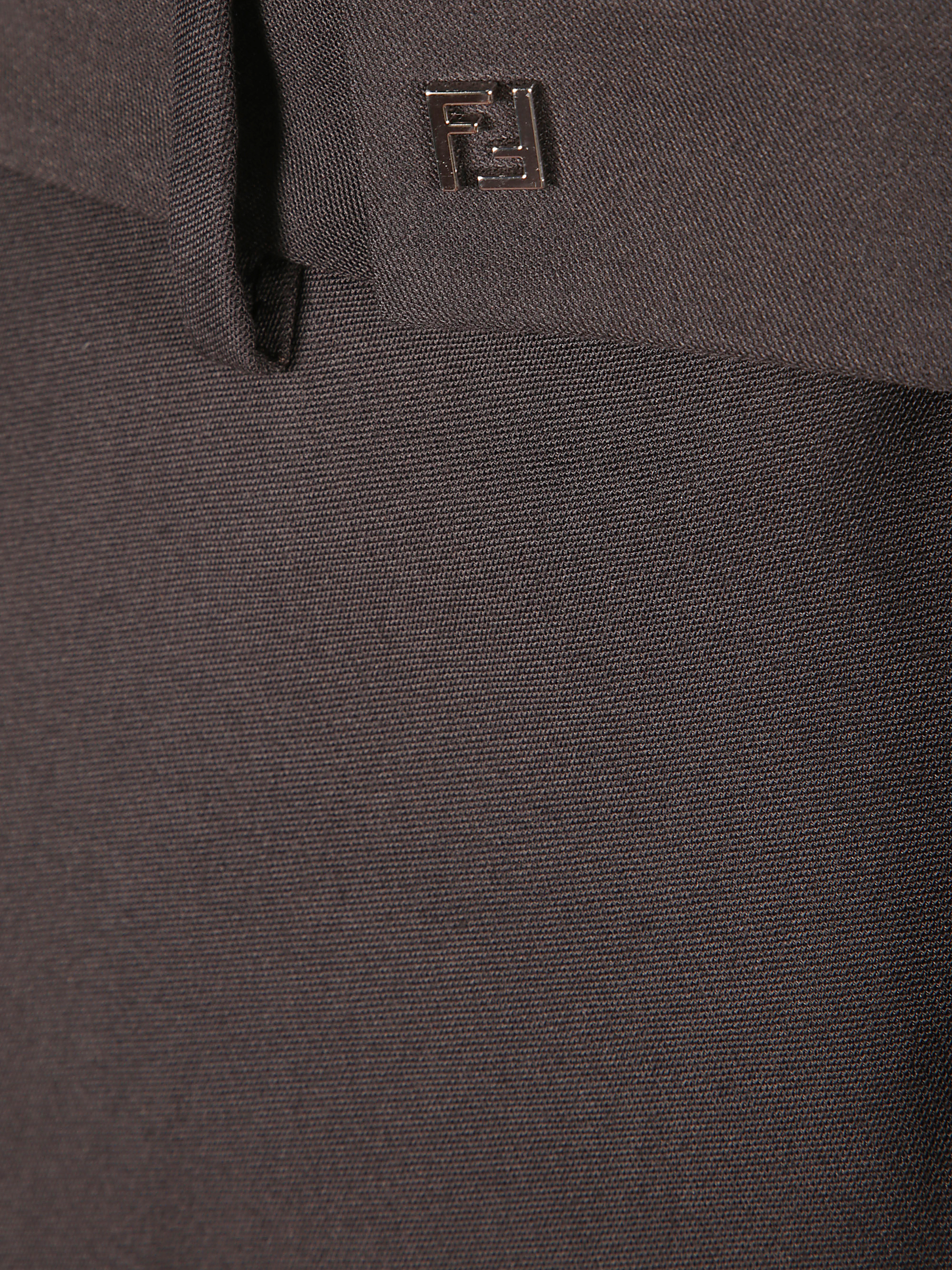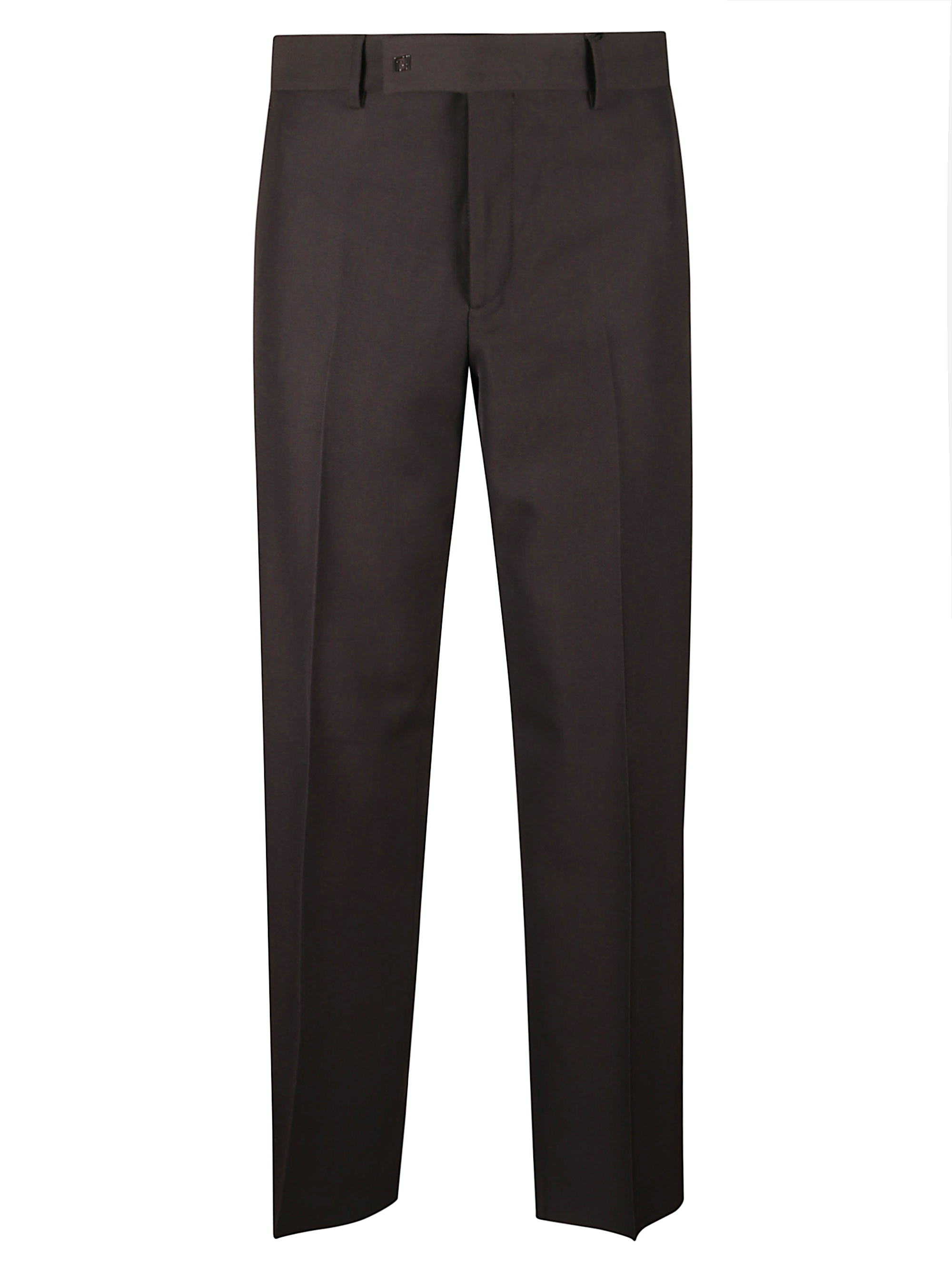 FENDI brown wool crepe cigarette trousers featuring a covered zip and hook fastening, belt loops at the waist, a palladium metal micro FF logo applied at the waist with a button effect and side pockets.