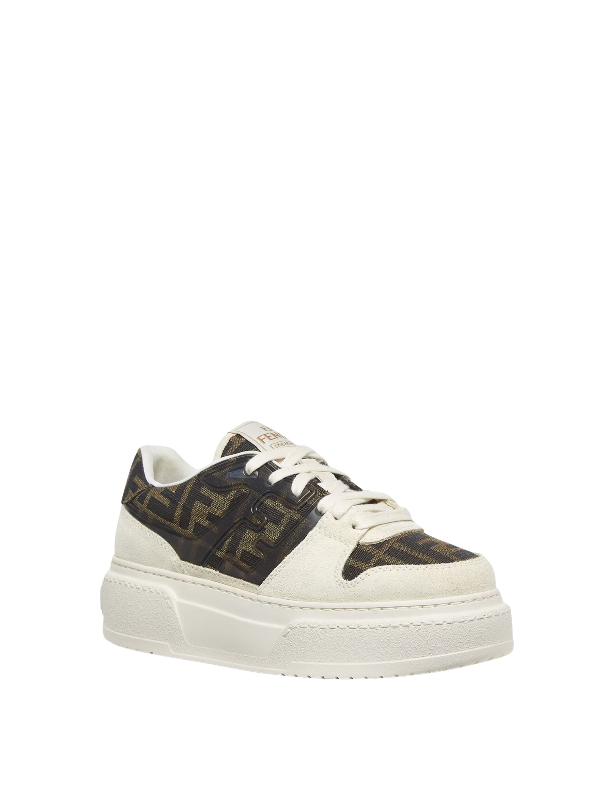 Fendi Match sneaker by FENDI in white suede, featuring jacquard fabric details with brown FF motif, lace-up fastening, rubber platform and macro Fendi lettering in relief on the back.