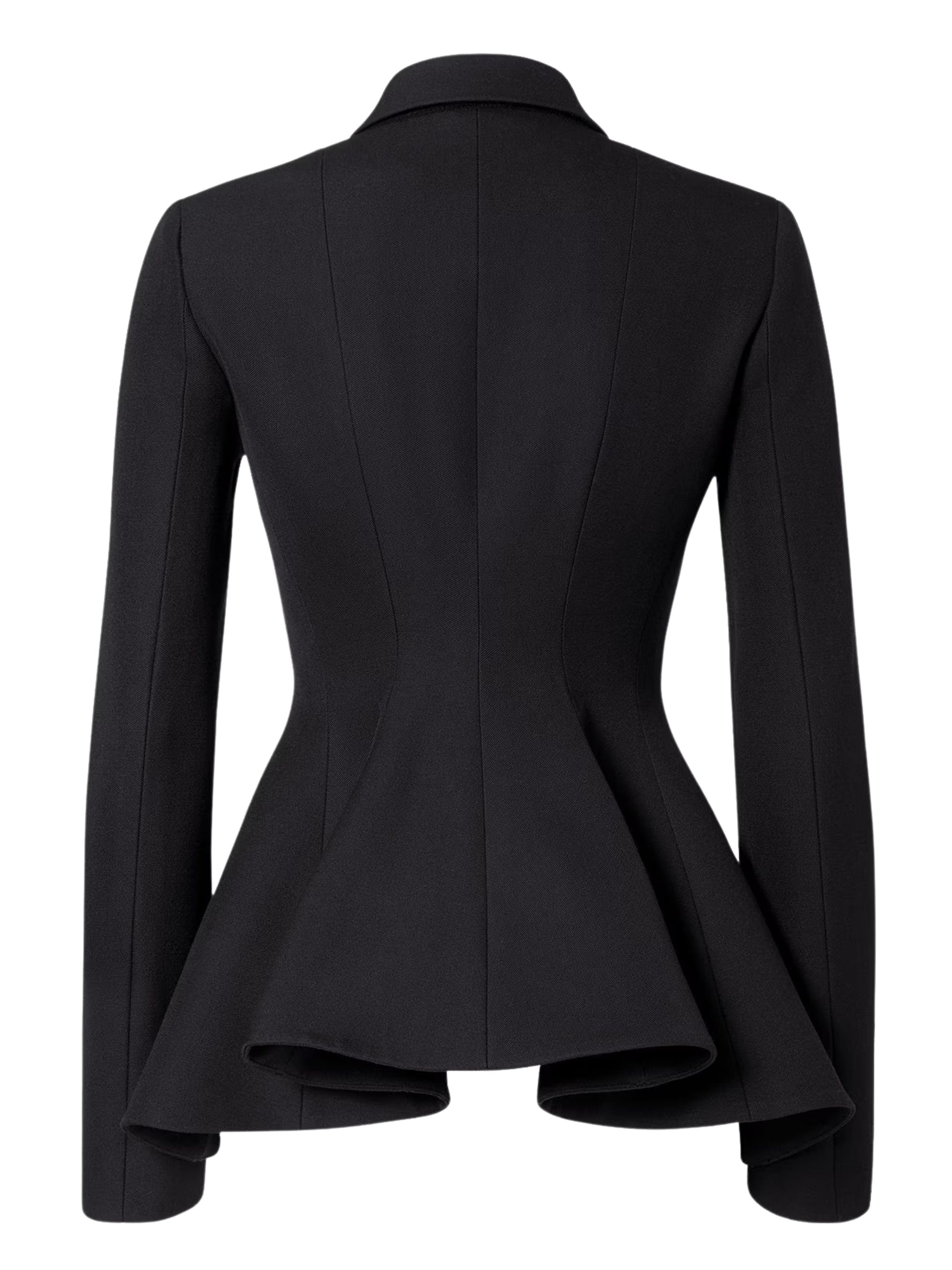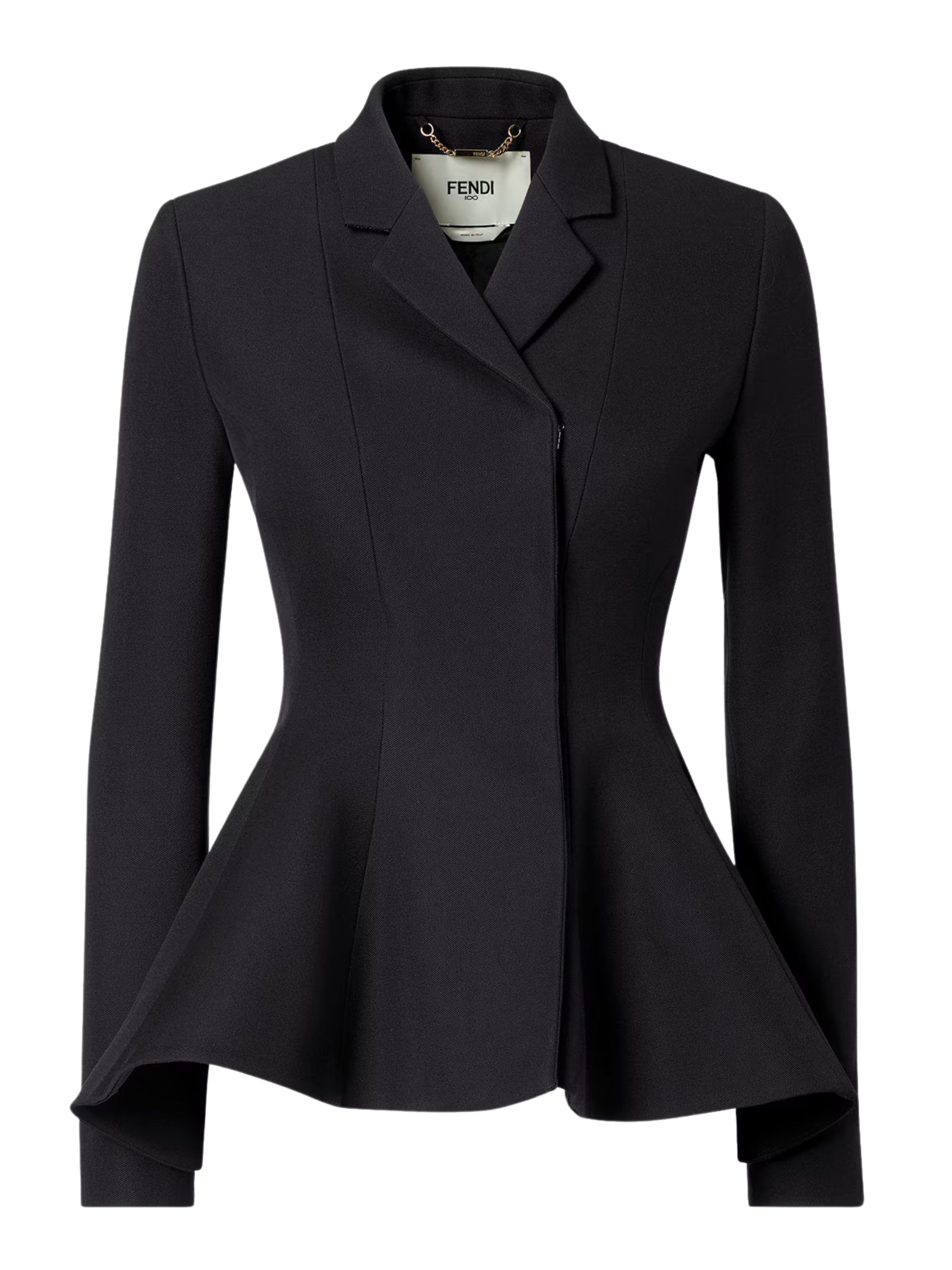 Grain de Poudre double-breasted blazer by FENDI in black wool, featuring a peplum detail at the hem, lapel collar and long sleeves.