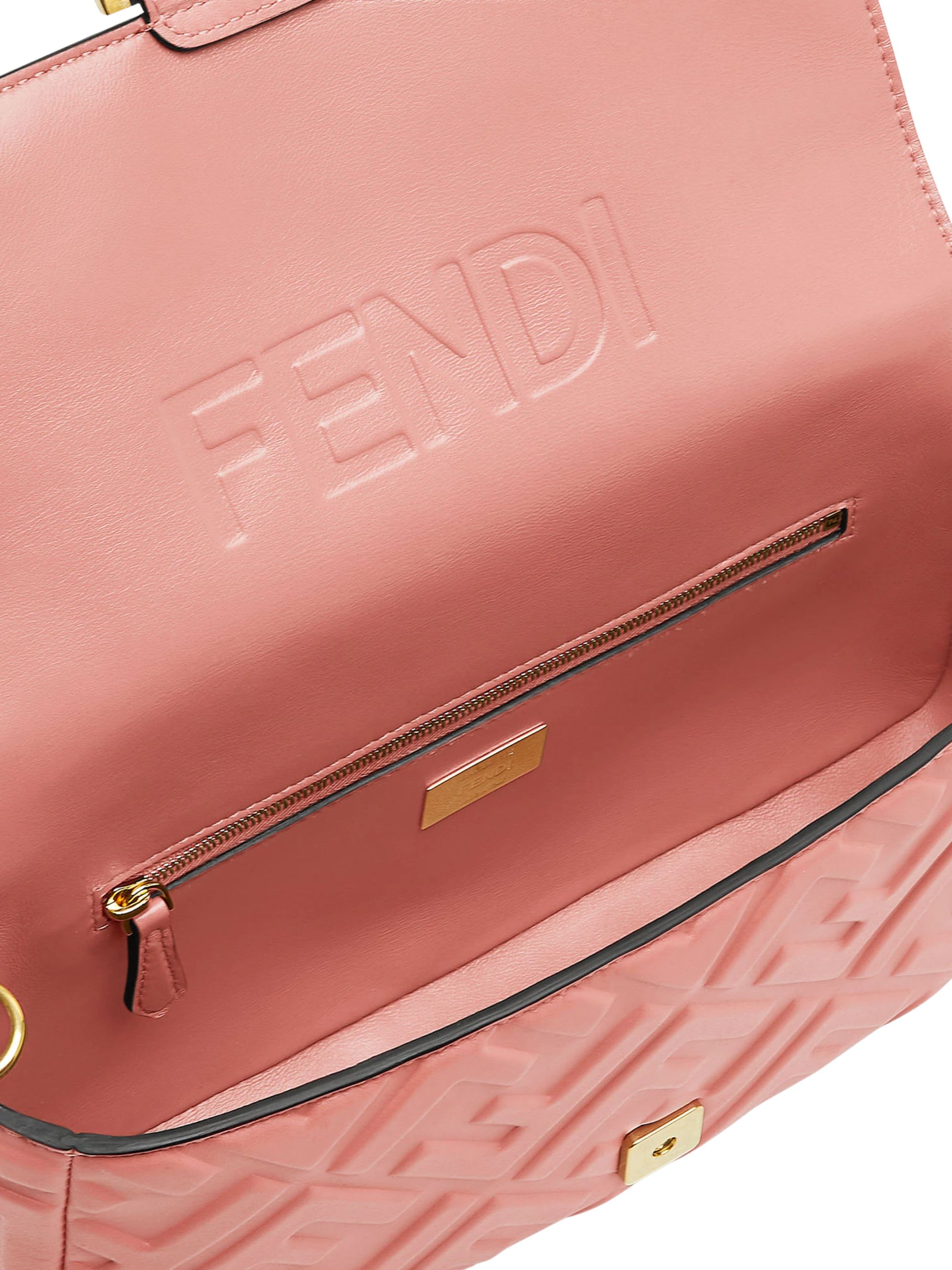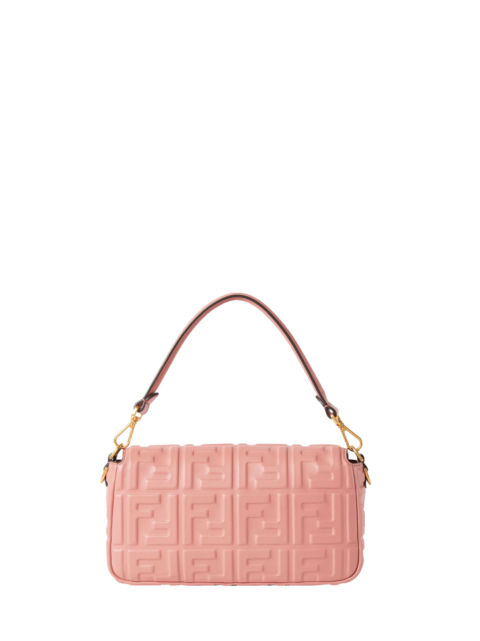 FENDI medium Baguette bag in pink leather with embossed FF motif, featuring FF closure with magnetic button, front flap, FENDI lettering embossed on the inside, inside pocket, vintage gold finishing and removable shoulder strap.