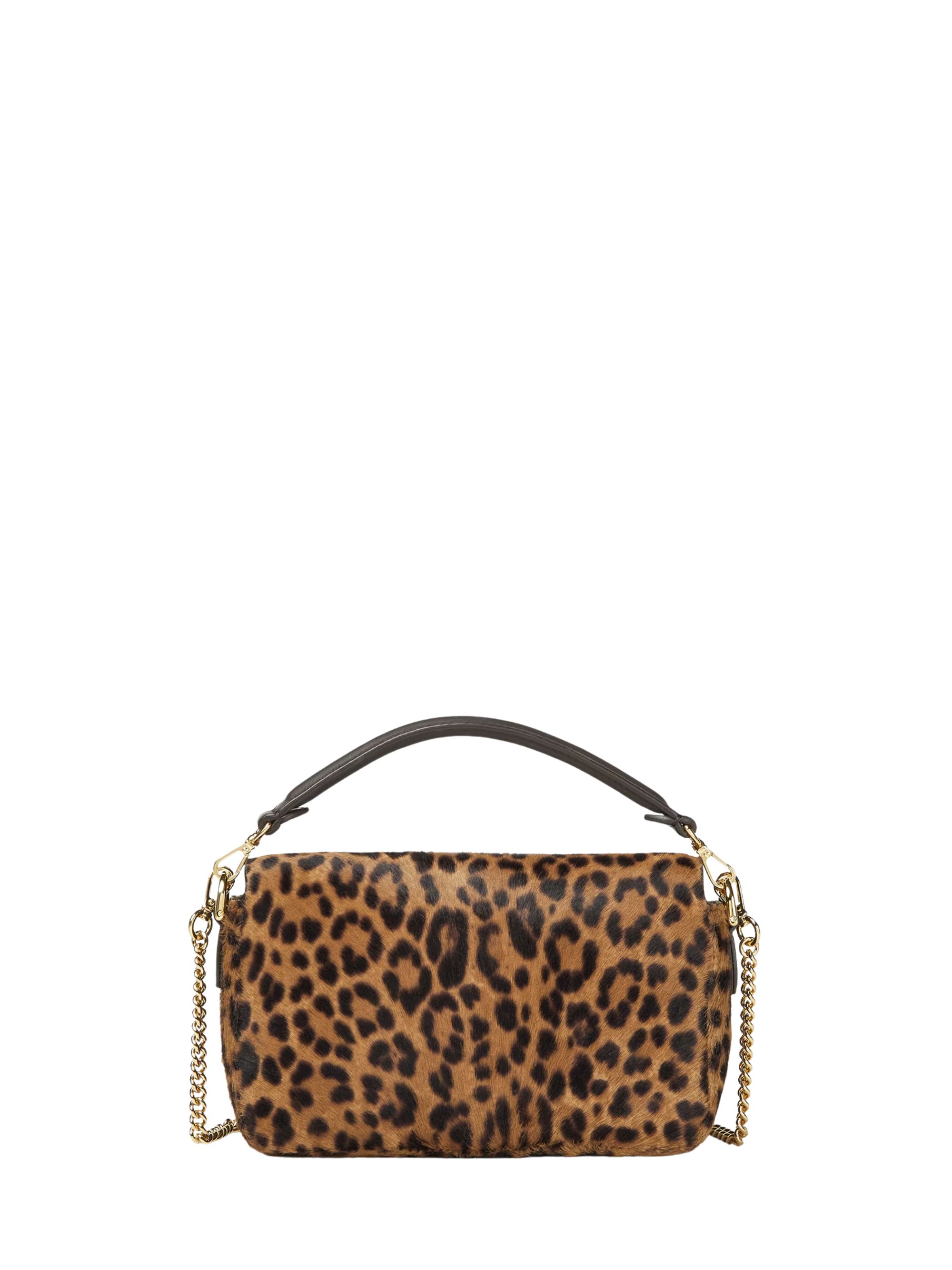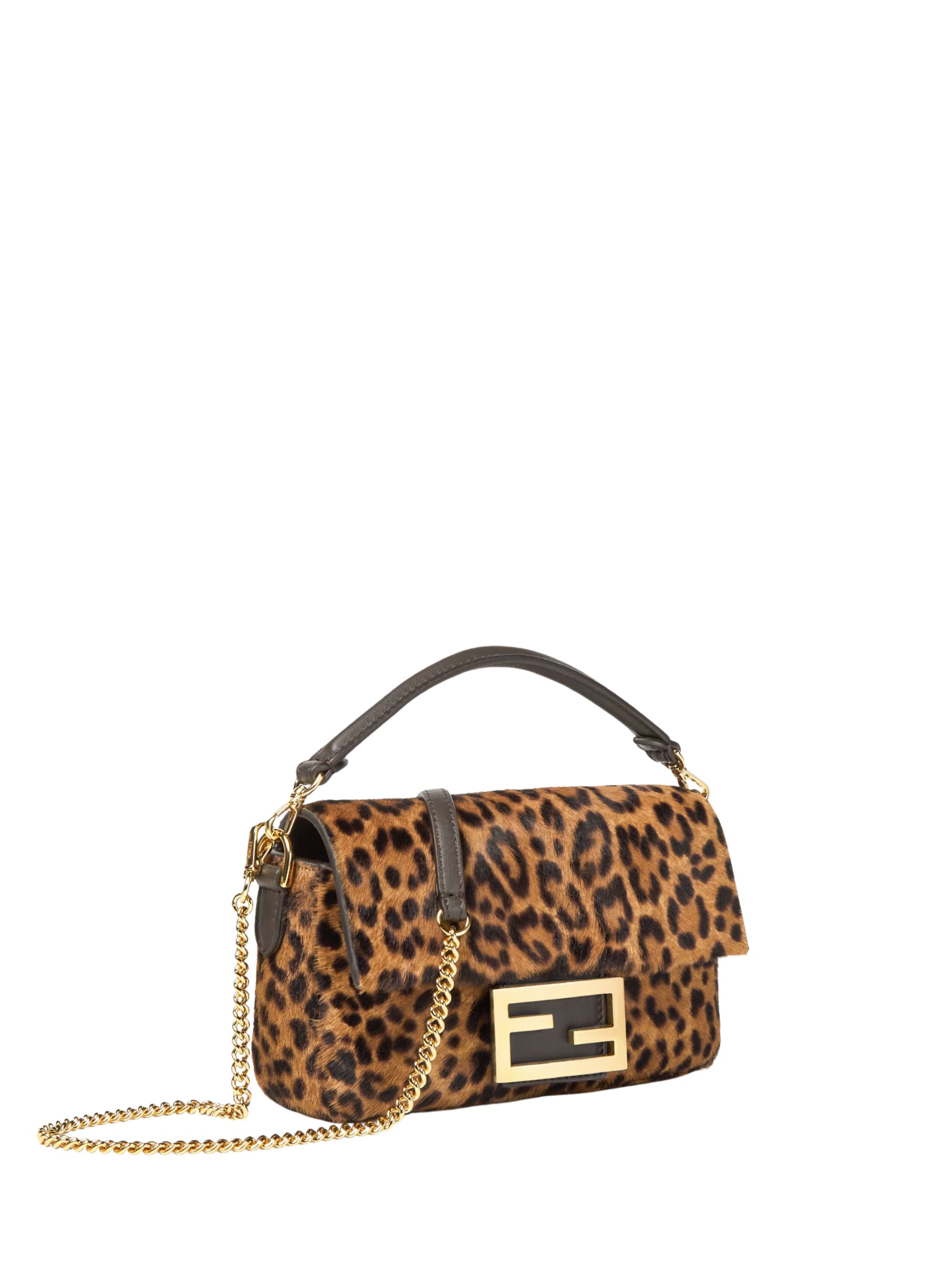 FENDI mini Baguette bag in brown printed pony-effect leather, featuring FF closure with magnetic button, front flap, 3 card slots, gold-finish metal accessories and removable chain shoulder strap.
