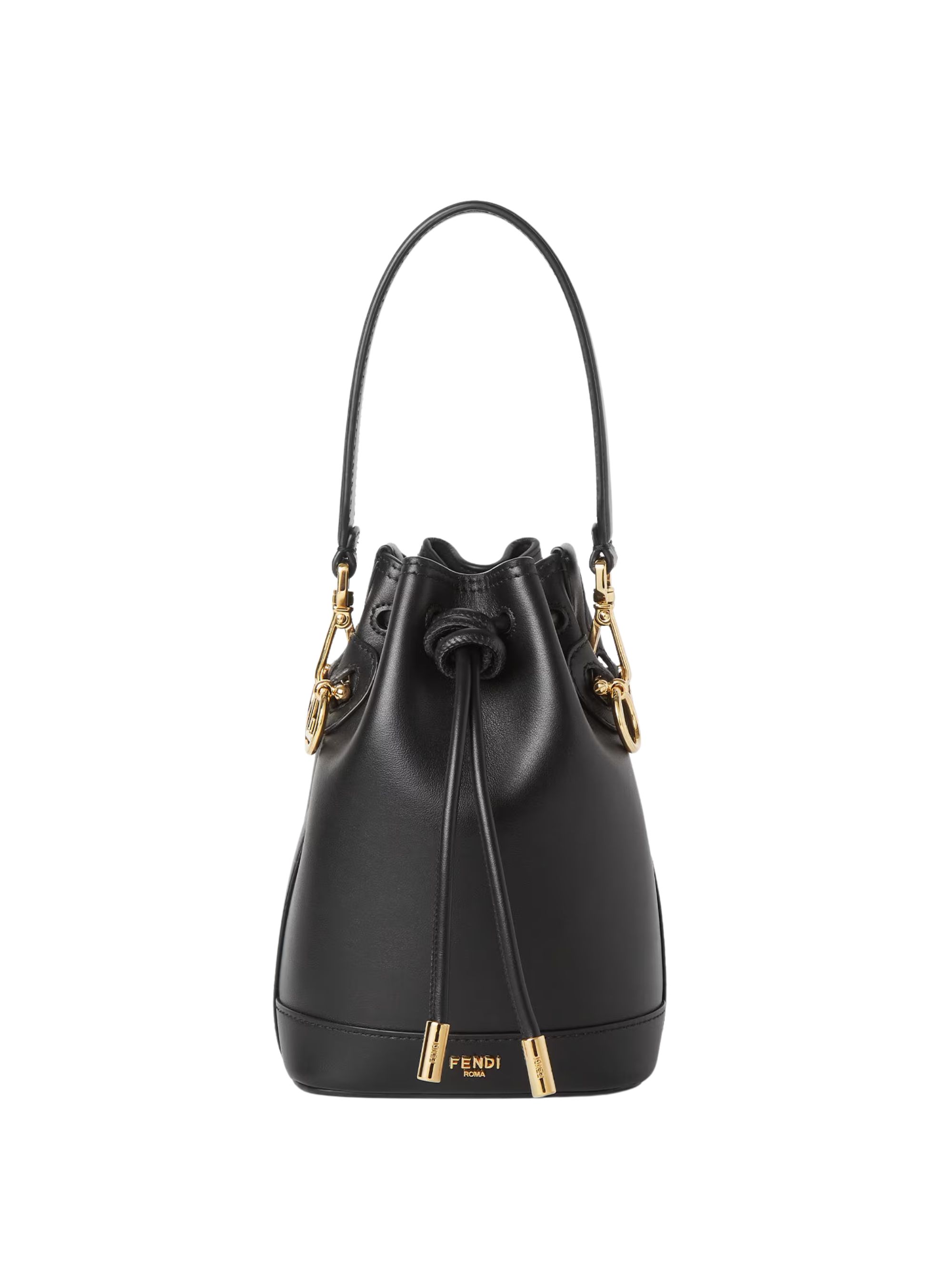 FENDI Mon Tresor mini bucket bag in black leather, featuring a handle, adjustable and removable shoulder strap, and a knotted drawstring with gold-tone metal hardware. Dimensions: 19 x 11 x 13.5 cm.