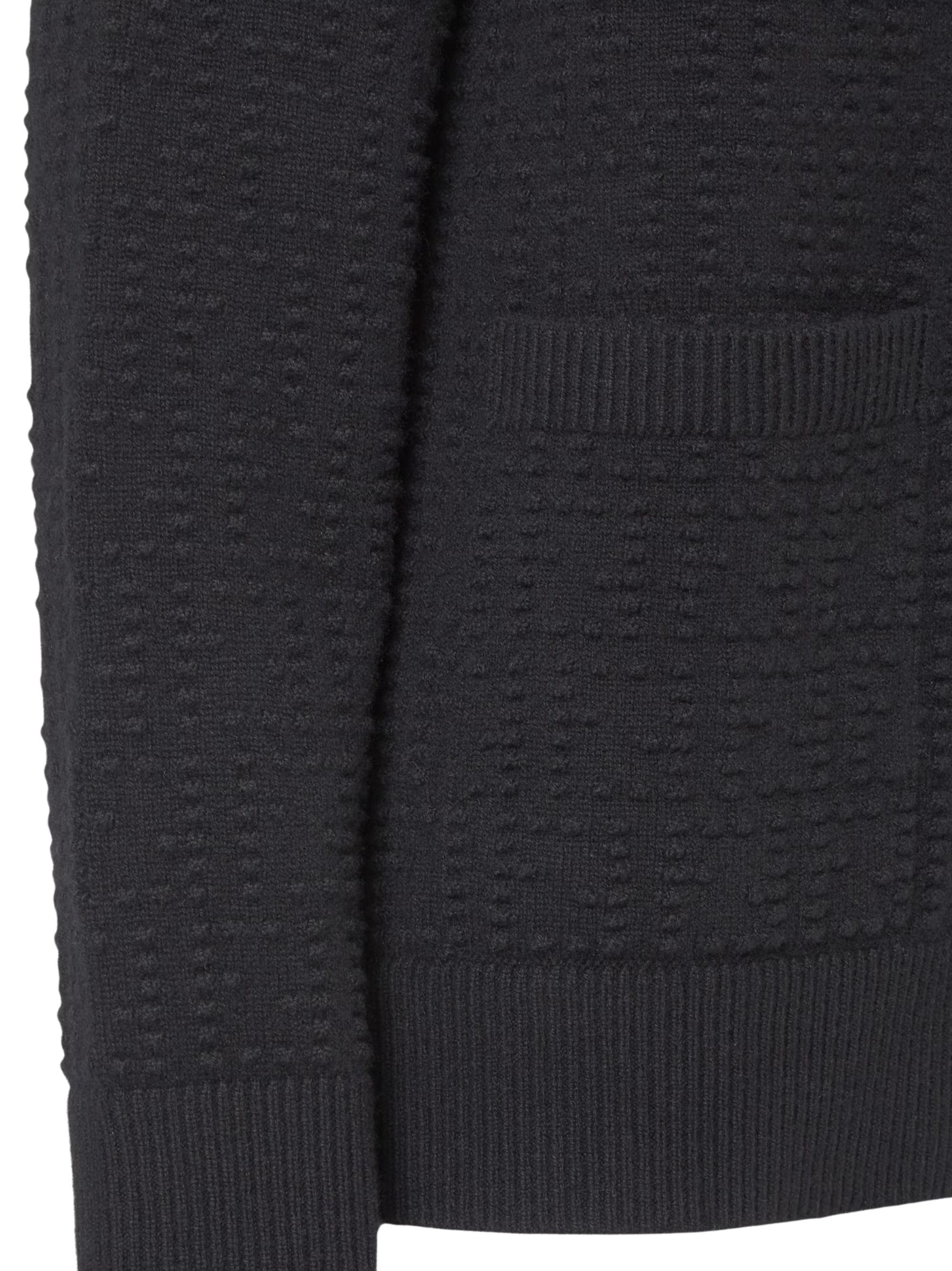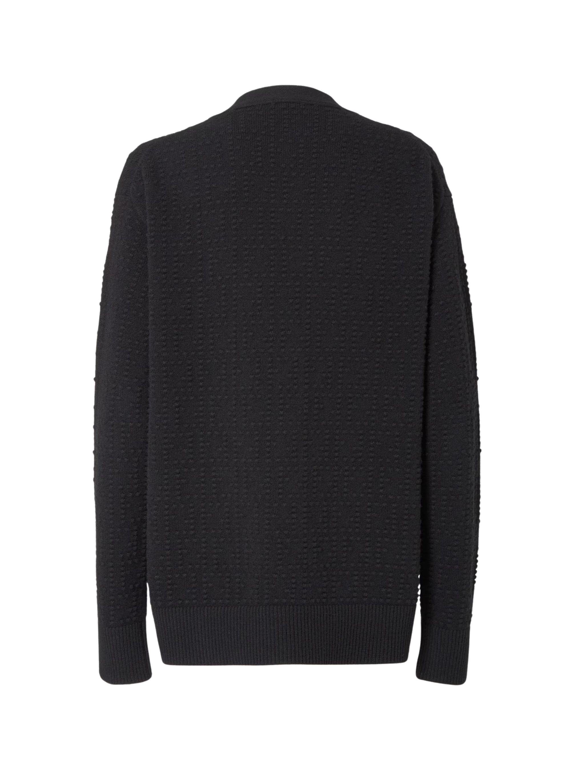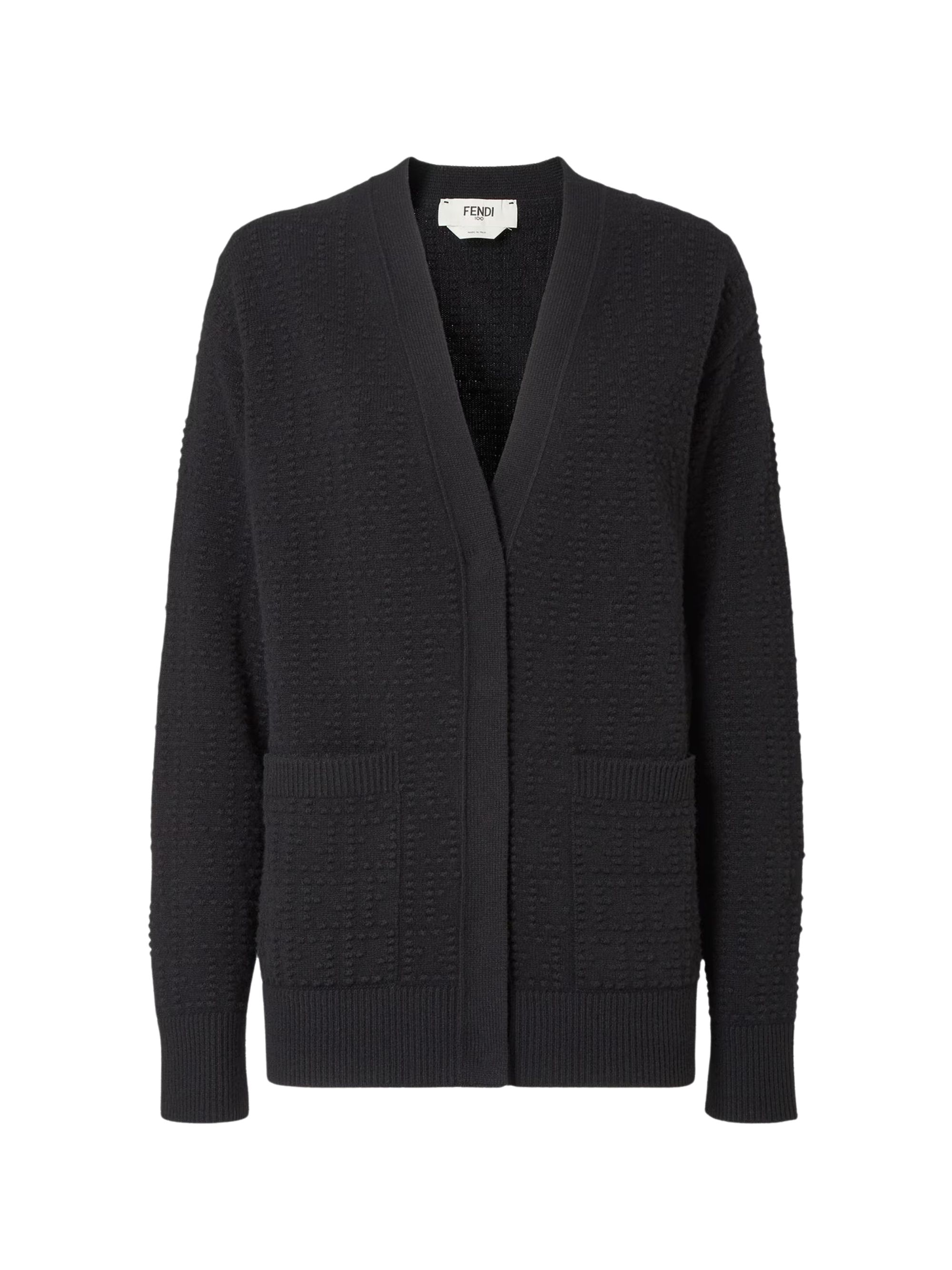 Oversized V-neck cardigan by FENDI in black wool and cashmere, featuring a tone-on-tone FF motif, polka dot embroidery, button fastening and ribbed edges.