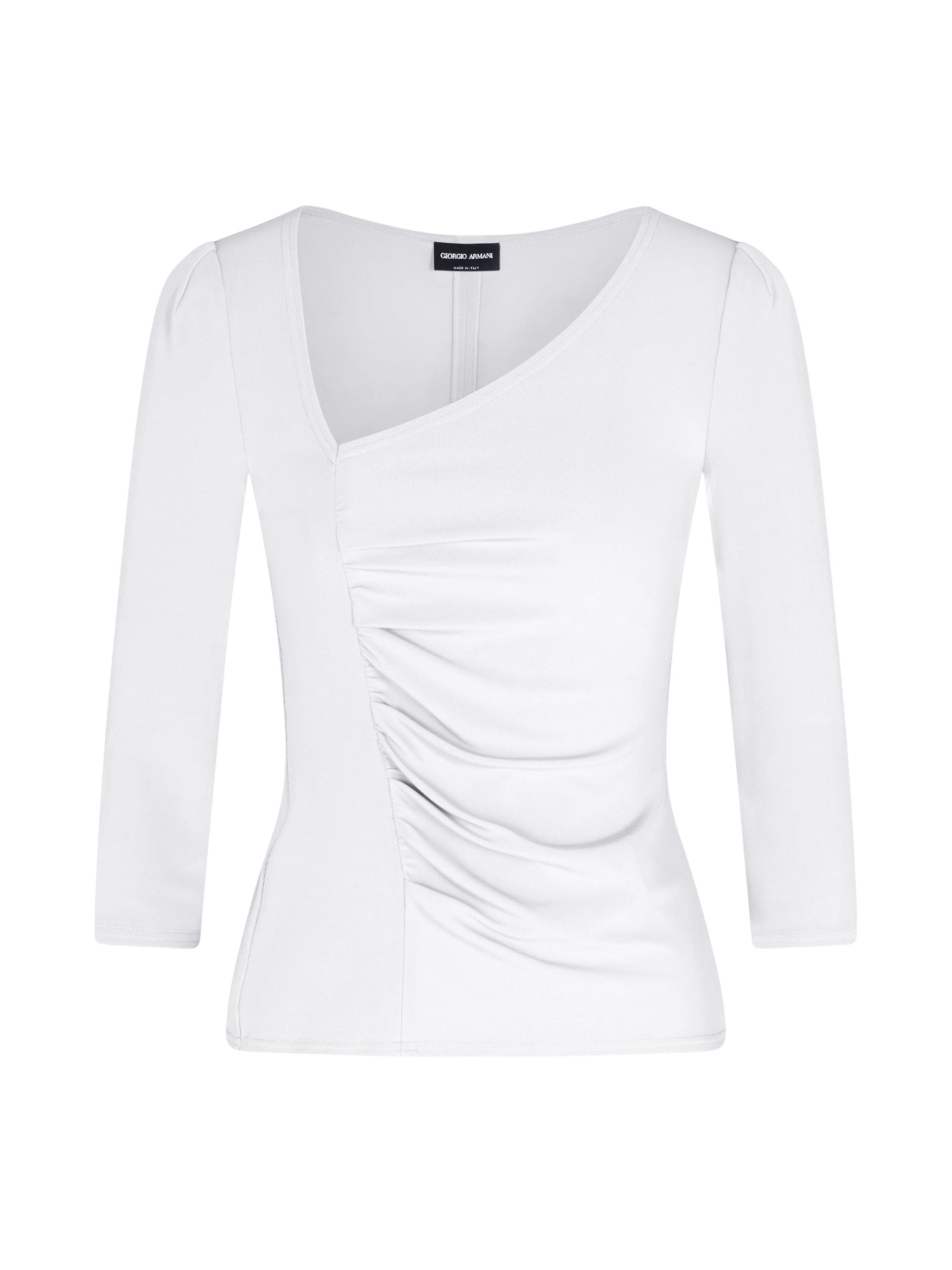 GIORGIO ARMANI white asymmetric neck sweater in viscose jersey, featuring three-quarter sleeves, side draping and a back zip fastening.