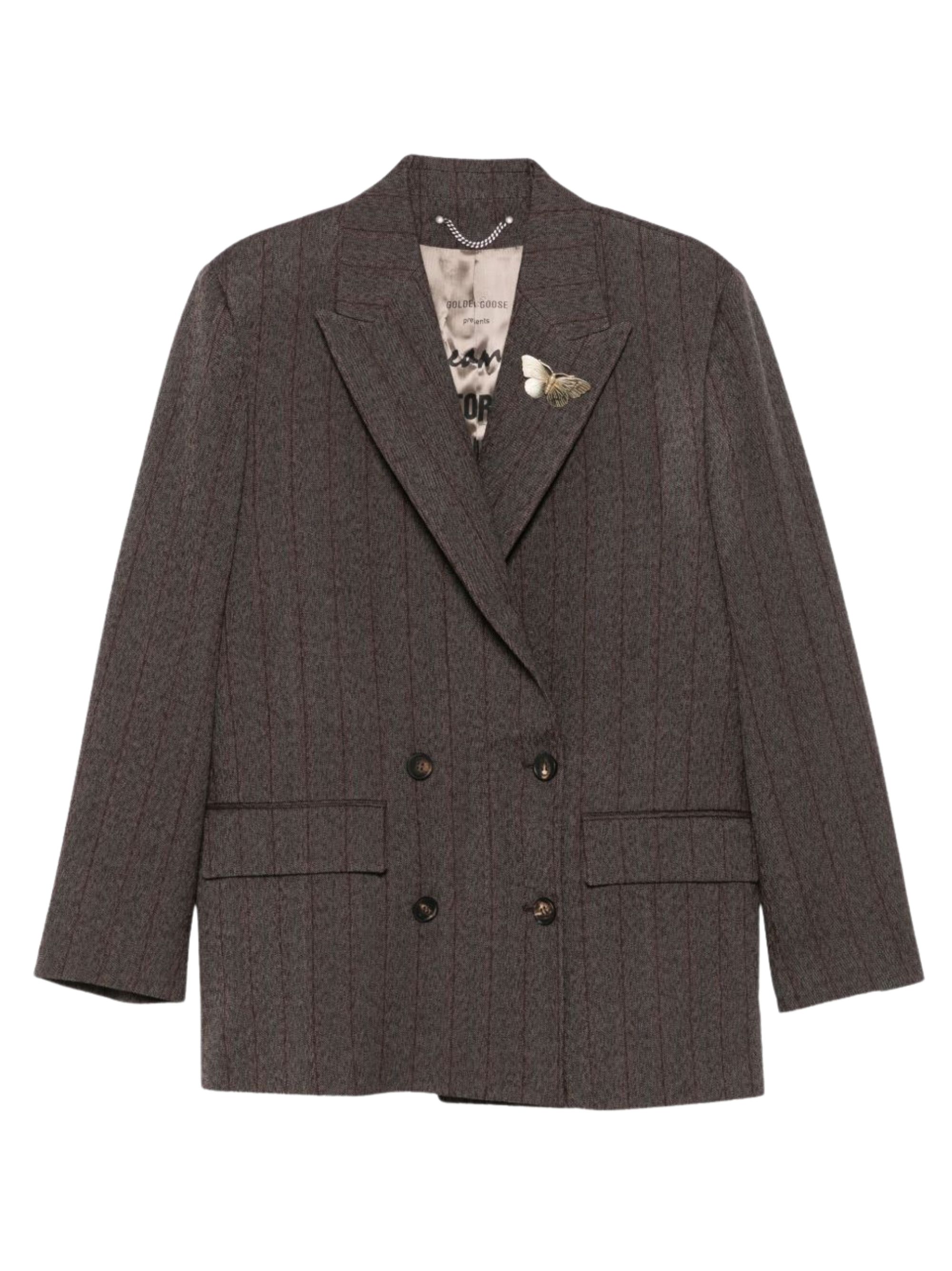 Tailored pinstripe blazer by GOLDEN GOOSE in brown wool, featuring double-breasted fastening, flap pockets and butterfly decoration.
