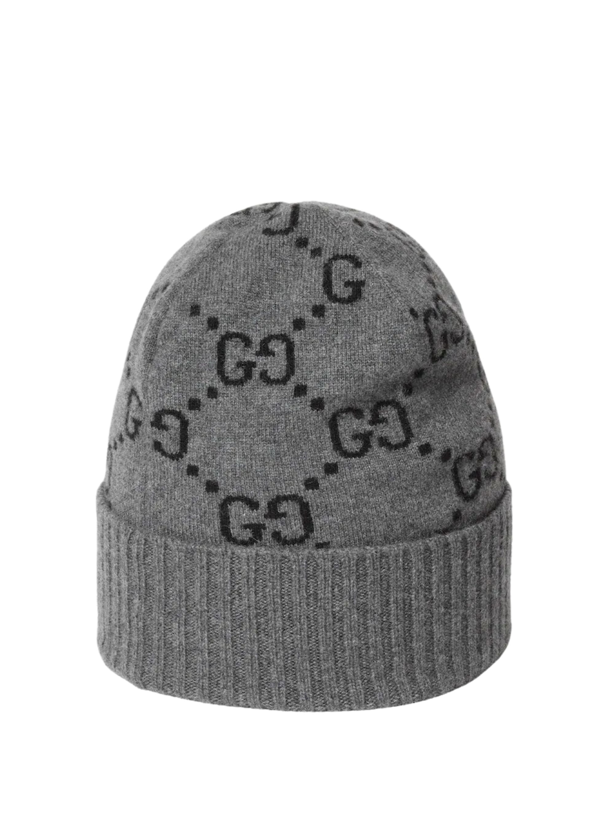GUCCI GG cashmere hat in grey, featuring a black GG motif and ribbed trims.