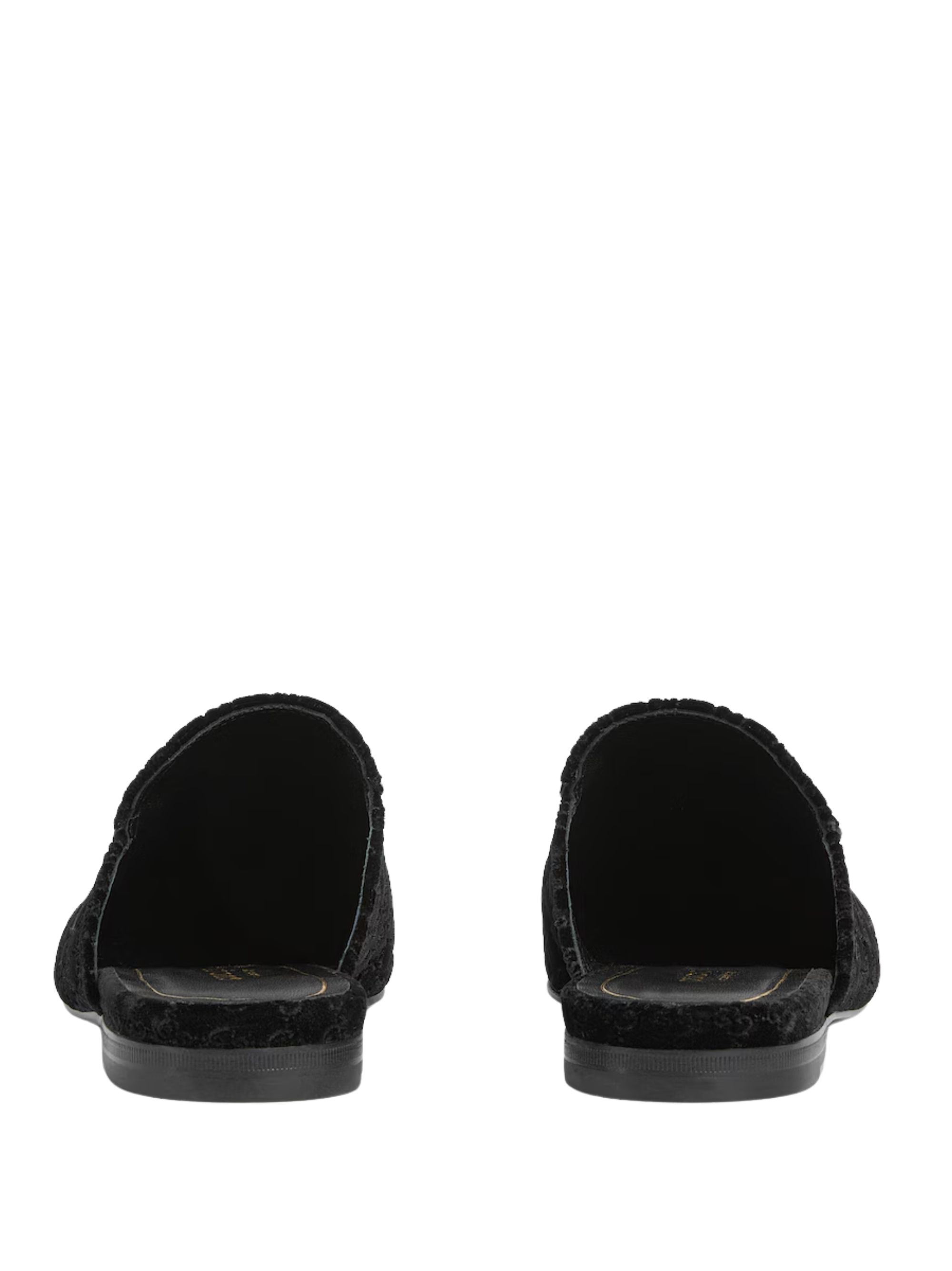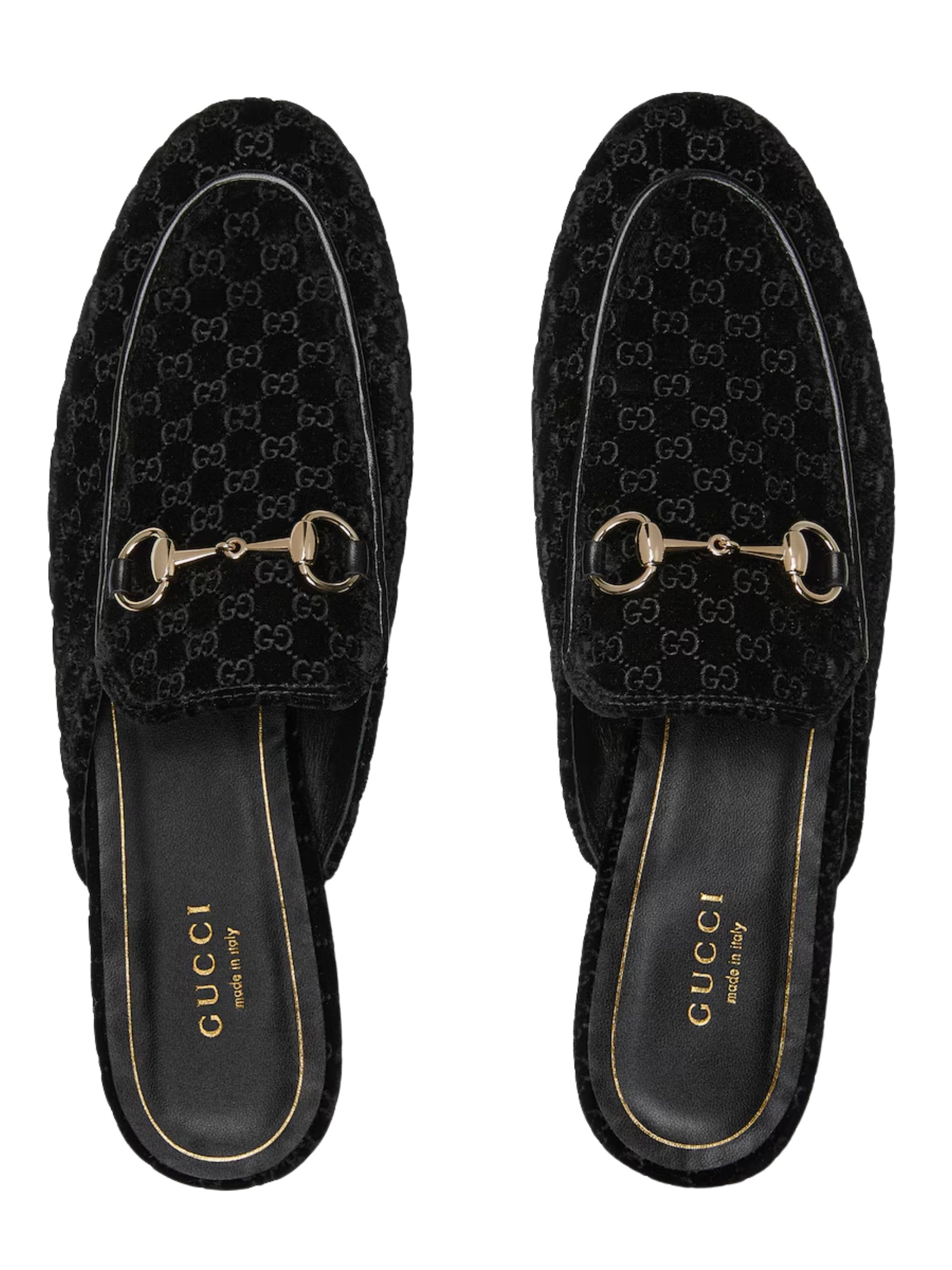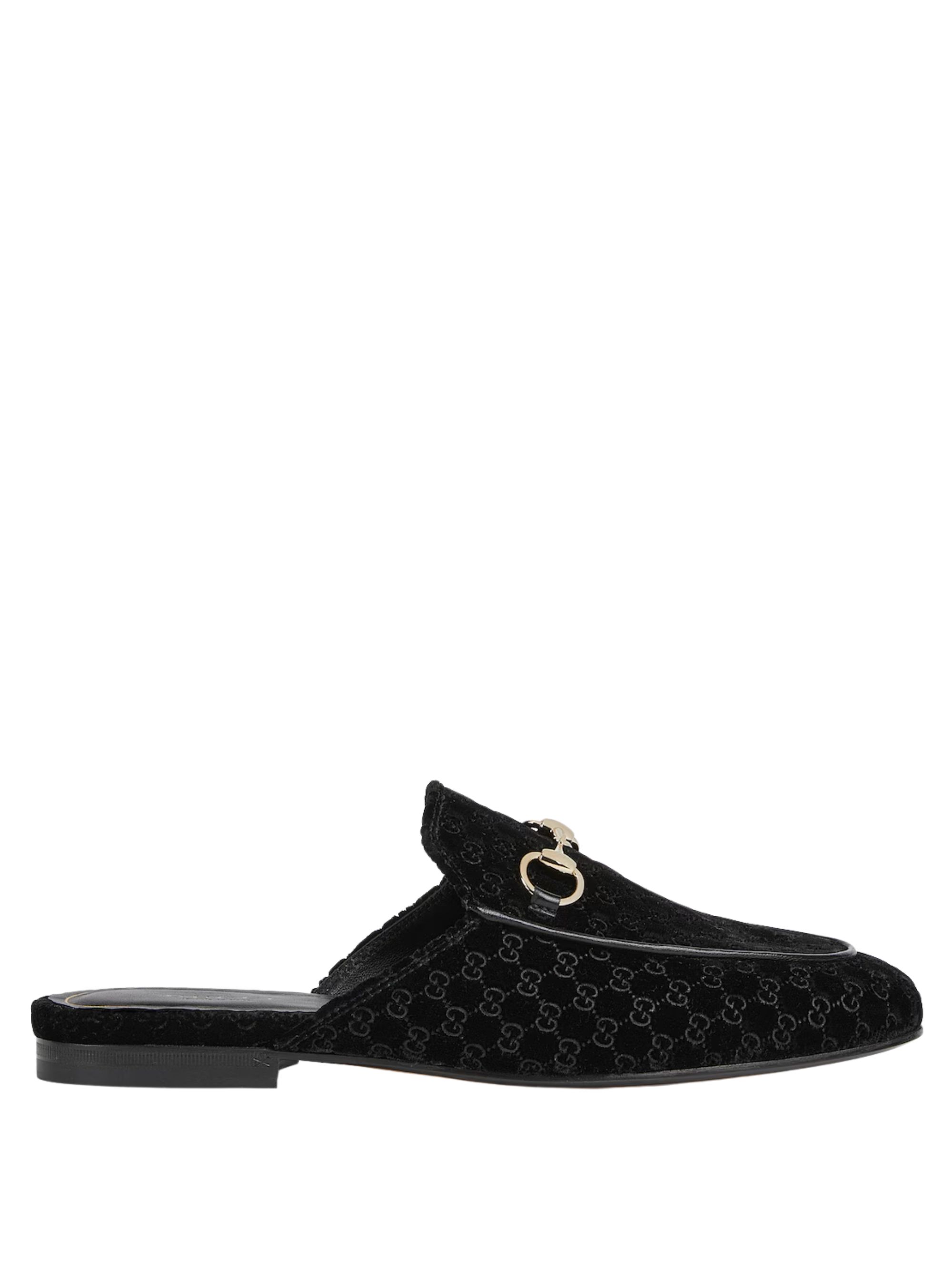 GUCCI Princetown slipper in black GG velvet, featuring light gold-tone hardware, a stud, a leather sole and a low-cut design.