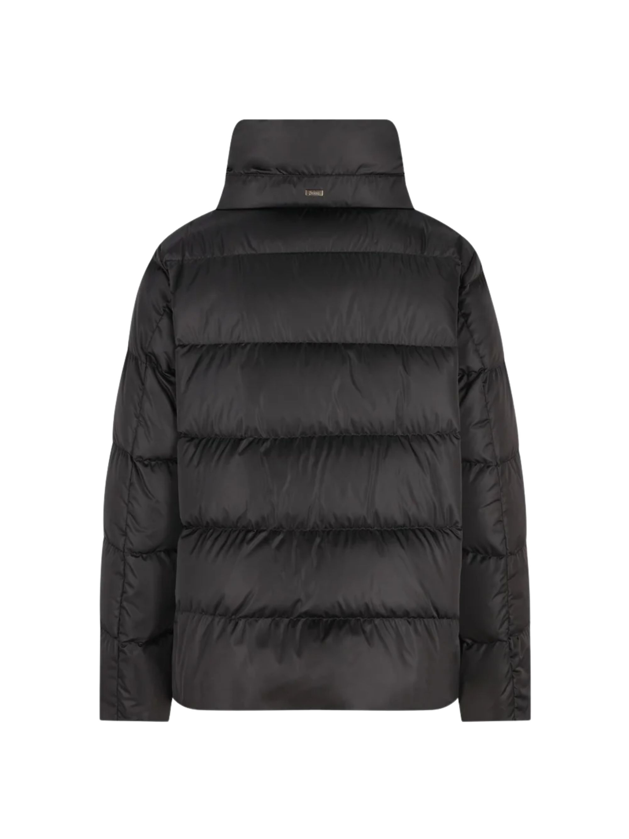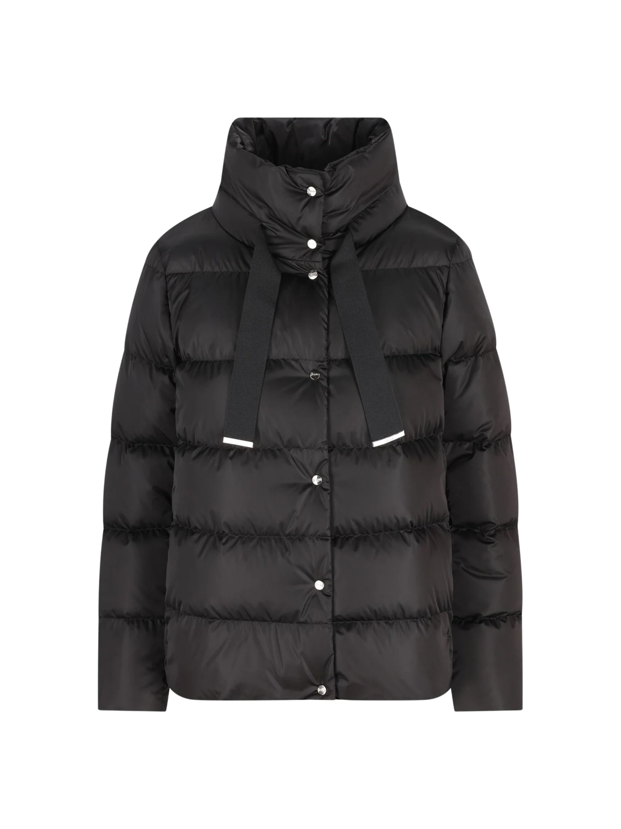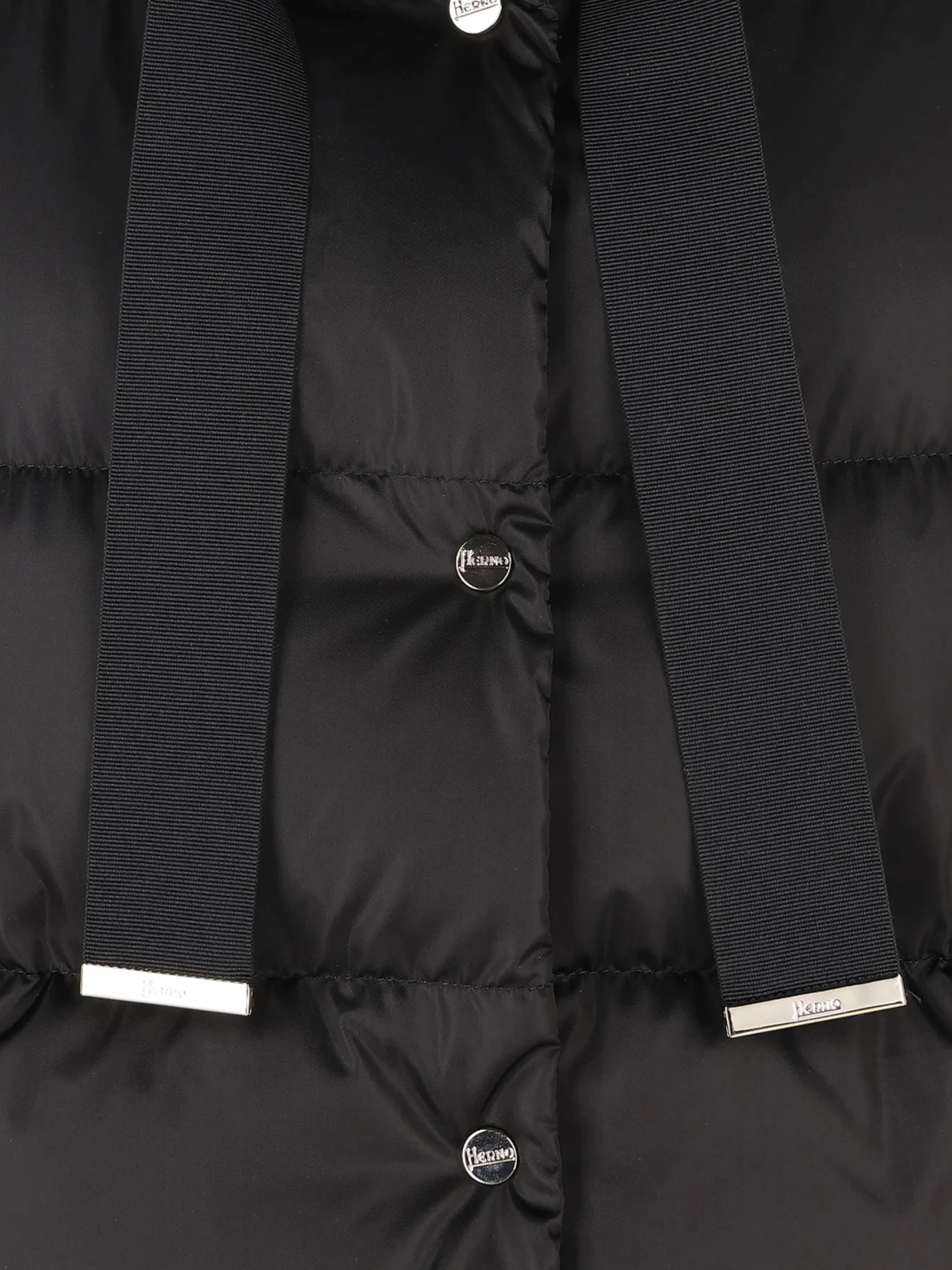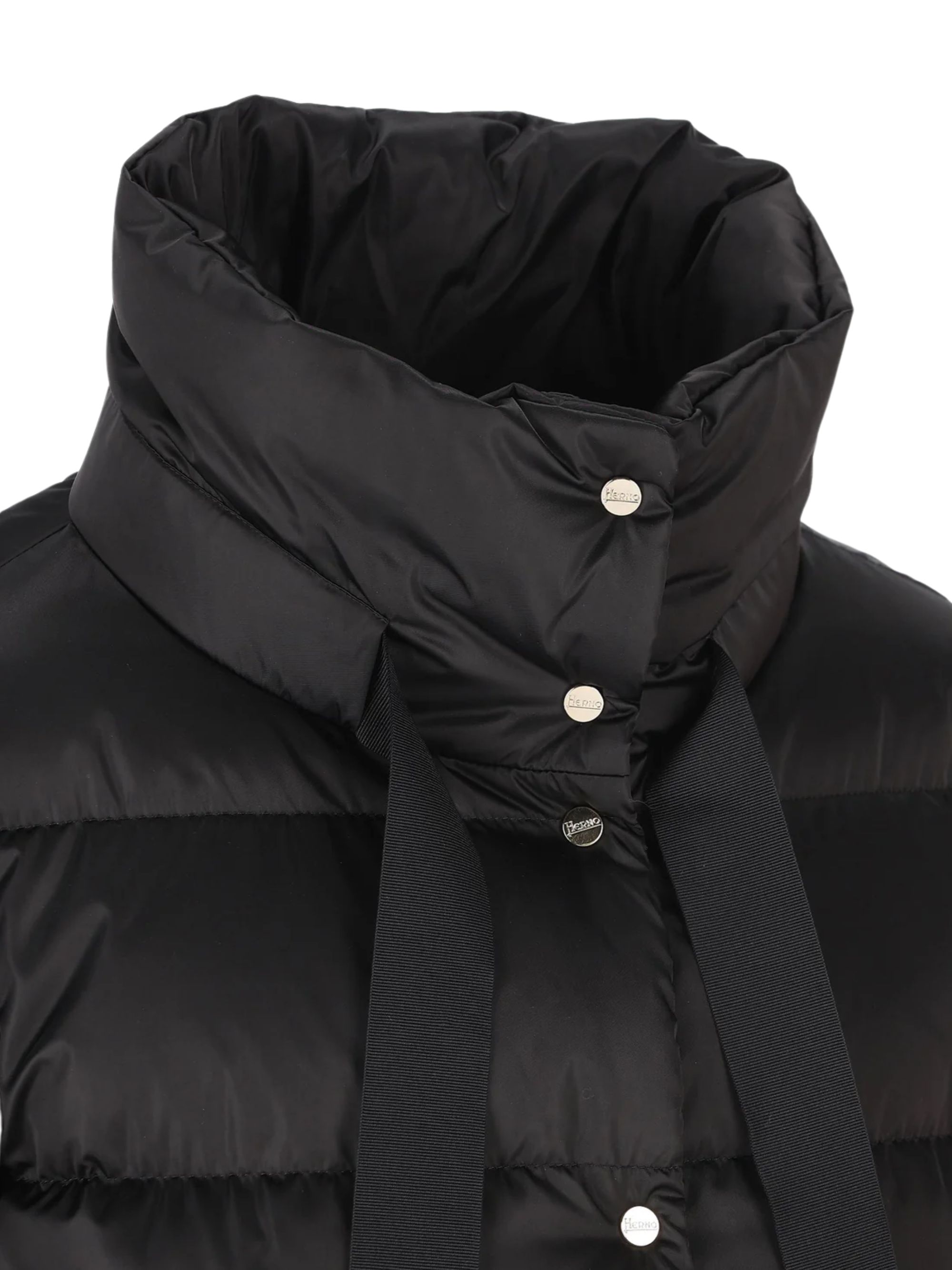 Black satin cape down jacket by HERNO, featuring a high collar with grosgrain drawstring, logoed metal button fastening, welt pockets and goose down padding.