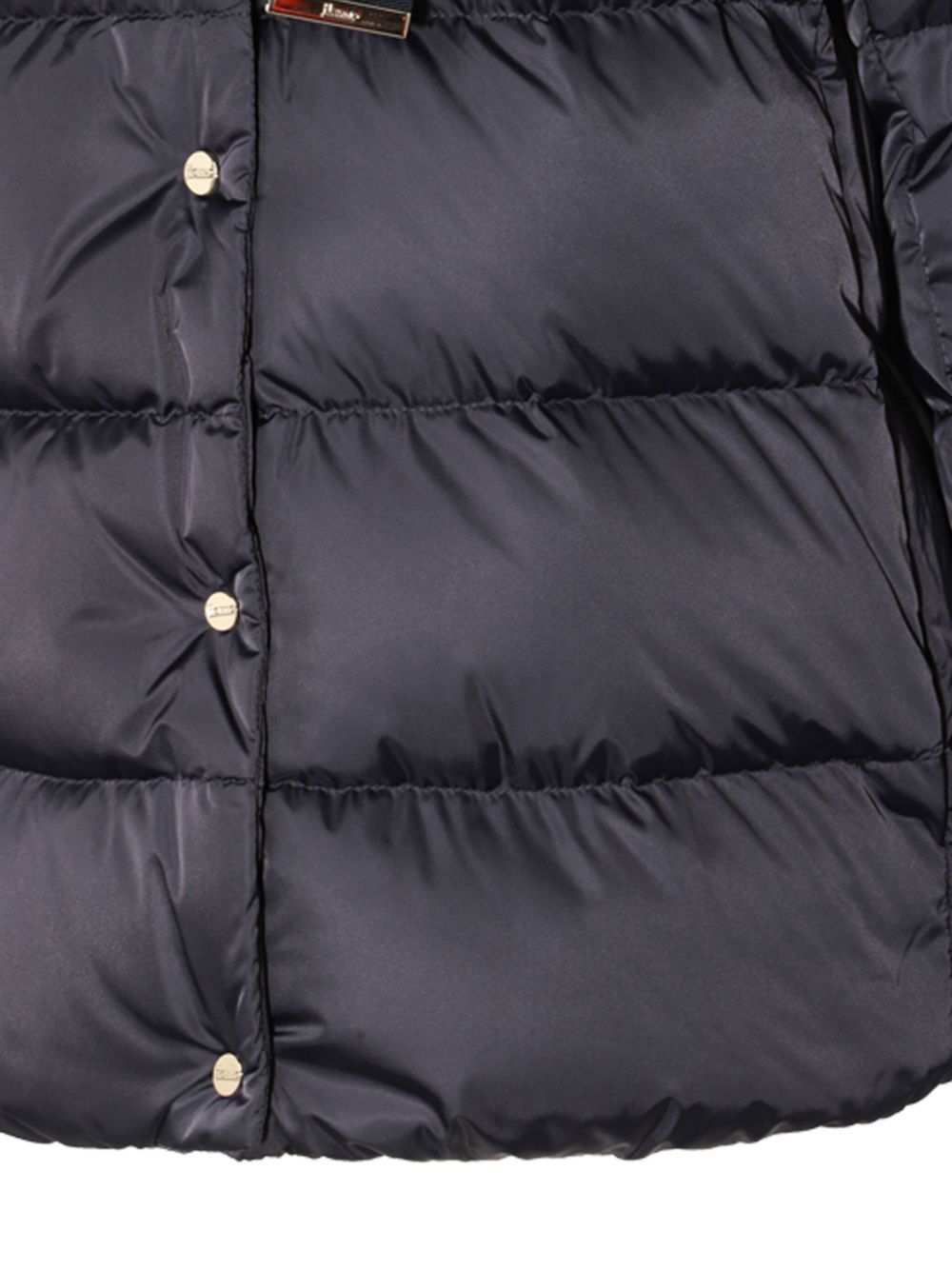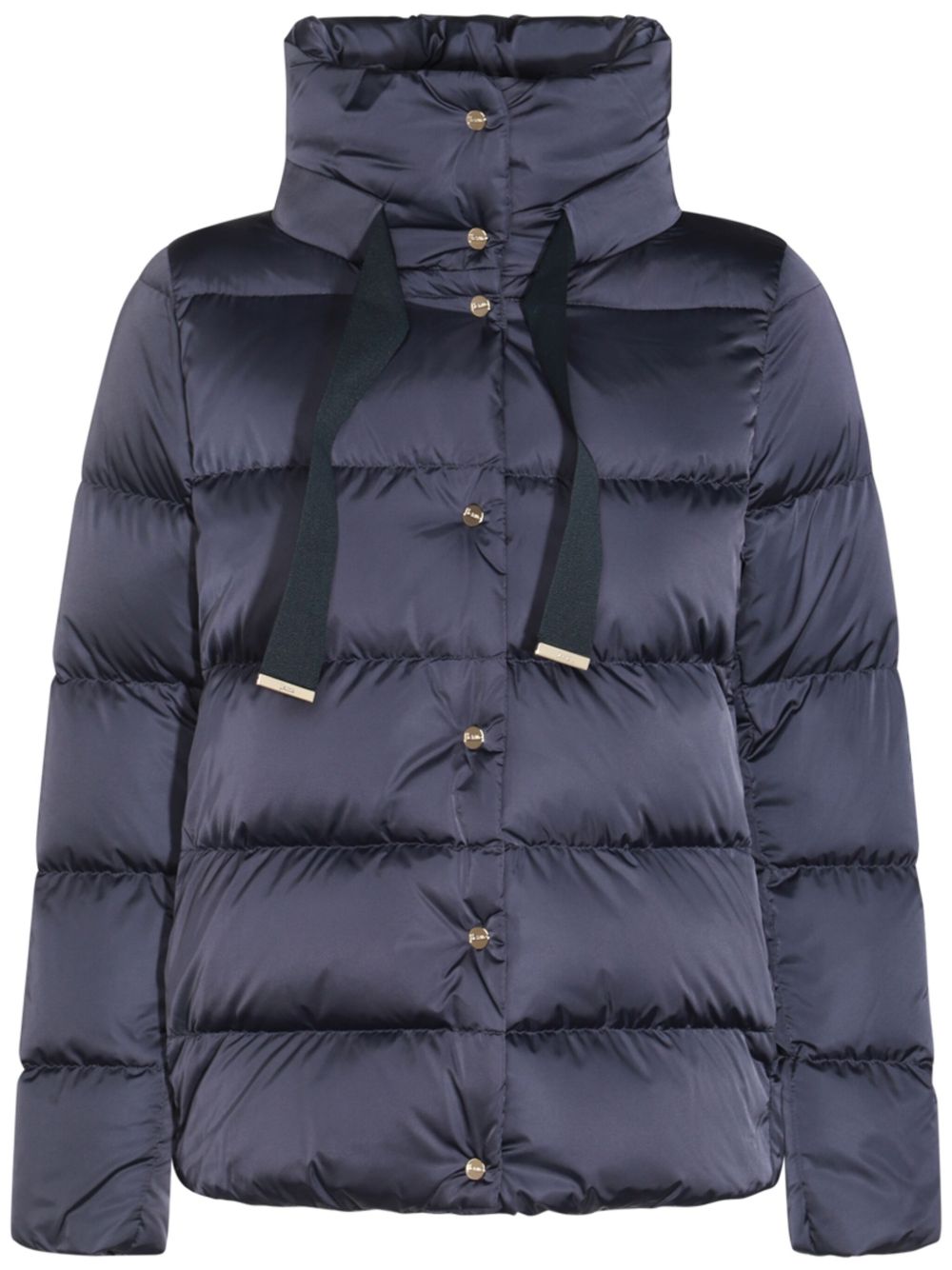 HERNO blue padded satin down jacket featuring a snap button fastening, high collar, drawstring at the neck, two side slit pockets and a straight hem.