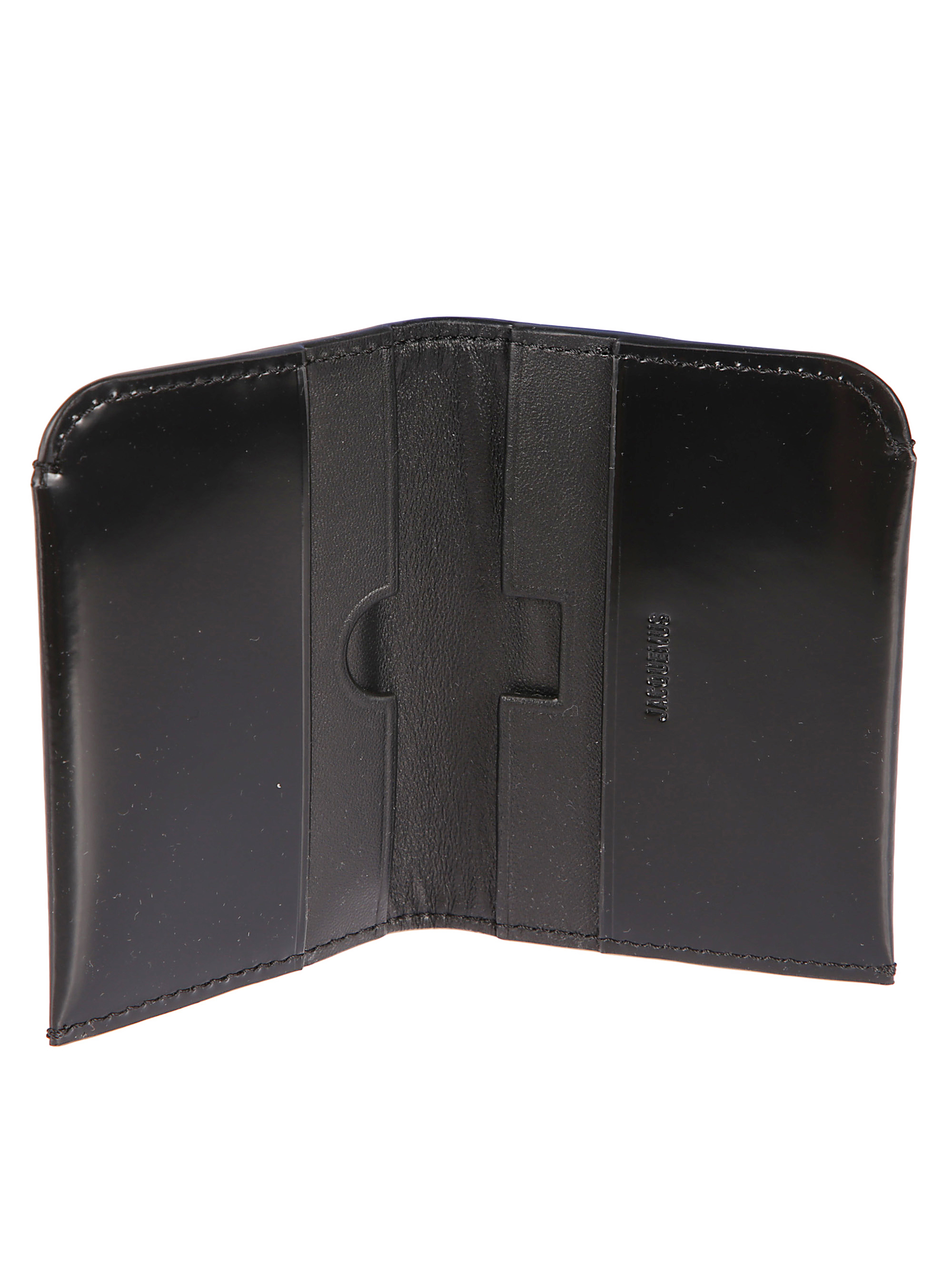 JACQUEMUS logo bifold card holder in black shiny leather, featuring internal card slots.