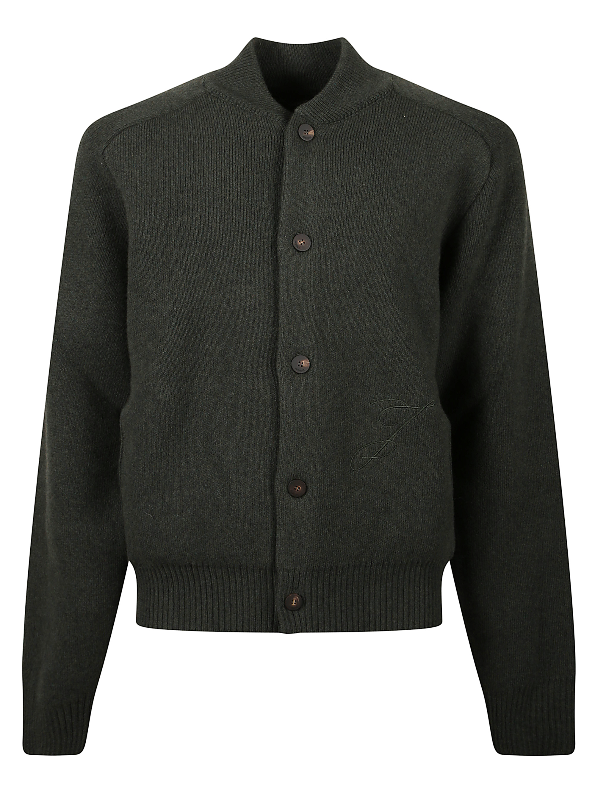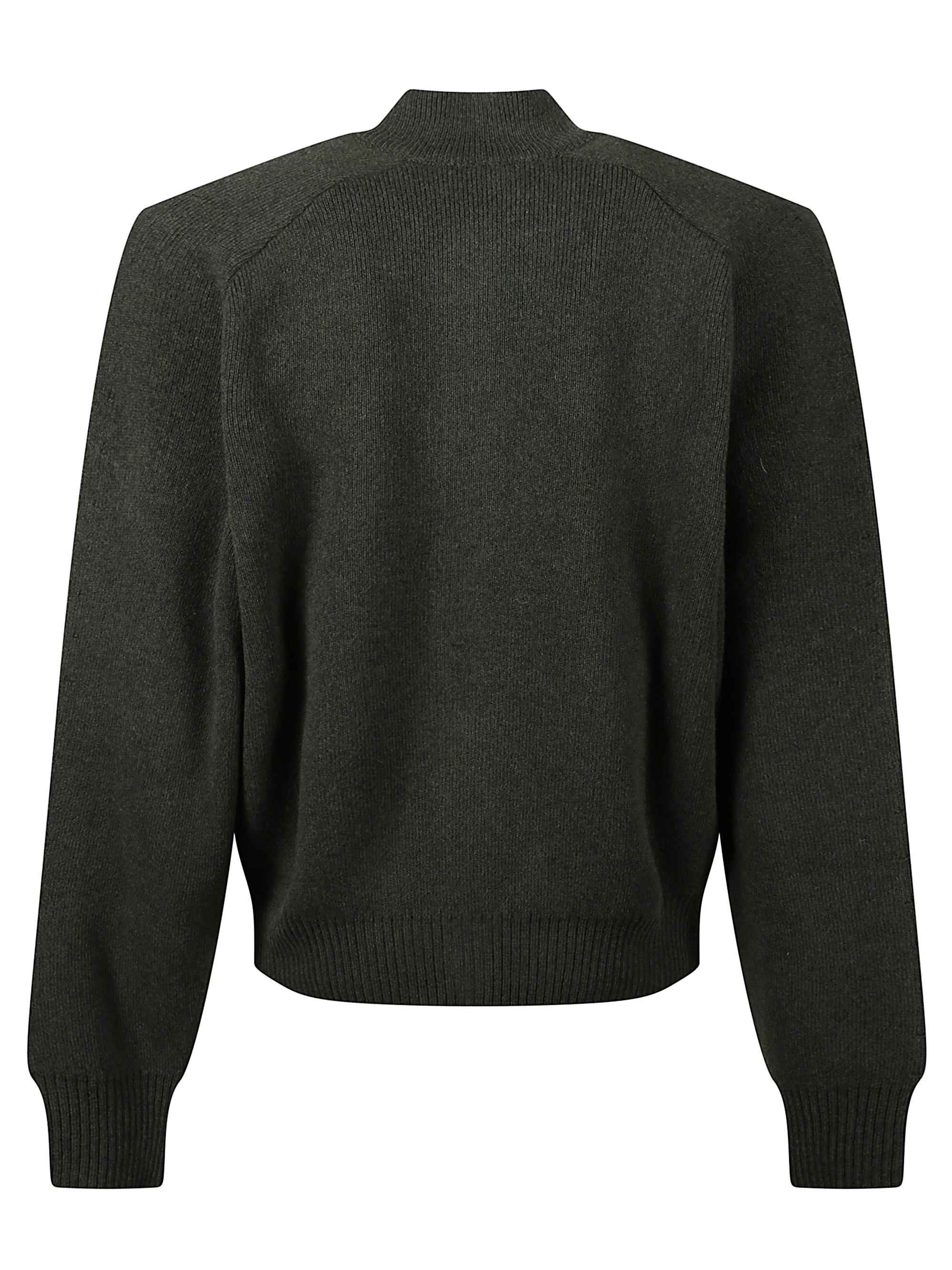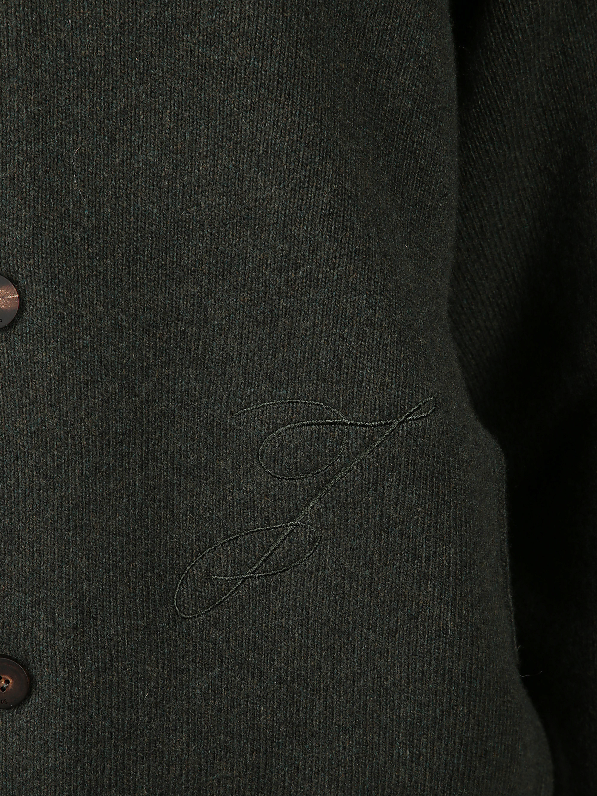 Pallone cardigan by JACQUEMUS in khaki virgin wool and cashmere, featuring an oversized fit, ribbed collar, wide raglan sleeves with fitted cuffs, ribbed cuffs and hem, J embroidered at the waist and horn buttons.
