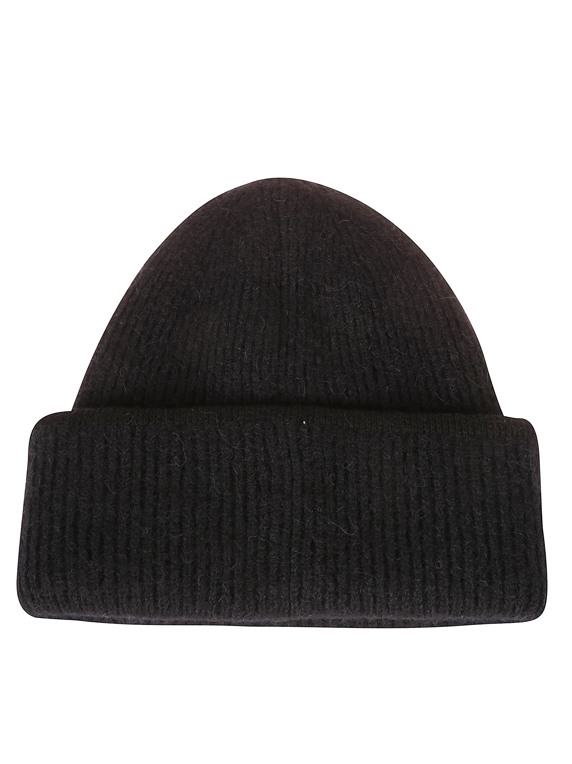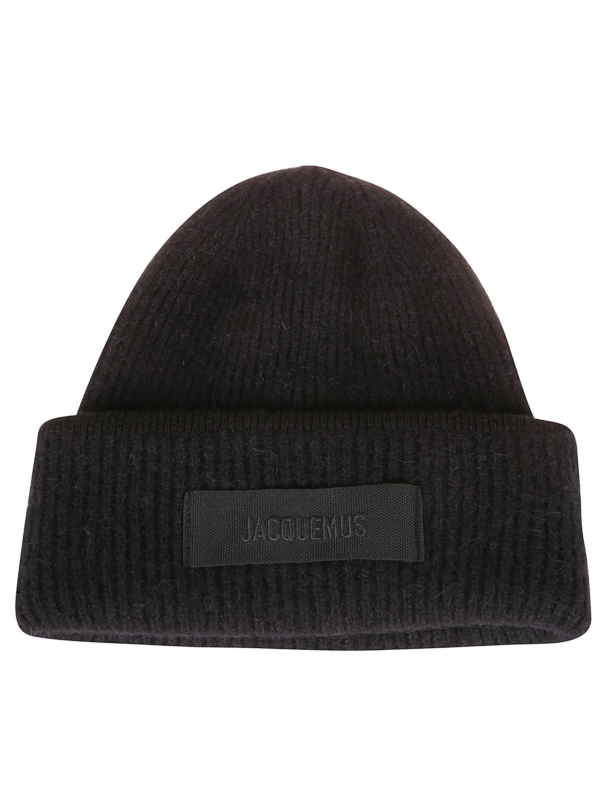 JACQUEMUS La Croisiere Gros Grain Beanie in black wool and alpaca blend, featuring an adjustable fit, ribbed knit, a tone-on-tone grosgrain logo patch embroidered on the front and a reinforced tone-on-tone edge.