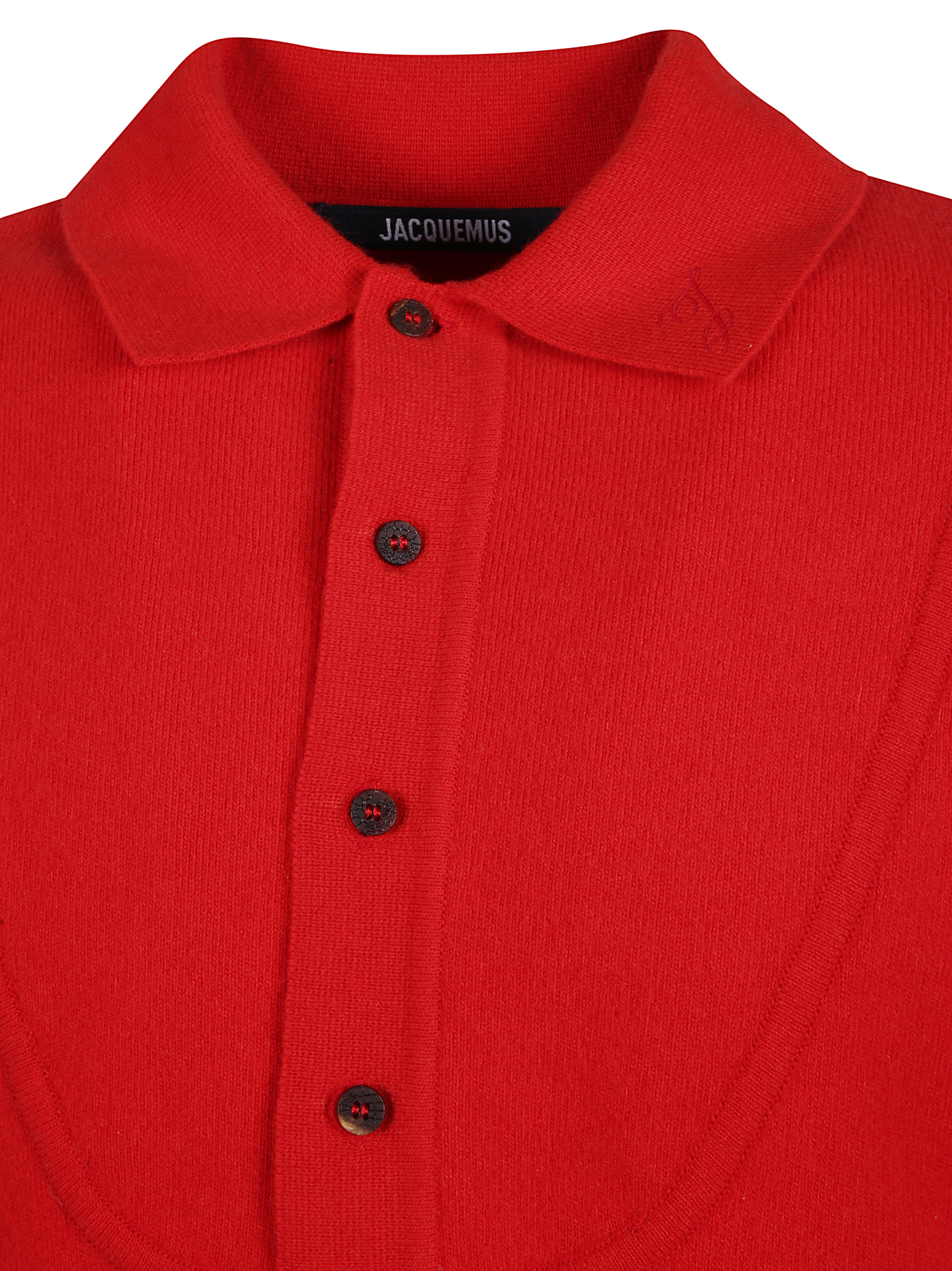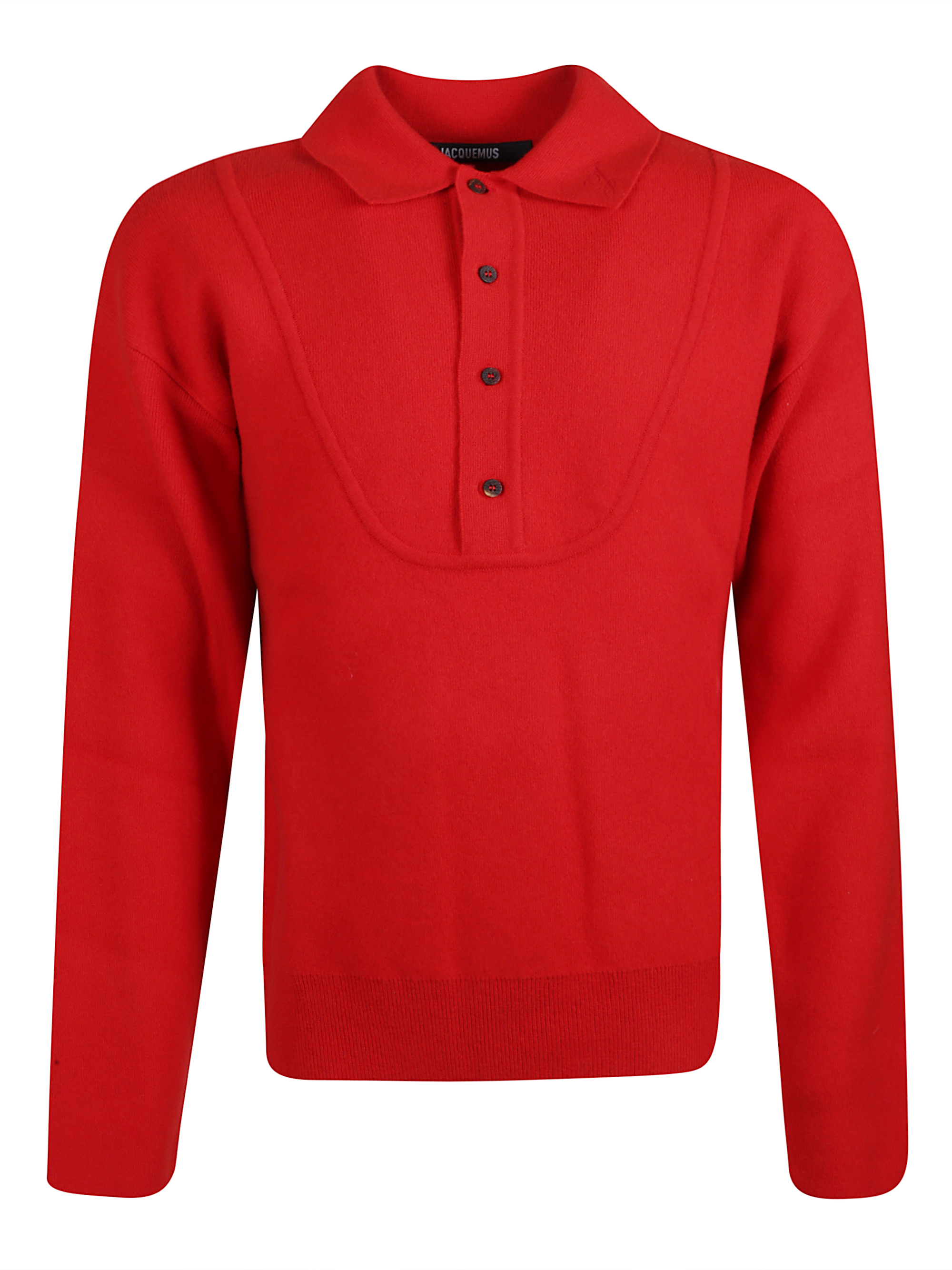 La Maille Vereuse Pallone sweater by JACQUEMUS in red wool and cashmere, featuring a ribbed collar, cuffs and hem, a relaxed fit and a button fastening.