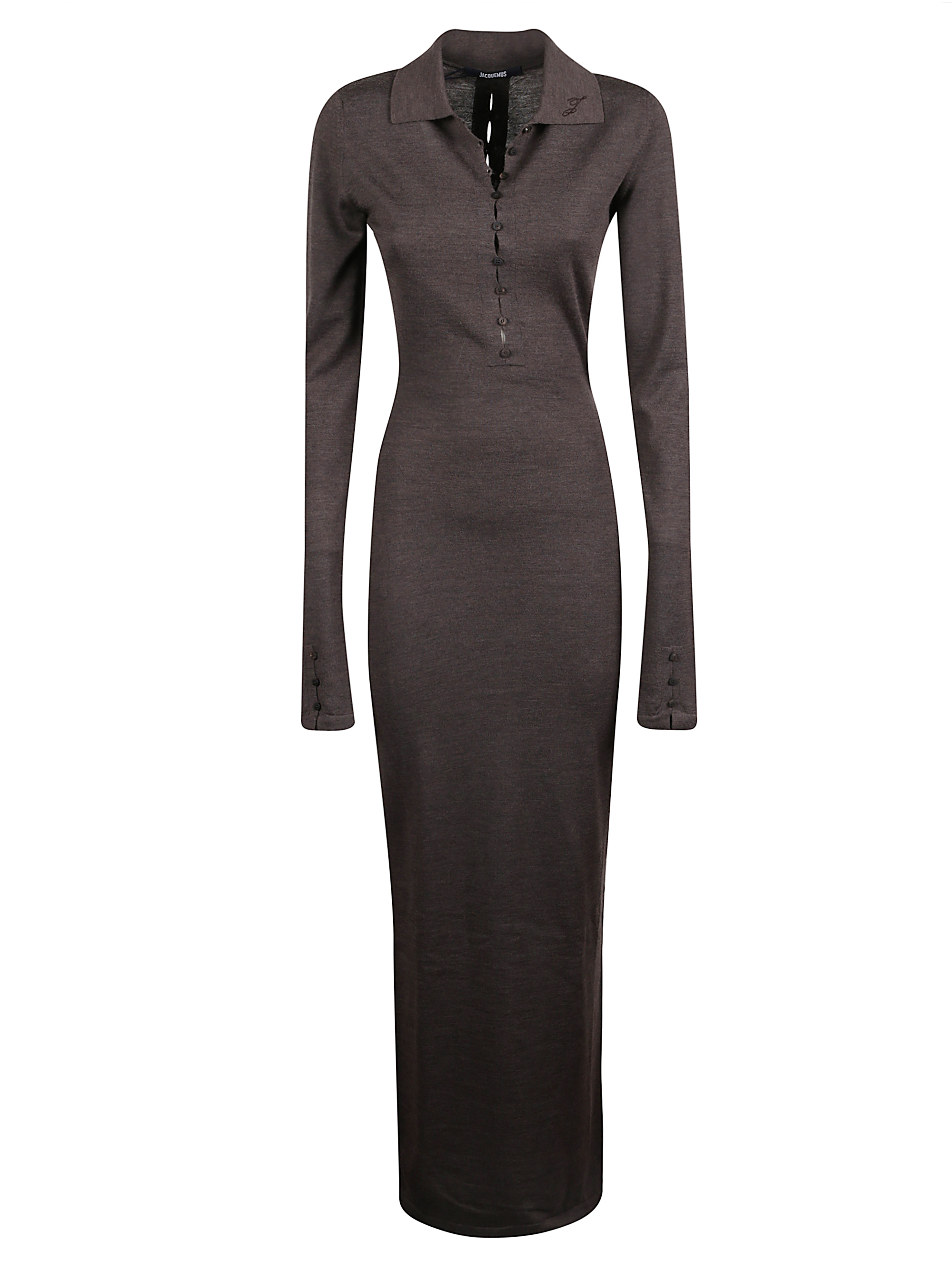 Brown Merino polo dress by JACQUEMUS in knitted fabric, featuring an embroidered J on the collar, elongated open buttonholes and a long polo button placket.