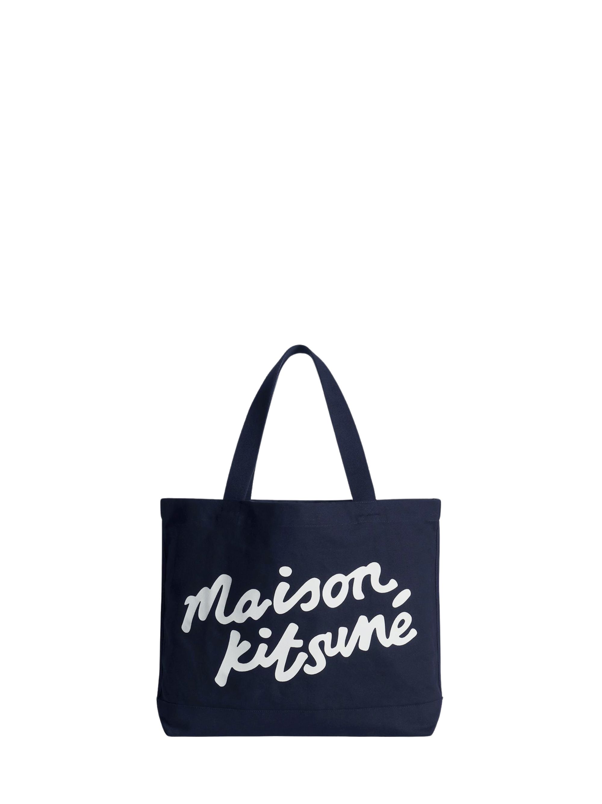 MAISON KITSUNE' blue cotton Maison Kitsuné signature print tote bag featuring a contrasting Maison Kitsuné handwritten signature on the front, main compartment, internal pocket and two long handles.