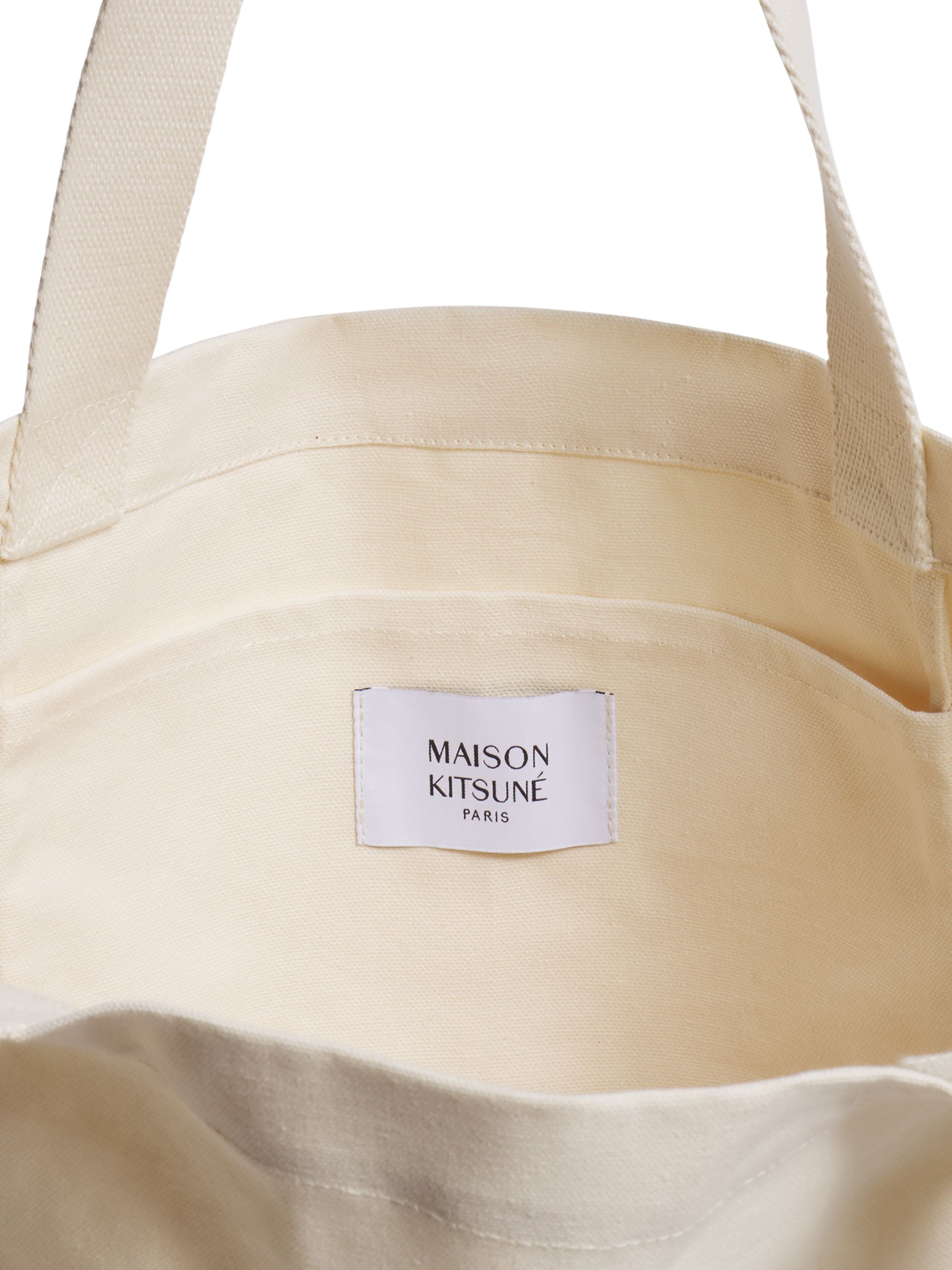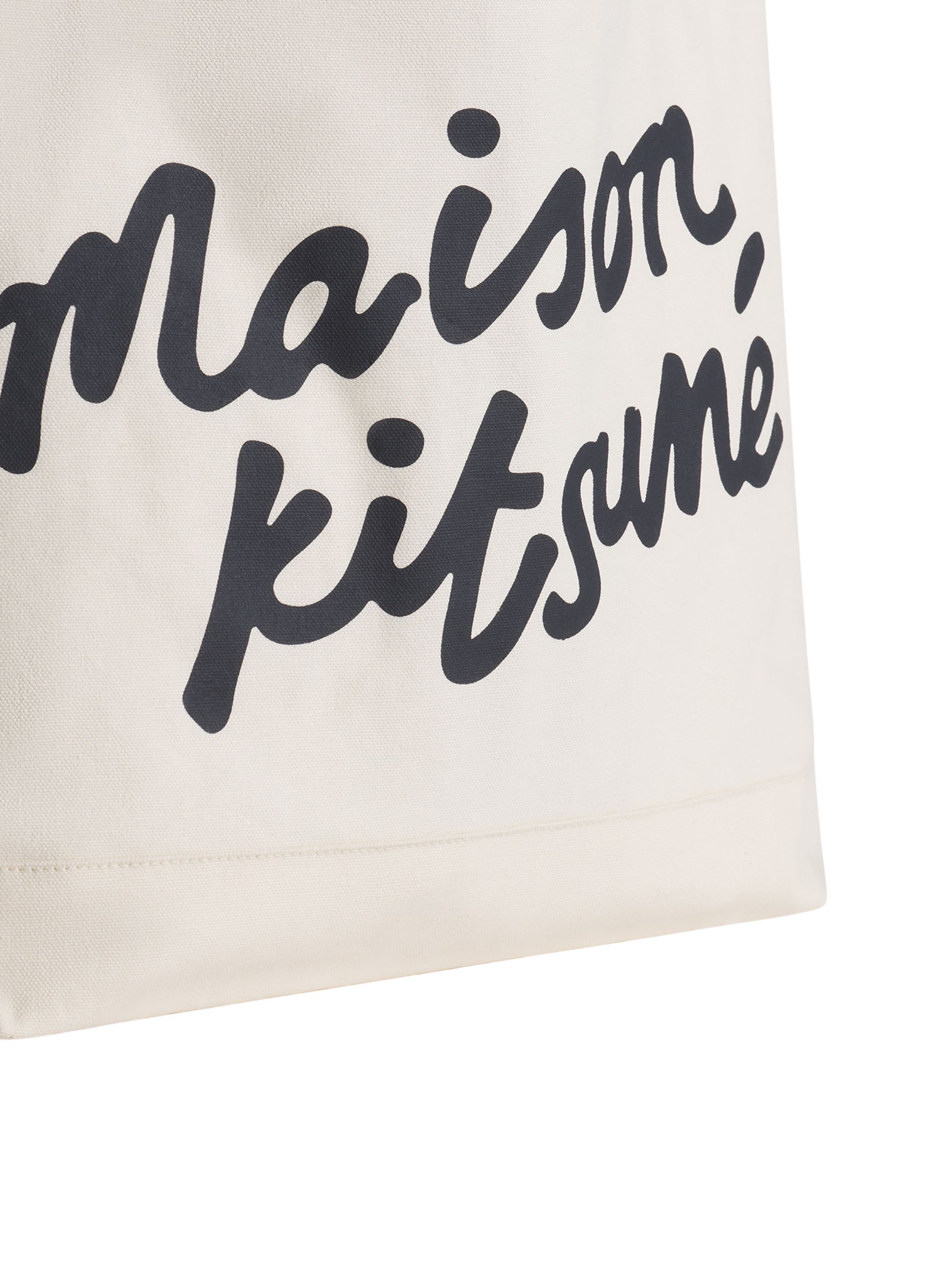 White cotton Maison Kitsuné signature print tote bag by MAISON KITSUNE' featuring a contrasting Maison Kitsuné handwritten signature on the front, main compartment, internal pocket and two long handles.