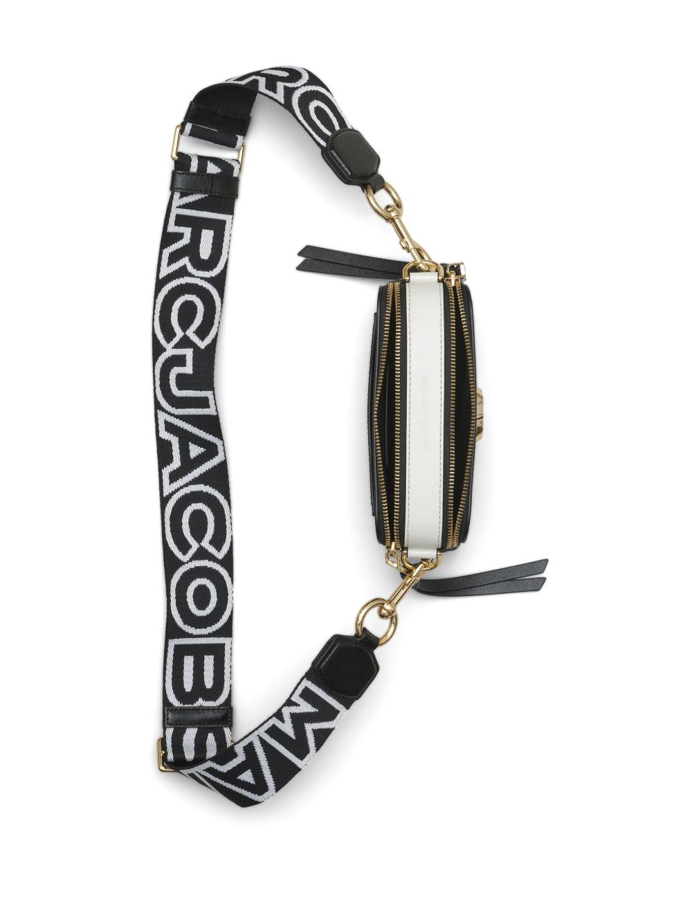 MARC JACOBS The Snapshot bag in black leather with gold hardware, a logo-embellished canvas shoulder strap, back card slots, a divided interior compartment, and a zip closure.