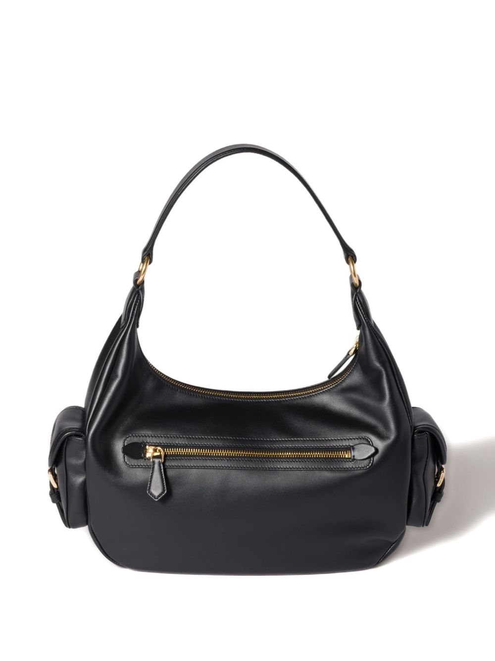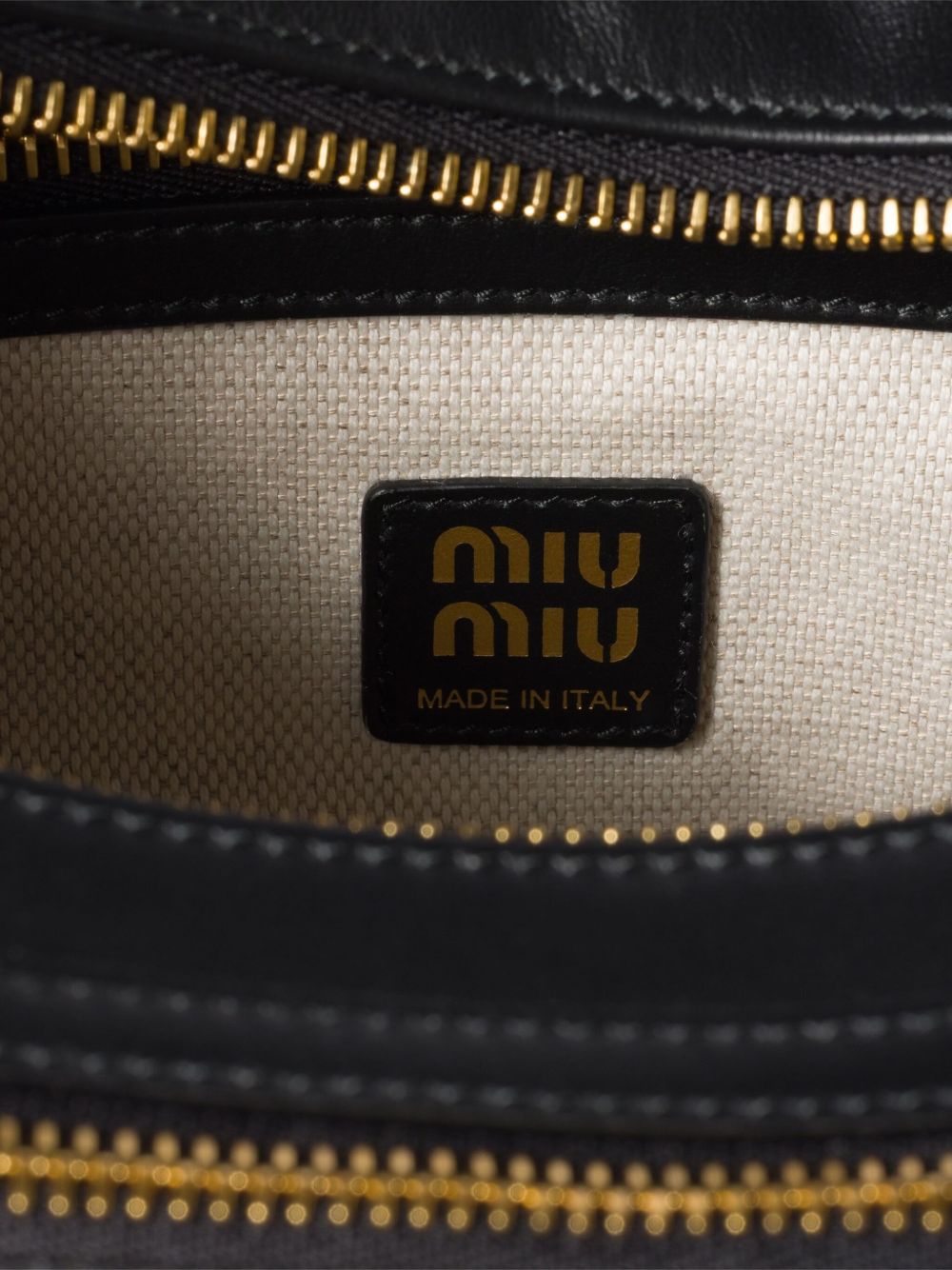 MIU MIU Pocket bag in black leather with gold hardware with handle, front zip pocket, back and side flap pockets, linen blend interior with zip pocket, embossed logo and zip closure.