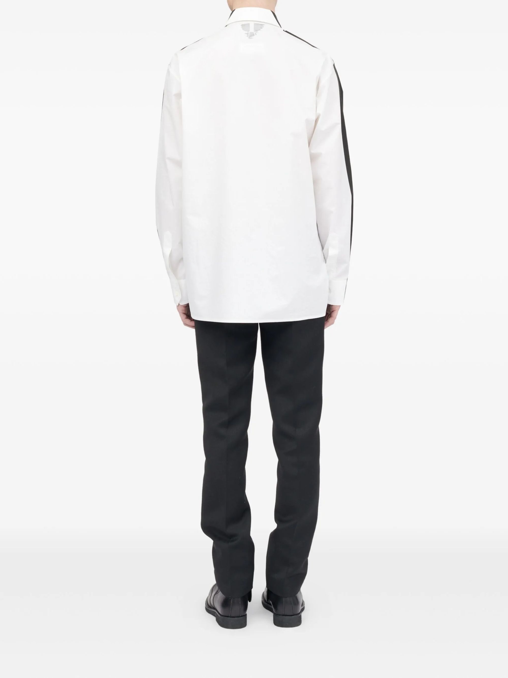 MM6 black cotton shirt with stitching detail, featuring contrasting white stitching, a pointed collar, long sleeves and two prints.