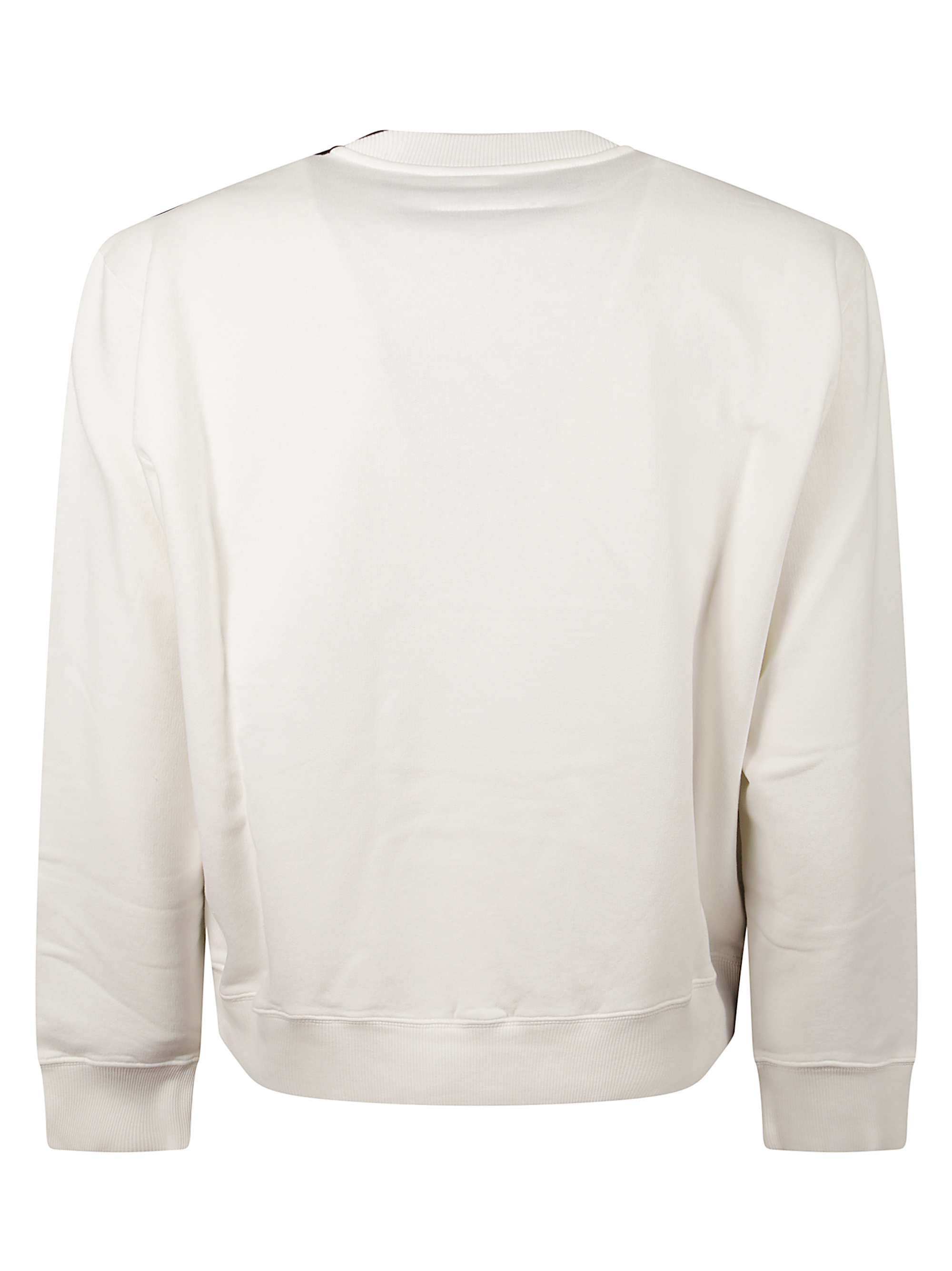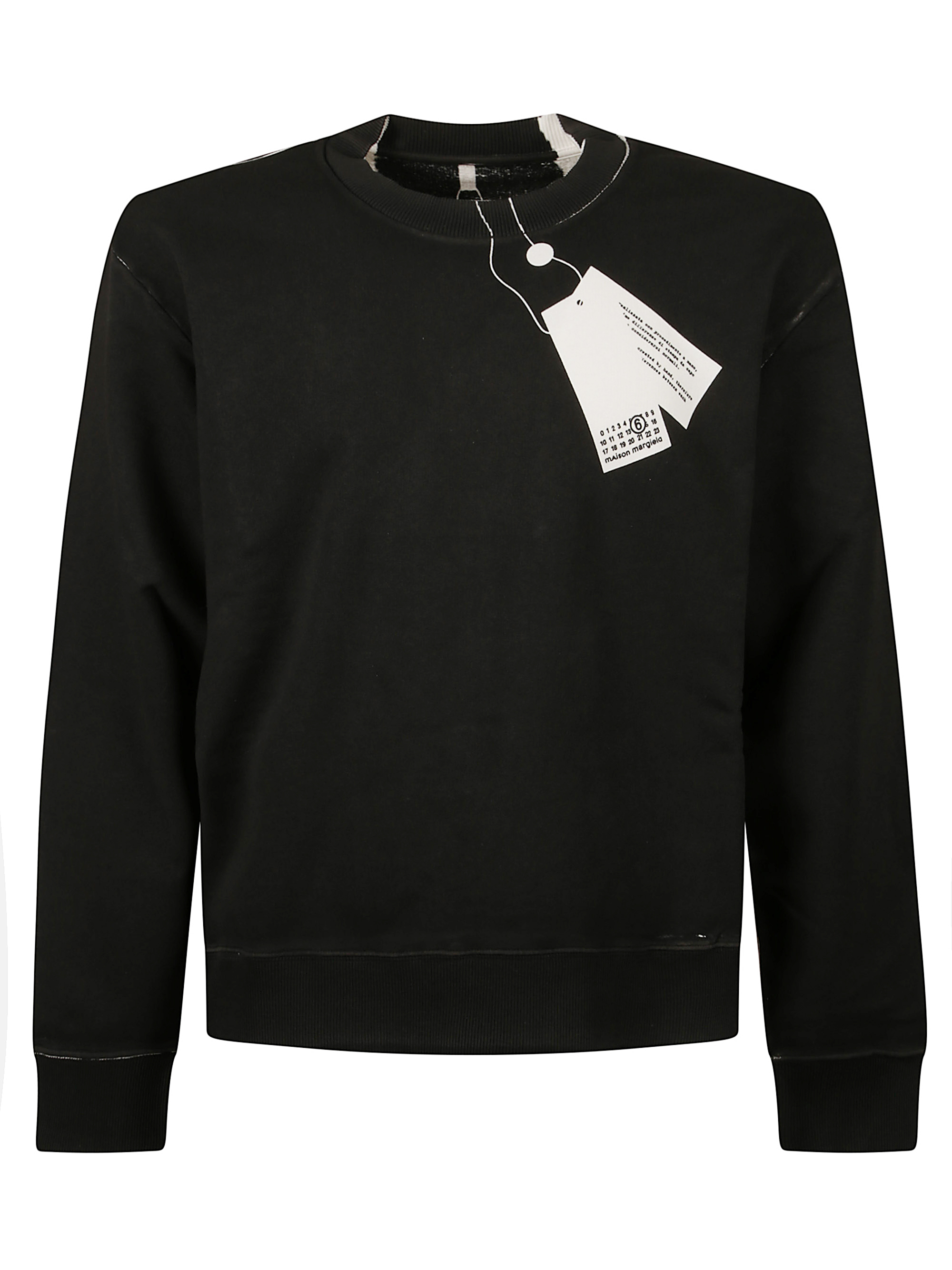 Black trompe l'oeil sweatshirt by MM6 in cotton, featuring a printed label on the front, long sleeves, raw hems, overlock seams and white MM6 topstitching on the back.