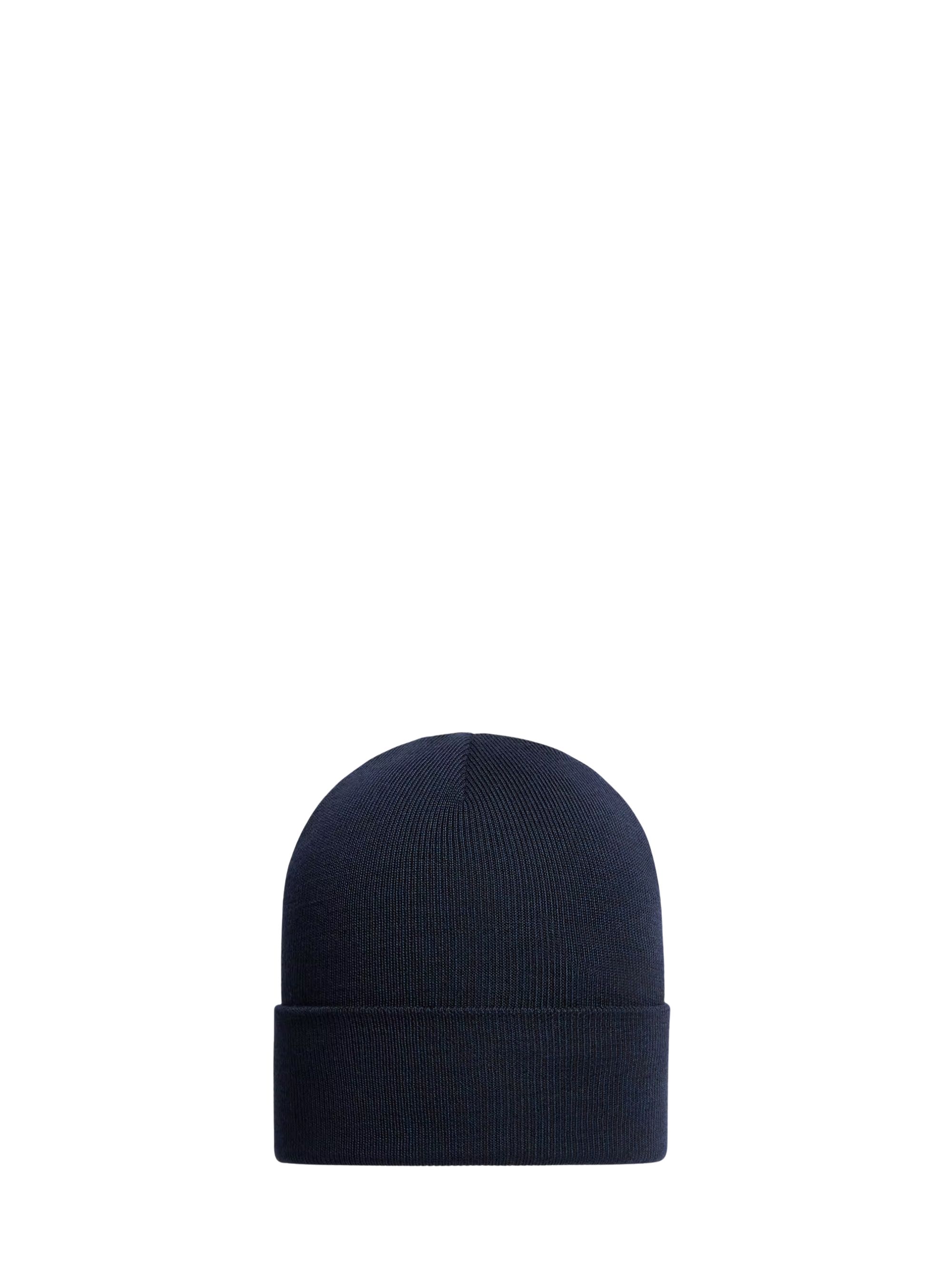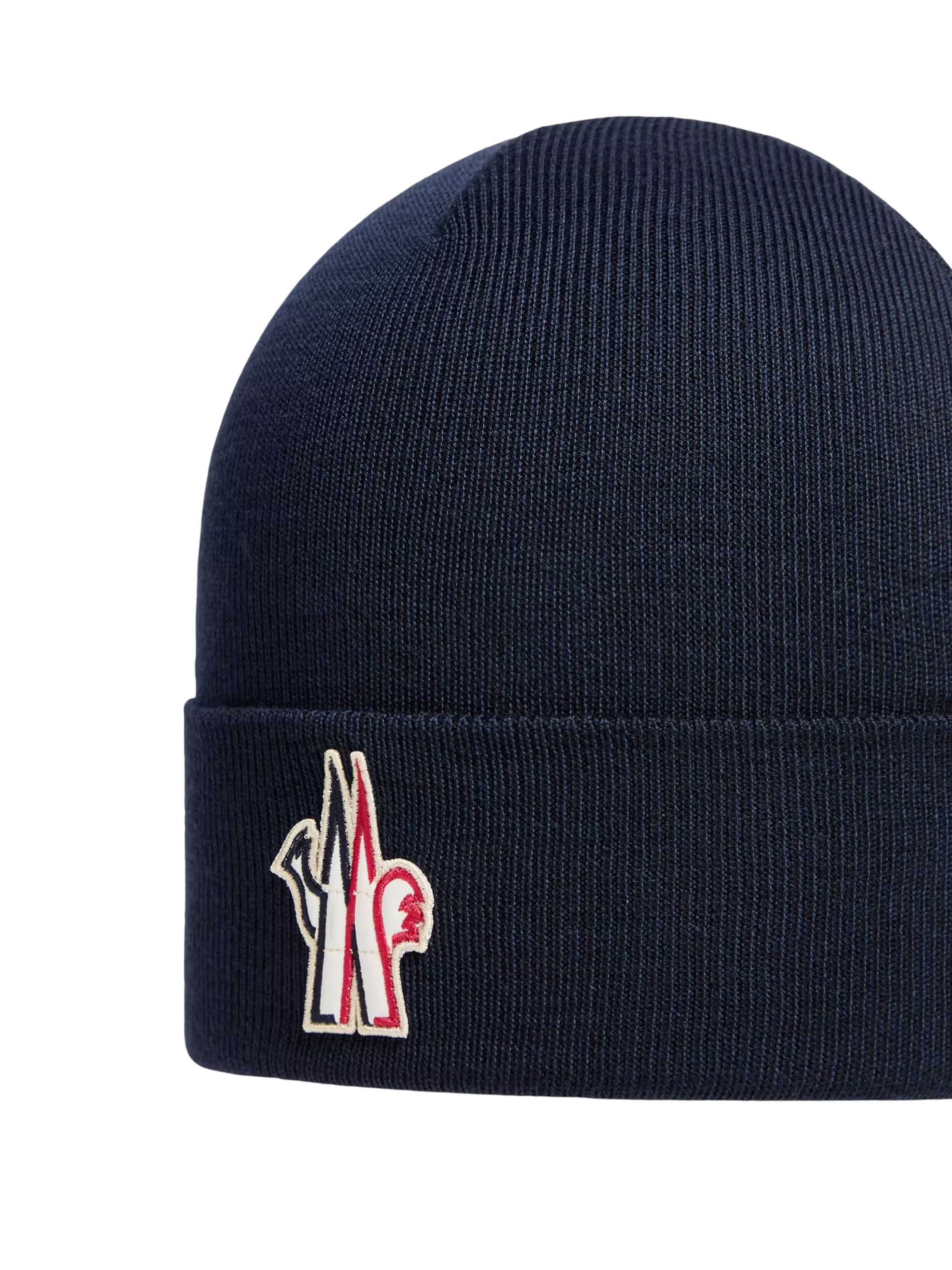 MONCLER GRENOBLE blue wool logo beanie featuring a logo on the front and ribbed knit.