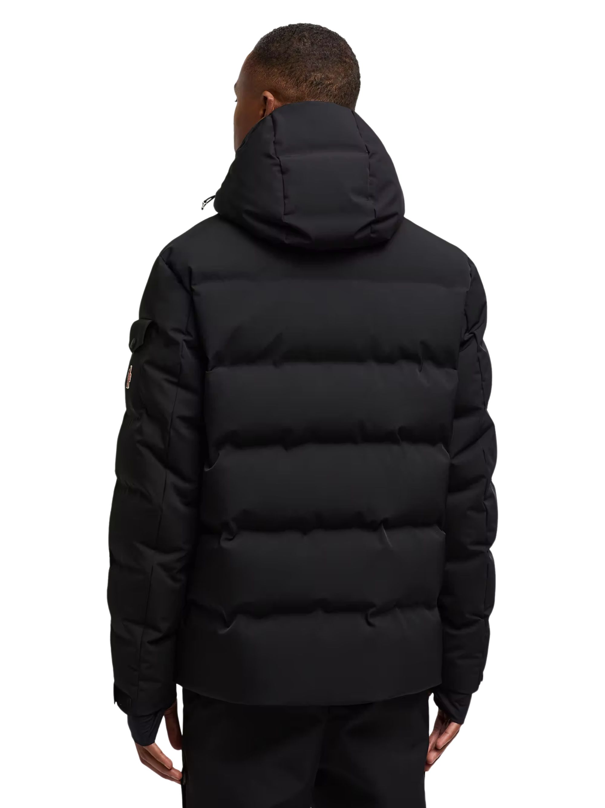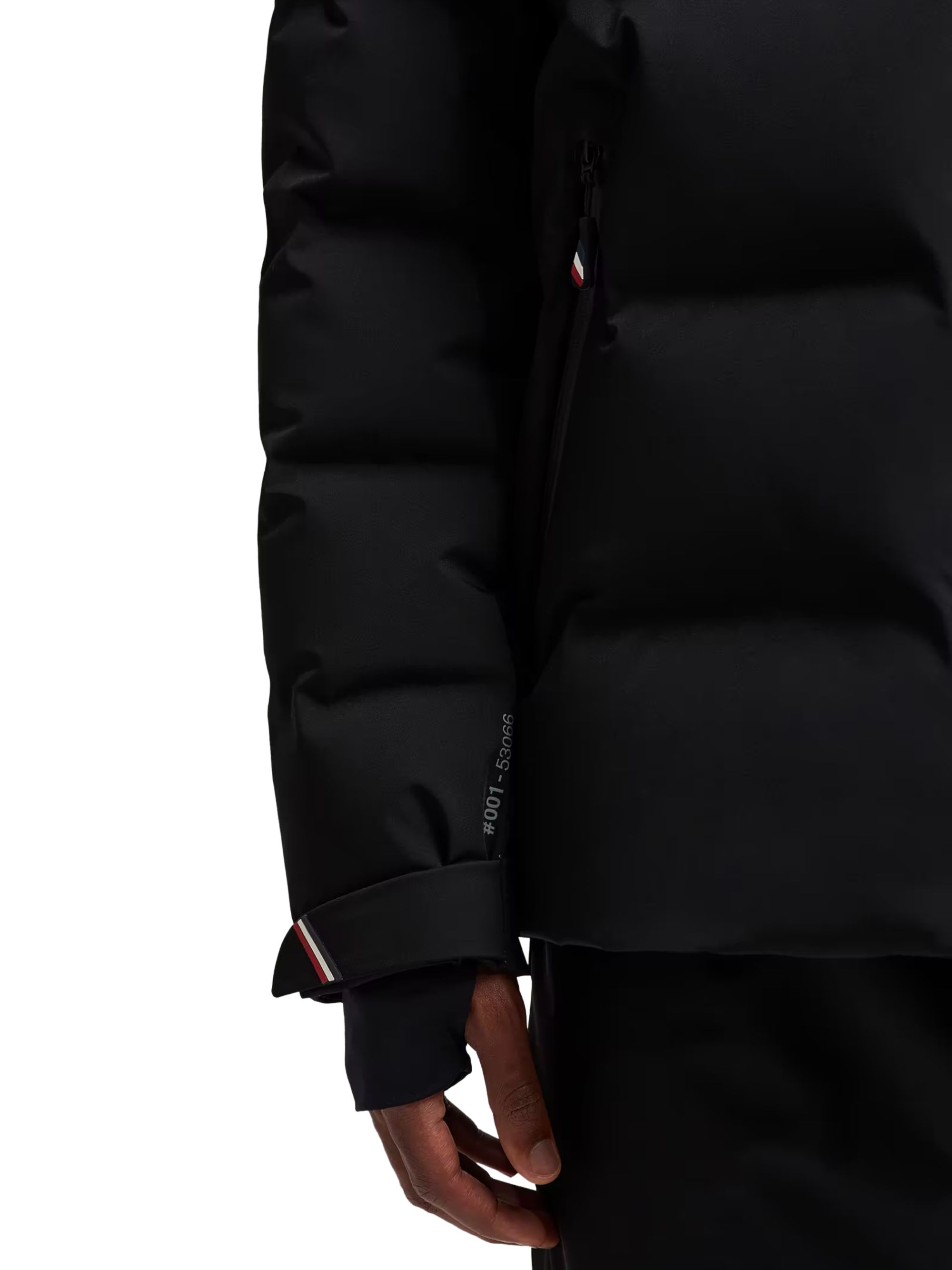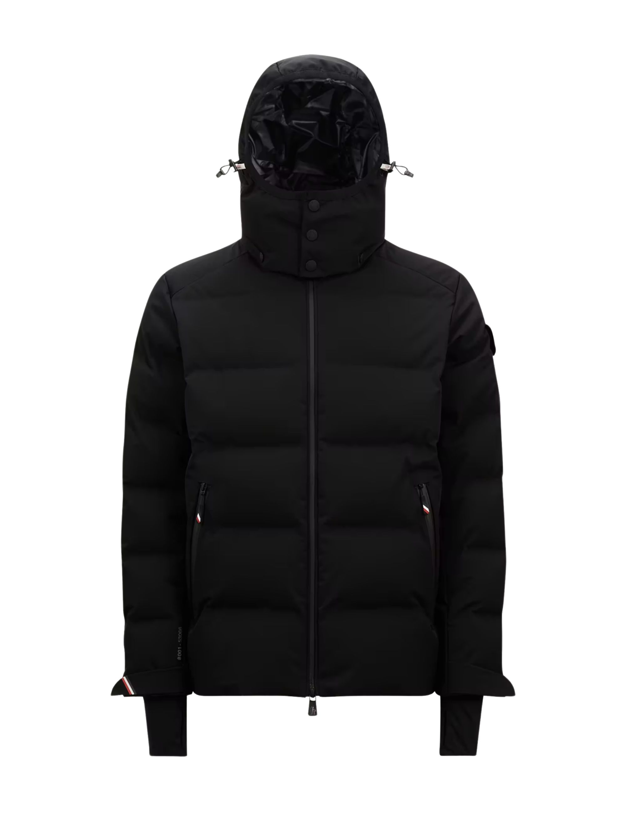 Montgetech down jacket by MONCLER GRENOBLE in black 2L 4-way stretch nylon, featuring an adjustable and removable hood, fleece inner collar, zip fastening, windproof gaiter, elasticated cuffs and drawstring hem.