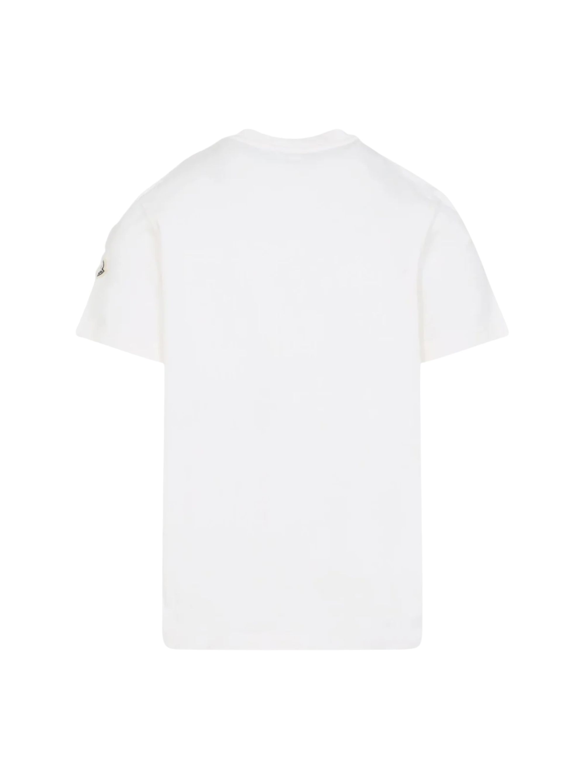 White cotton MONCLER logo T-shirt featuring a flocked logo on the front, crew neck and short sleeves with an applied felt logo patch.