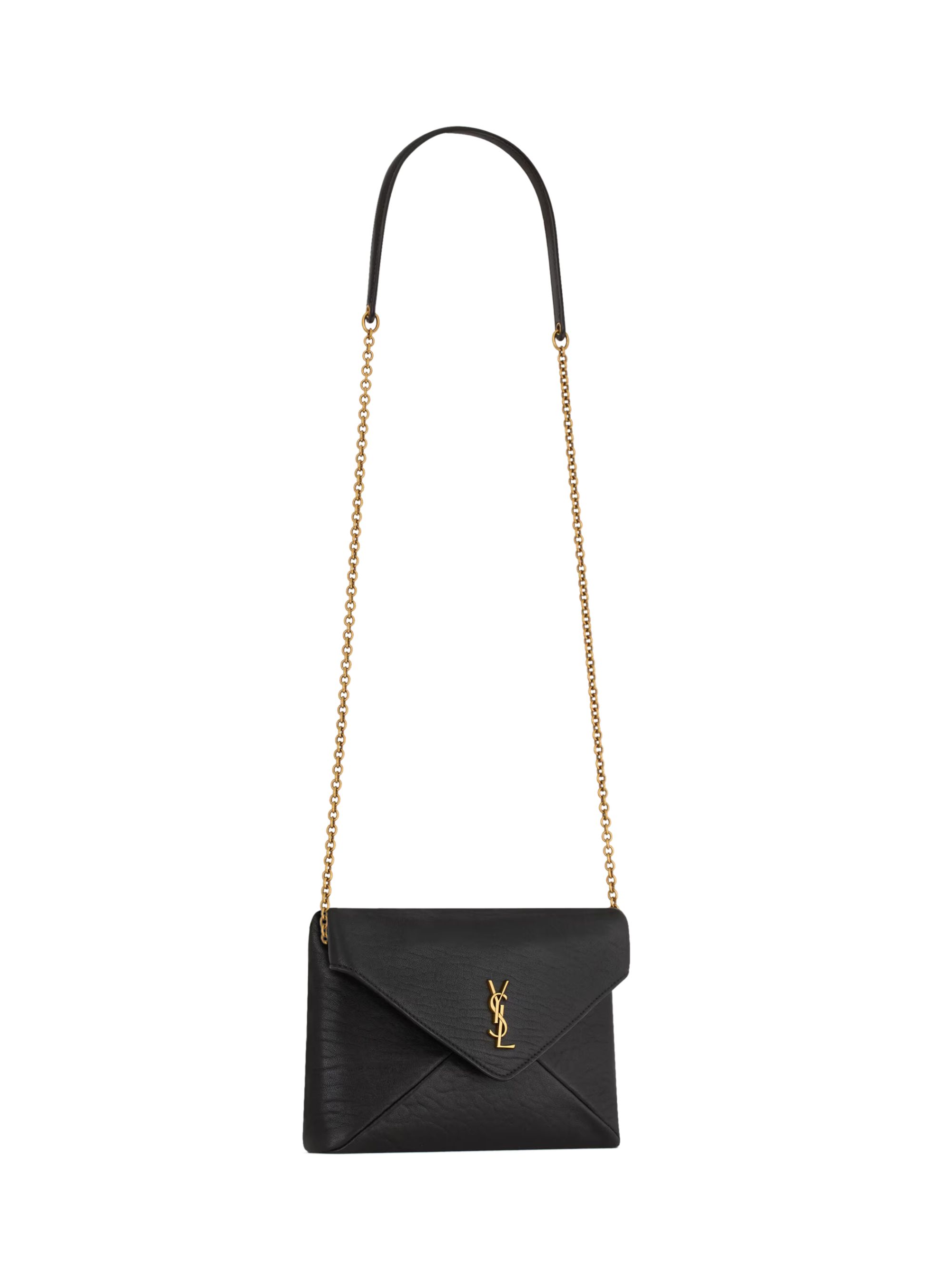 SAINT LAURENT Cassandre chain clutch in black leather, featuring bronze-tone hardware, a magnetic closure, a sliding chain shoulder strap, one main compartment and one flat pocket.