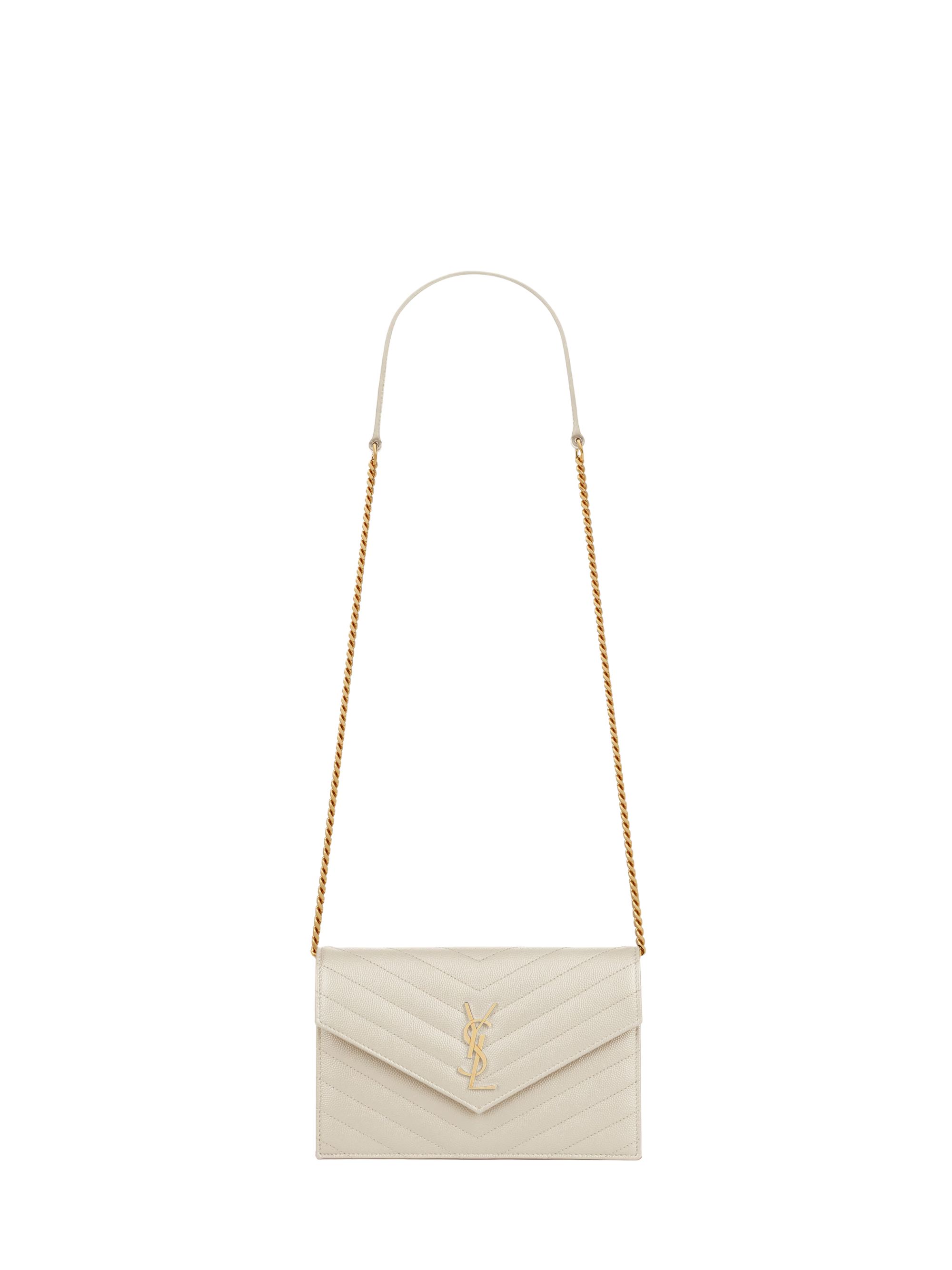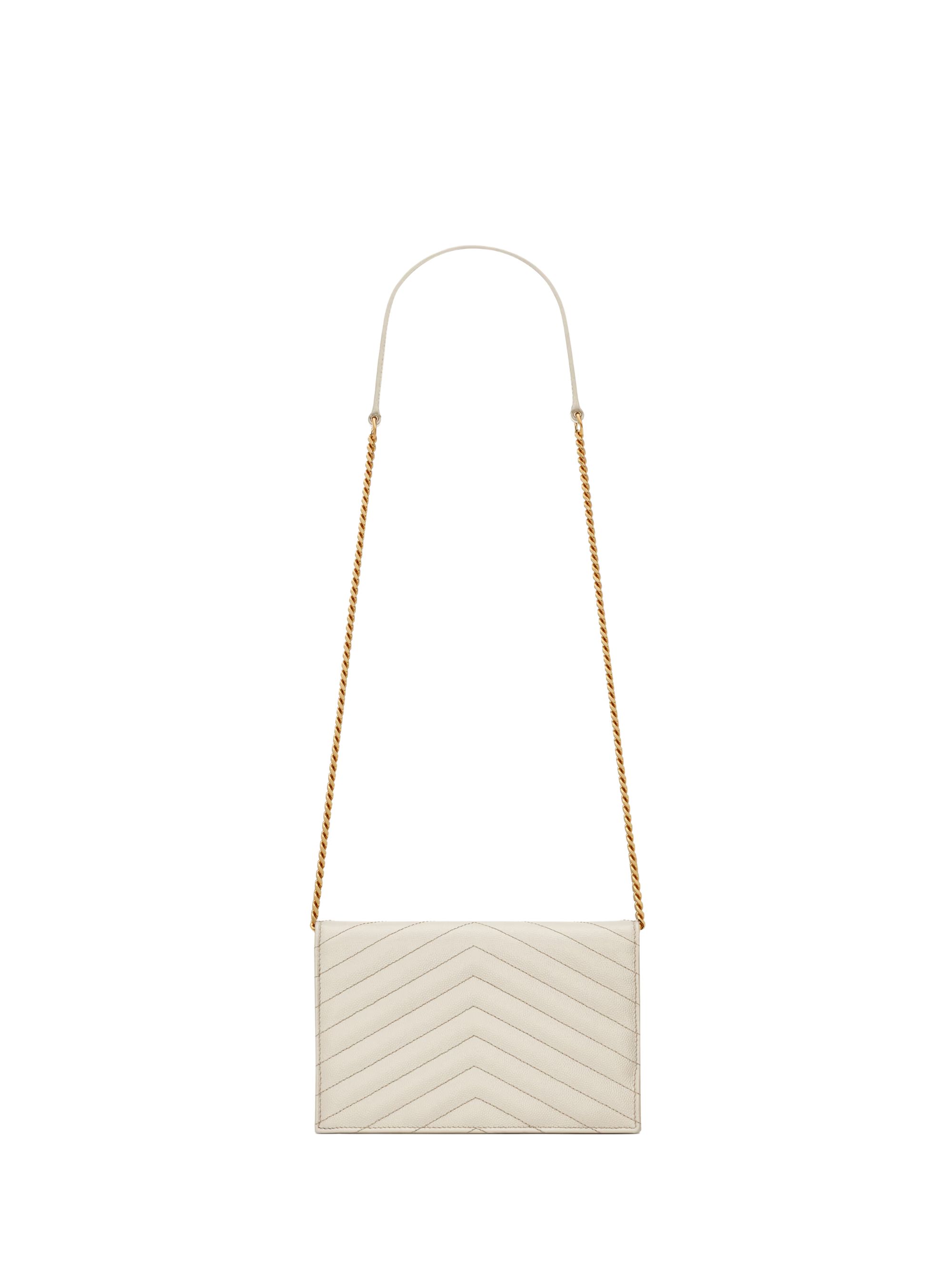 SAINT LAURENT white leather chain envelope clutch featuring chevron quilted stitching, a snap button closure, a card slot, a zip pocket and a chain and leather shoulder strap.