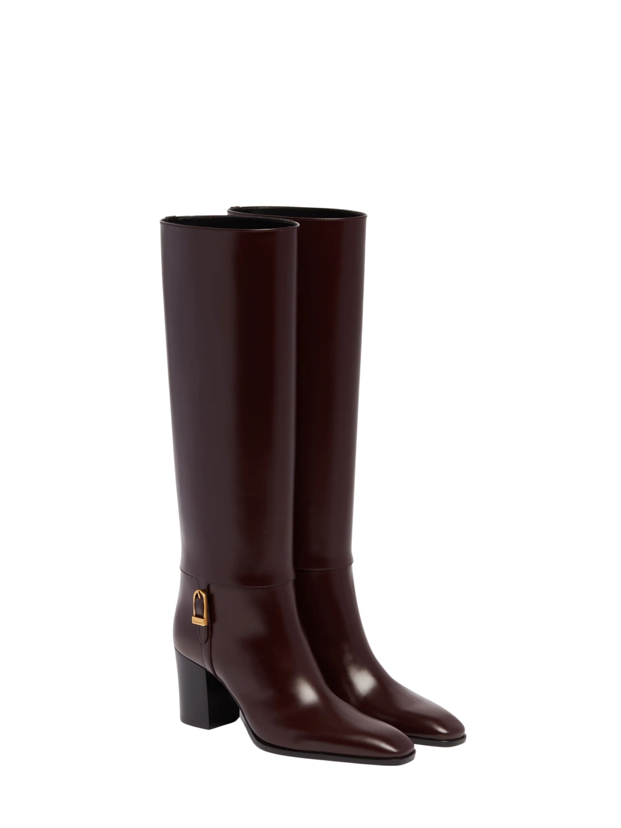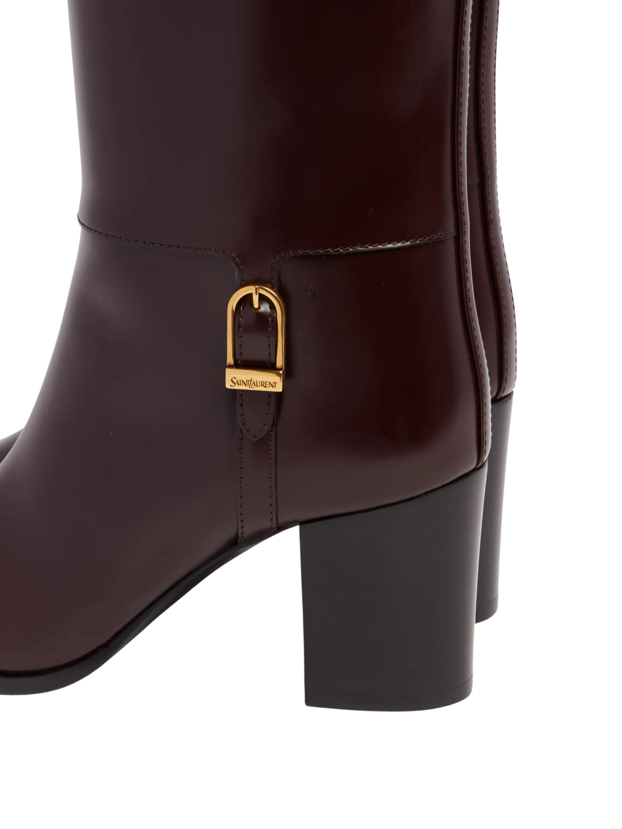Julia high boot by SAINT LAURENT in burgundy shiny leather, featuring a metal buckle decorated with the engraved logo, an elongated and square toe, leather lining, a leather sole and a solid wooden heel.