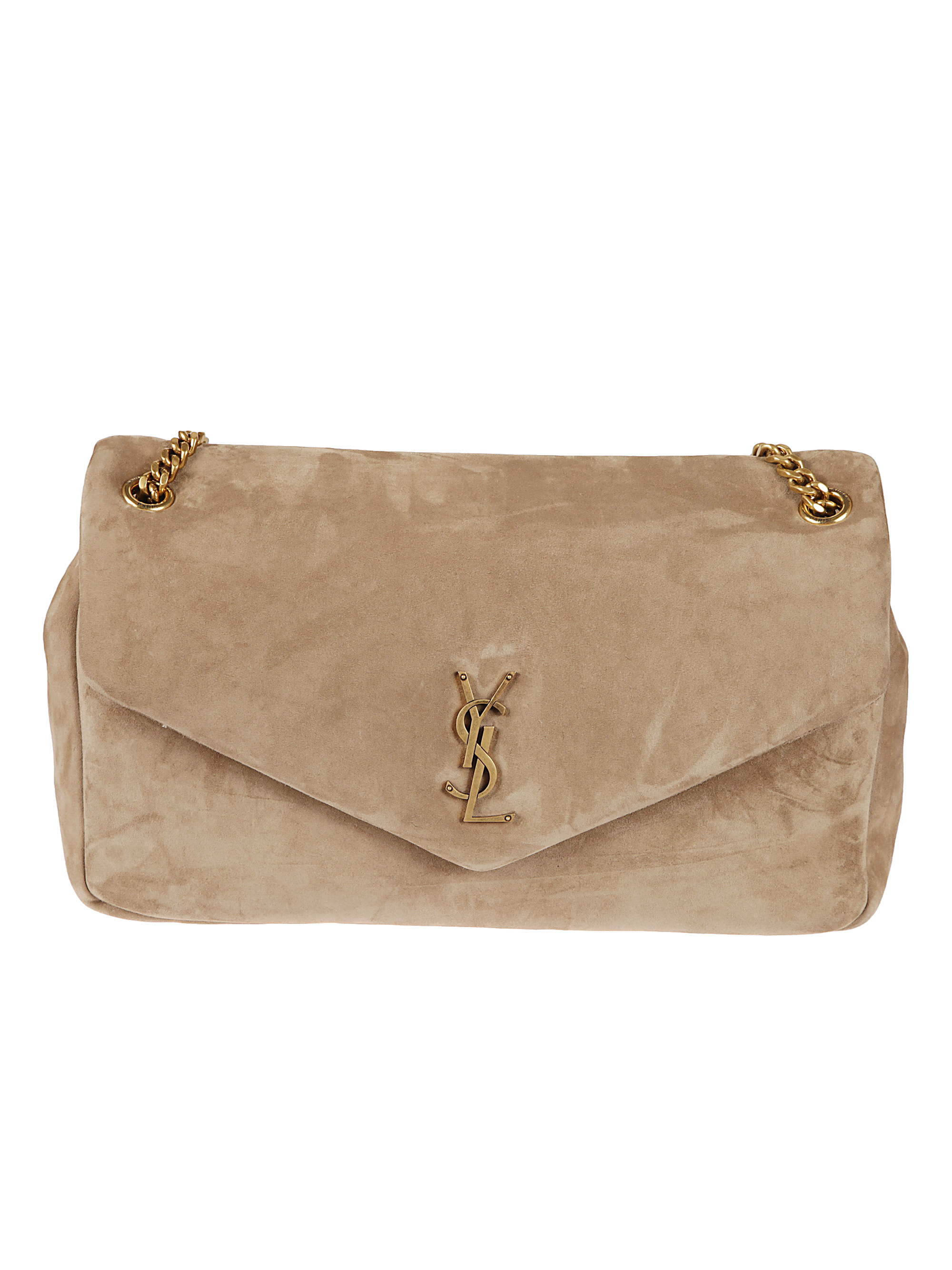 SAINT LAURENT large Calypso bag in beige suede, featuring a curb chain shoulder strap, grosgrain lining, bronze hardware, a magnetic closure, and a zip pocket. Dimensions: 38 x 21 x 10 cm.