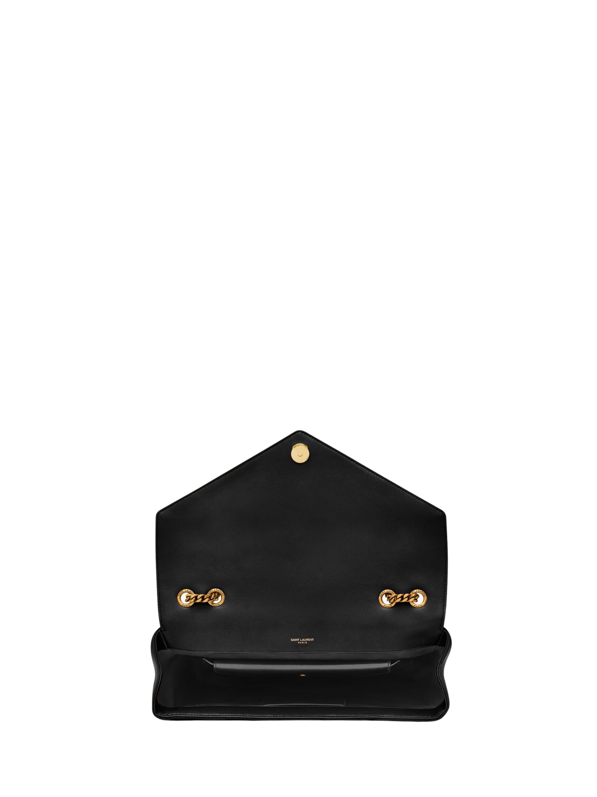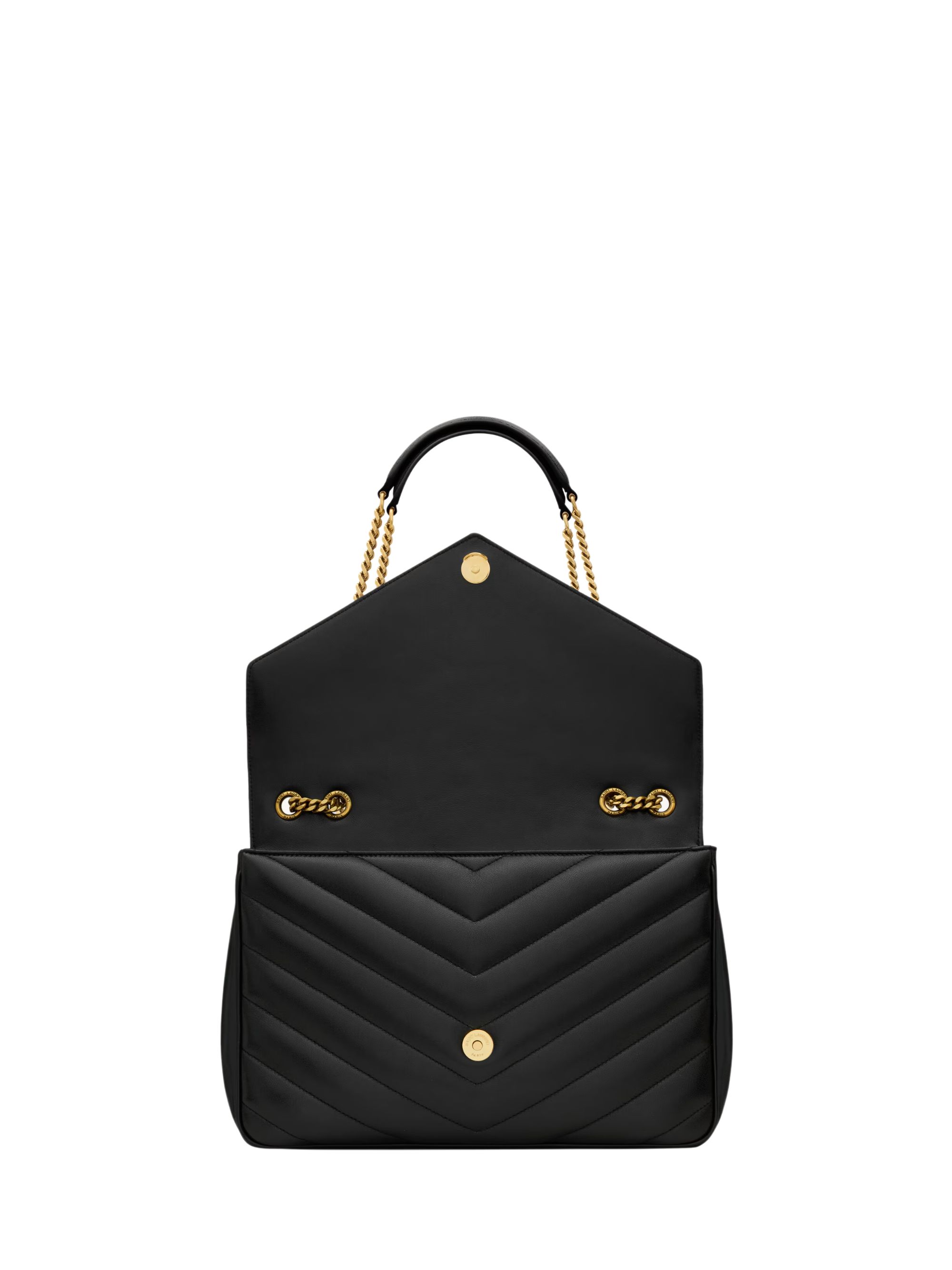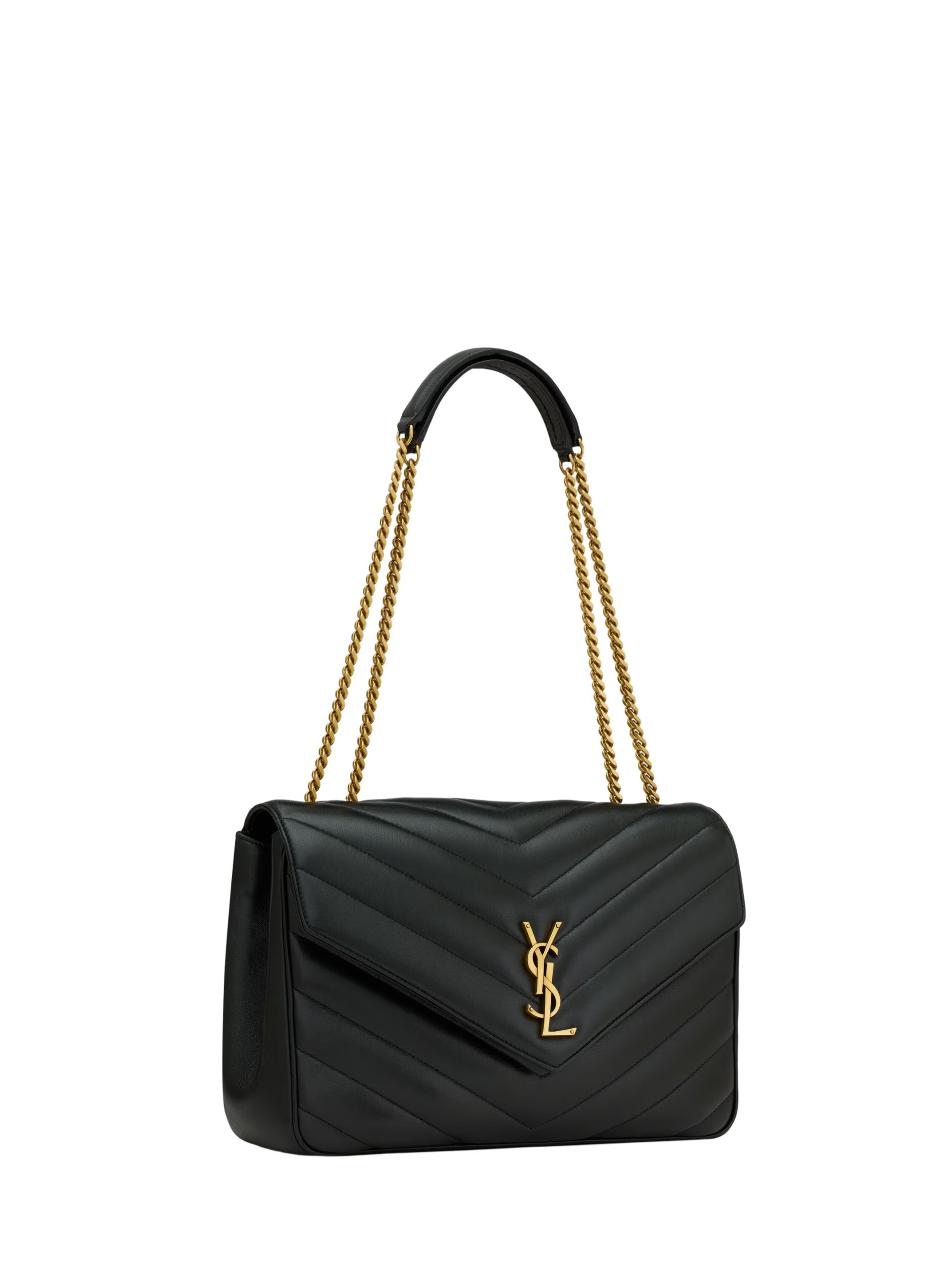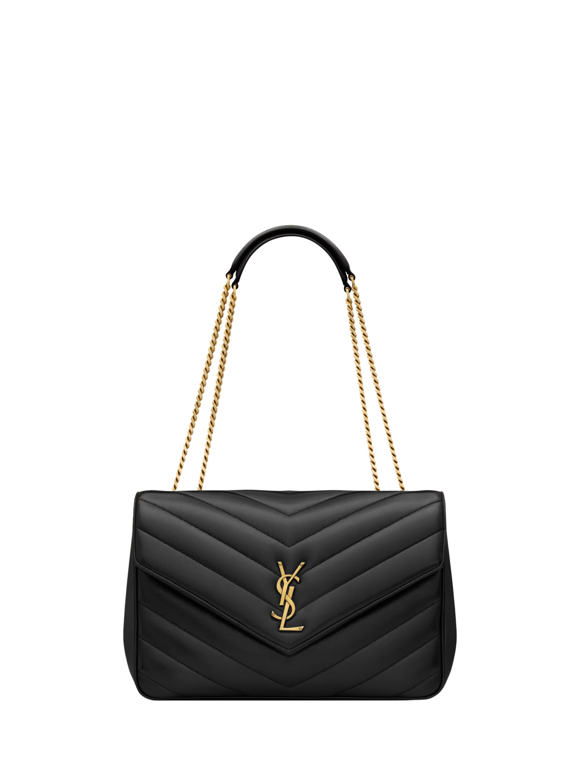 SAINT LAURENT large LouLou bag in black leather with chevron quilting, featuring an automatic magnetic closure, a sliding chain shoulder strap, bronzed hardware and a flat pocket.