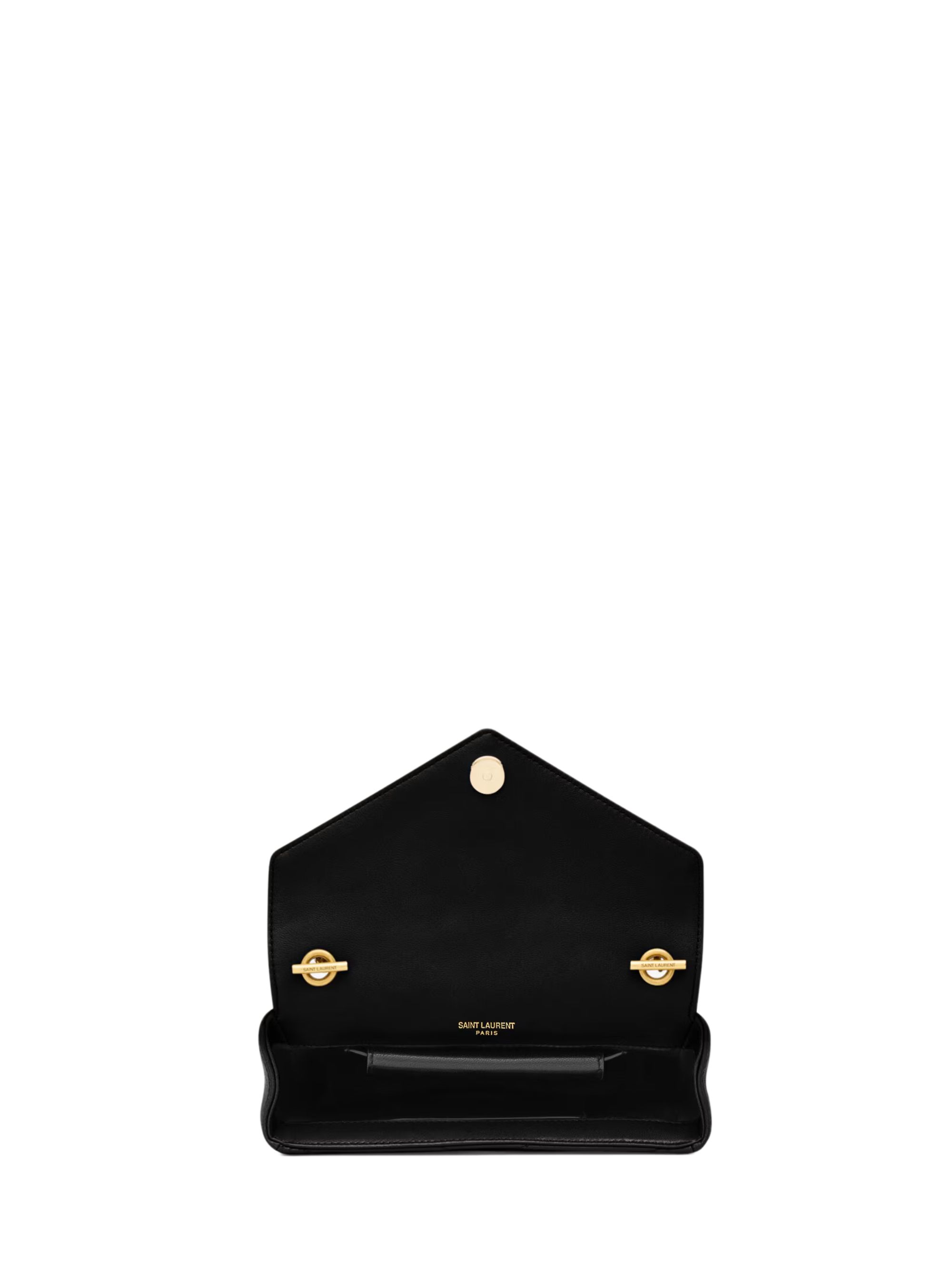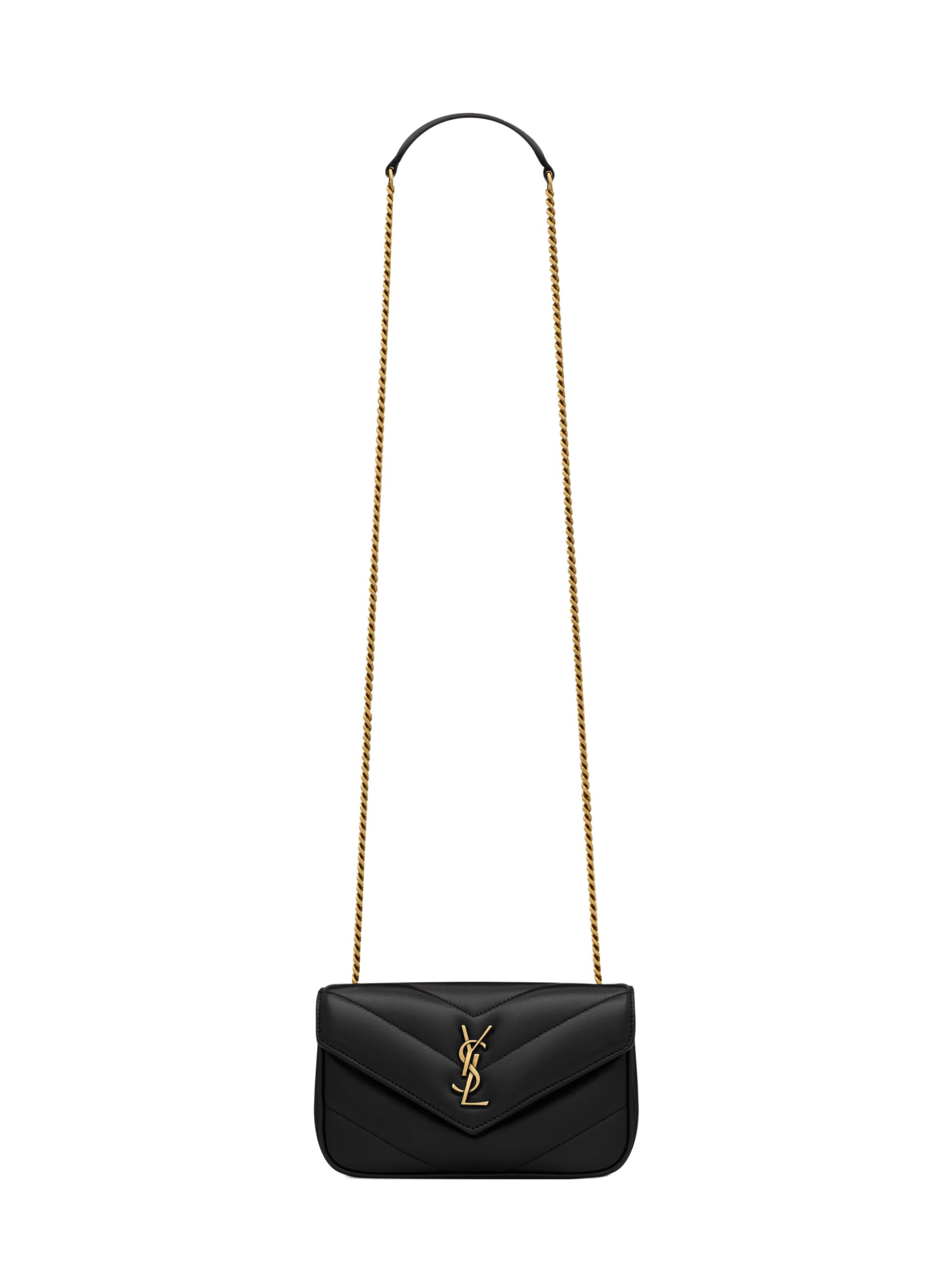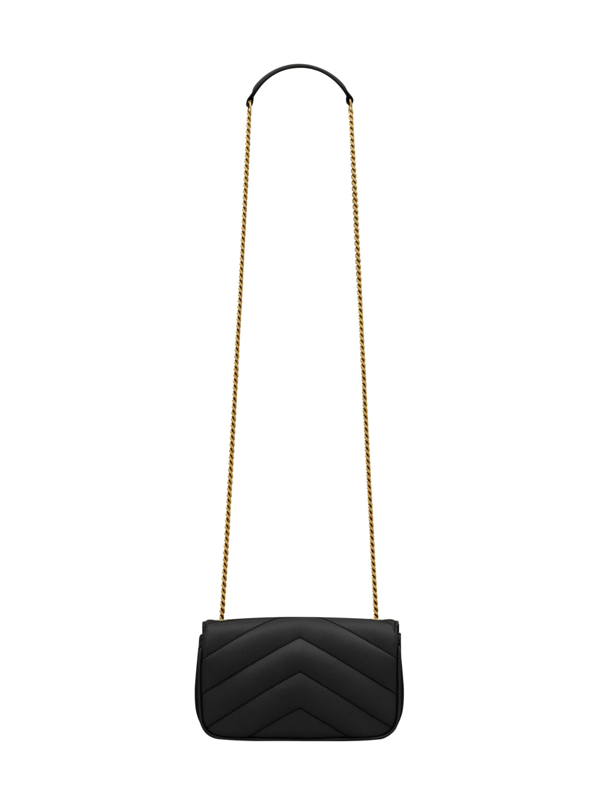 LouLou mini bag by SAINT LAURENT in black chevron-quilted leather, featuring a removable pouch, a leather shoulder strap with chain, an automatic magnetic closure, a flat pocket and bronze hardware.
