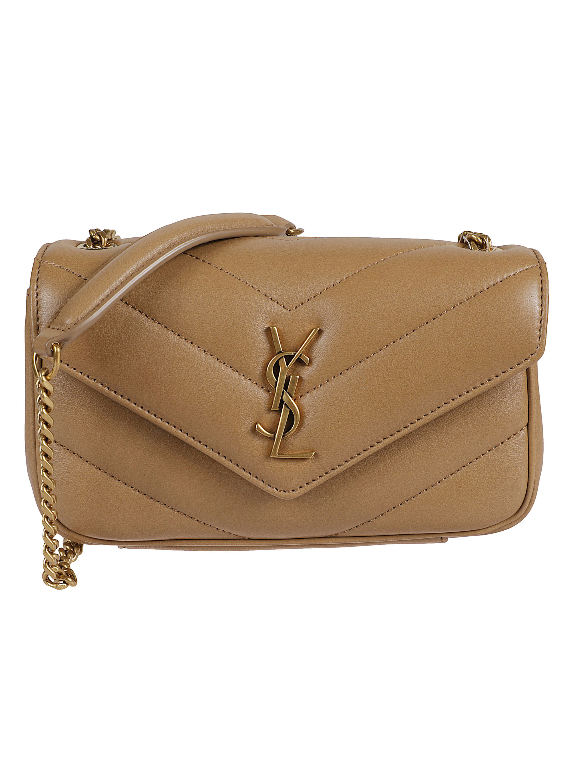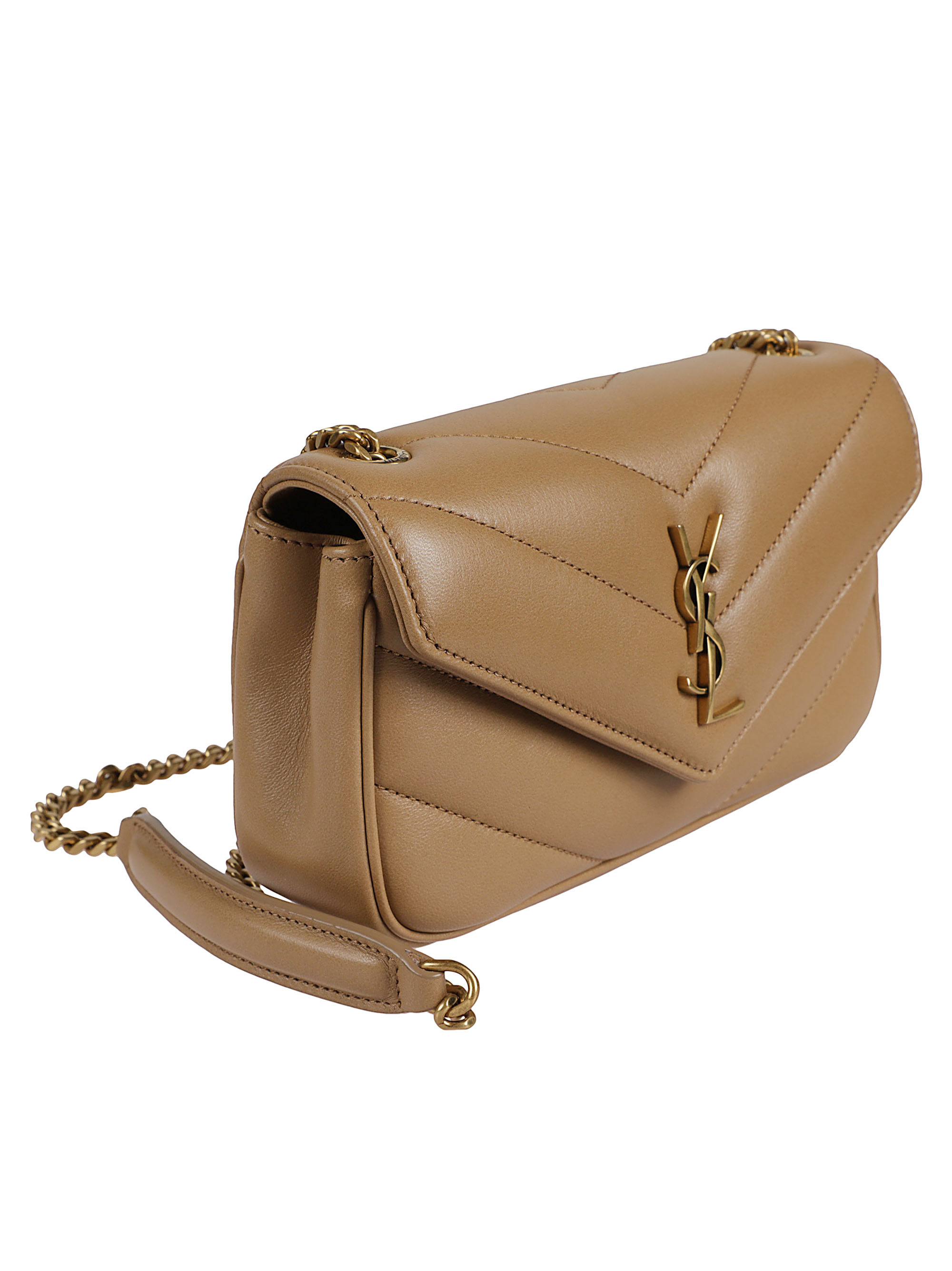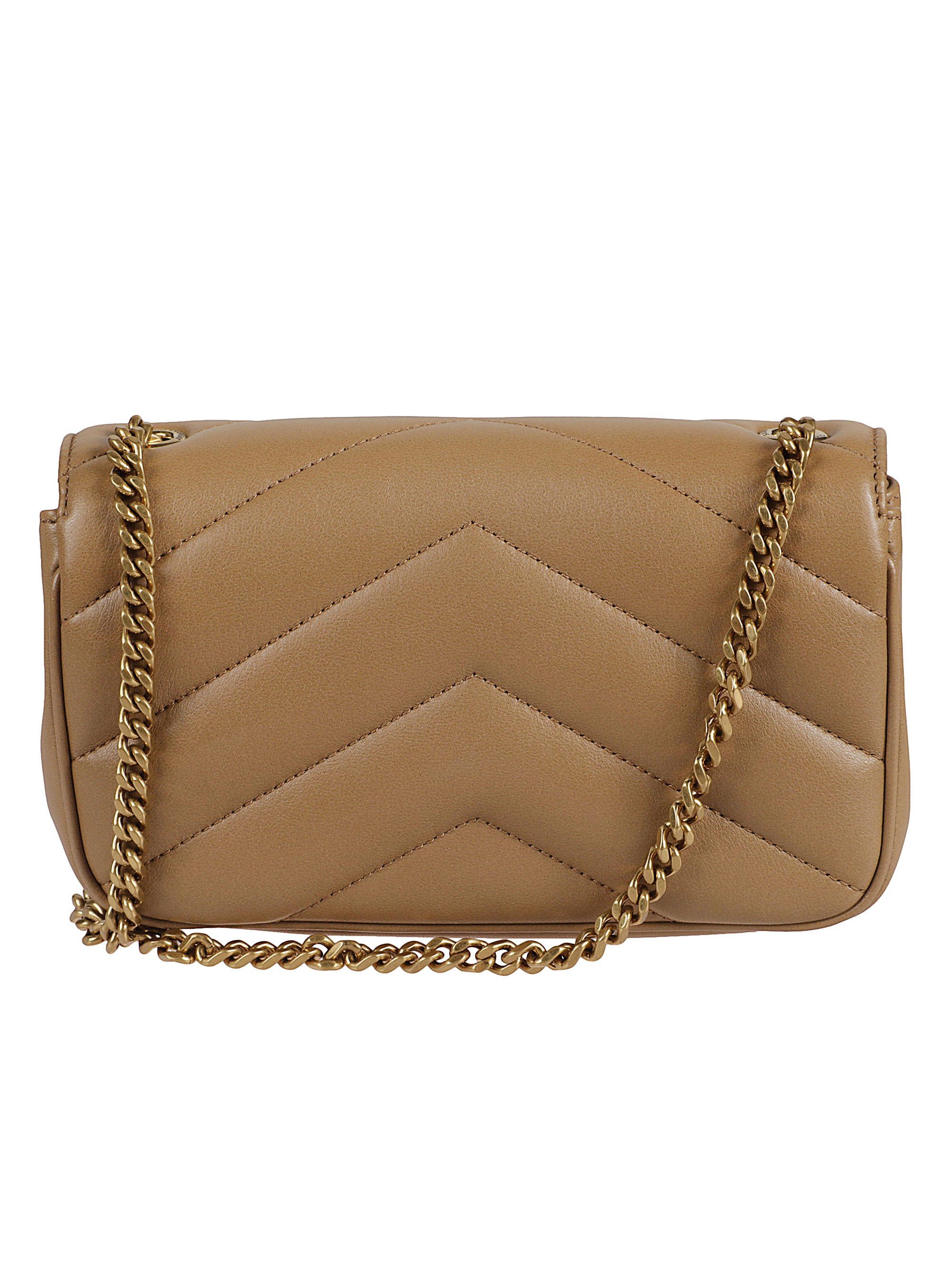 LouLou mini bag by SAINT LAURENT in beige chevron-quilted leather, featuring a removable pouch, a leather shoulder strap with chain, an automatic magnetic closure, a flat pocket and bronze hardware.