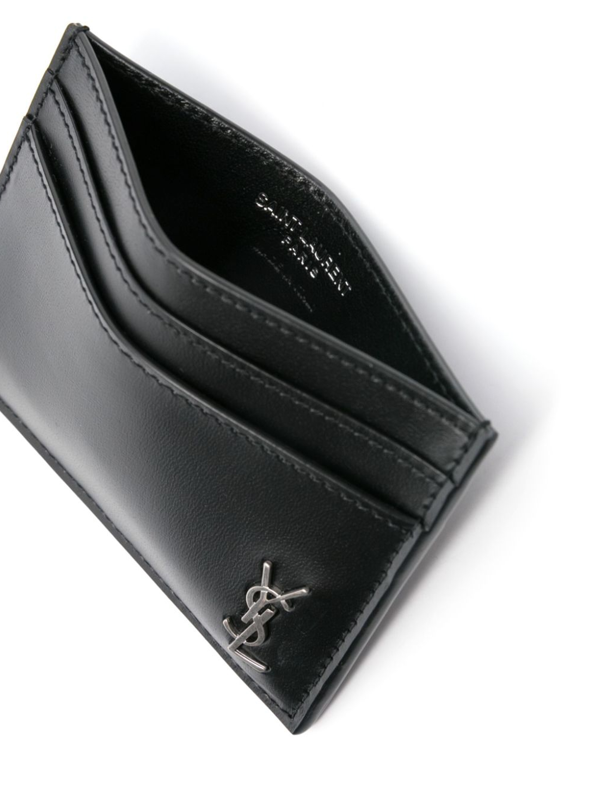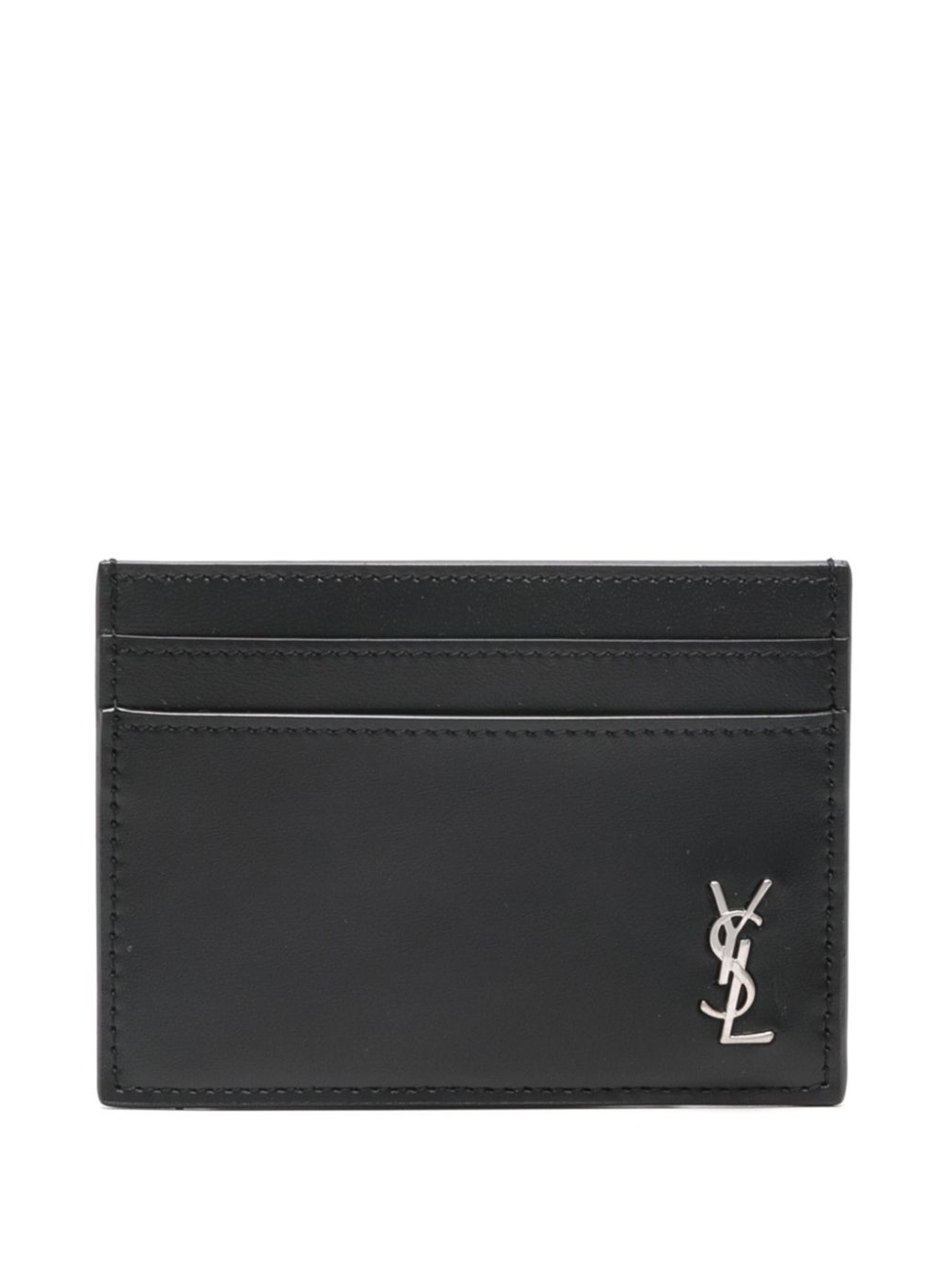 SAINT LAURENT Tiny Cassandre card holder in black matte leather, featuring silver-tone hardware, small metal YSL initials and five card slots.