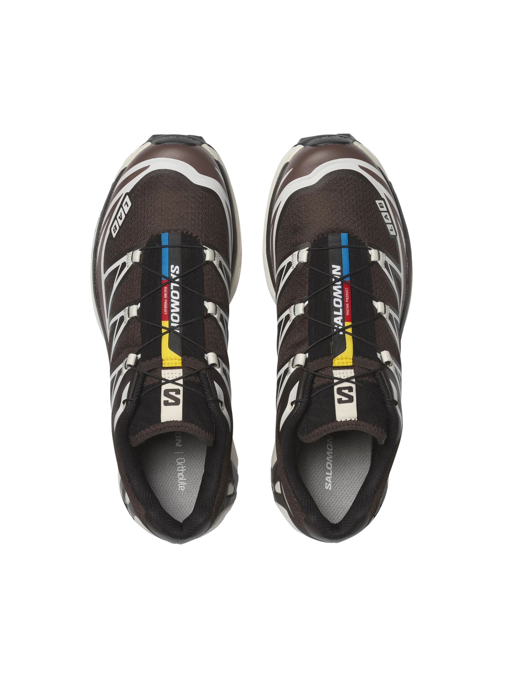 SALOMON XT-6 Skyline sneaker in brown fabric and mesh, featuring white details and yellow, red and blue lines along the laces and on the upper.