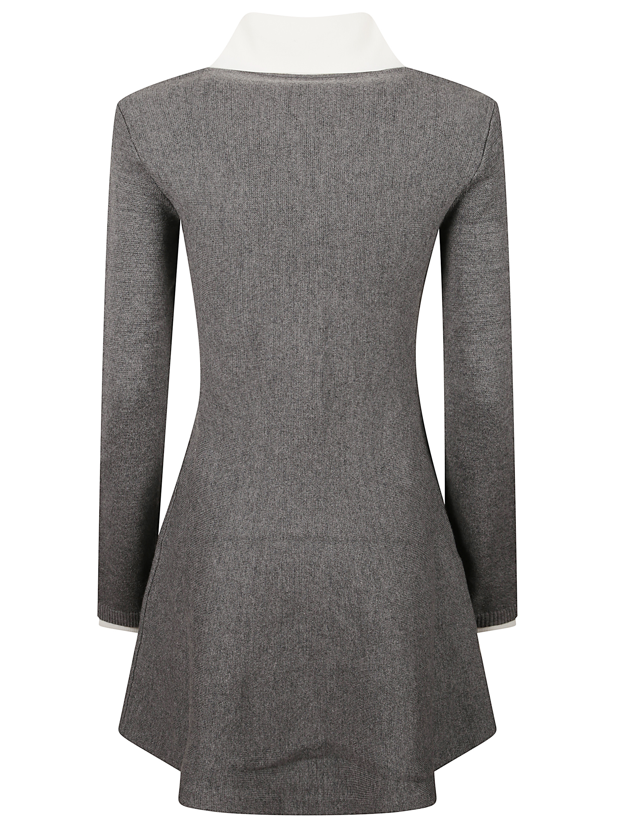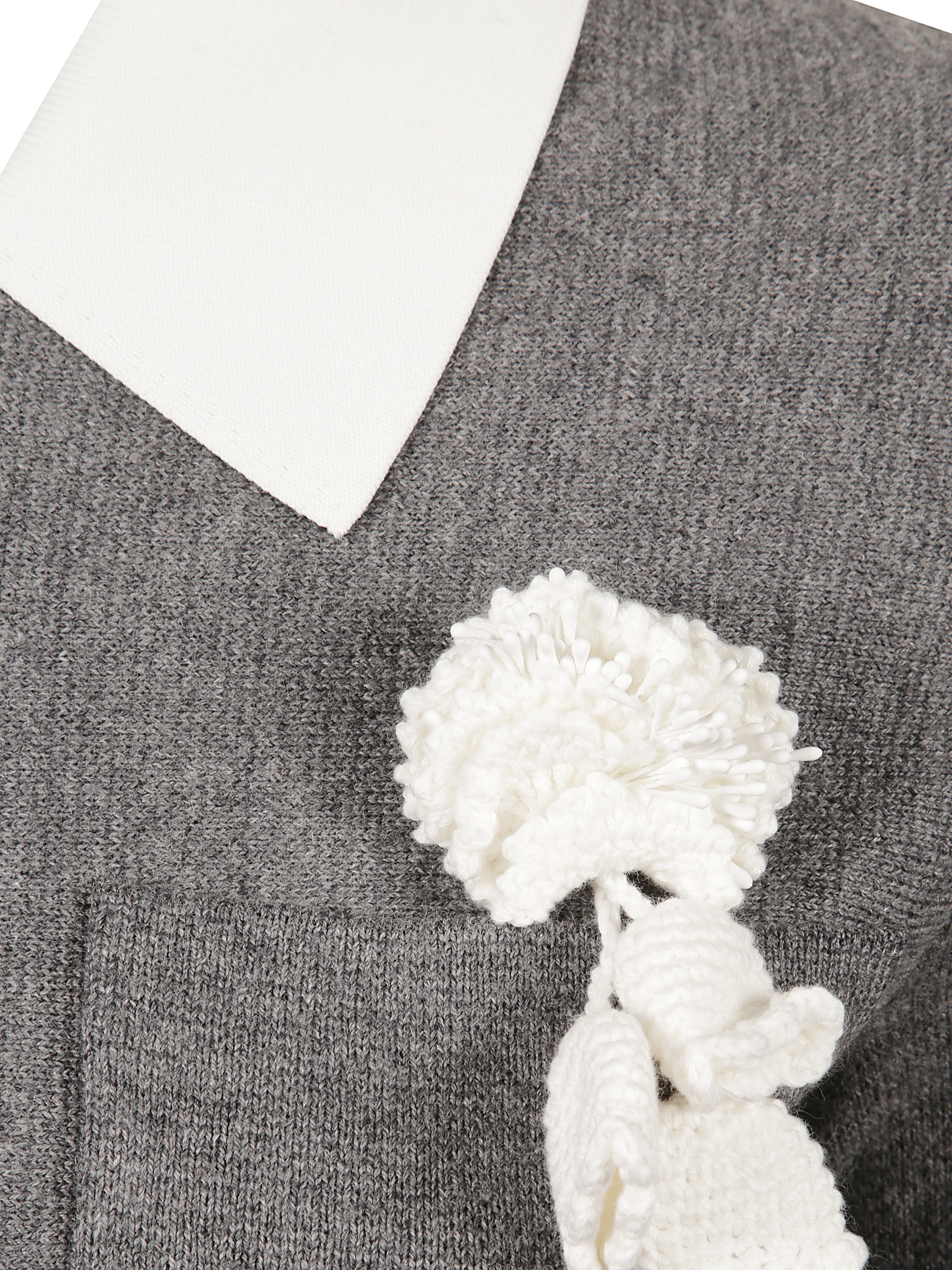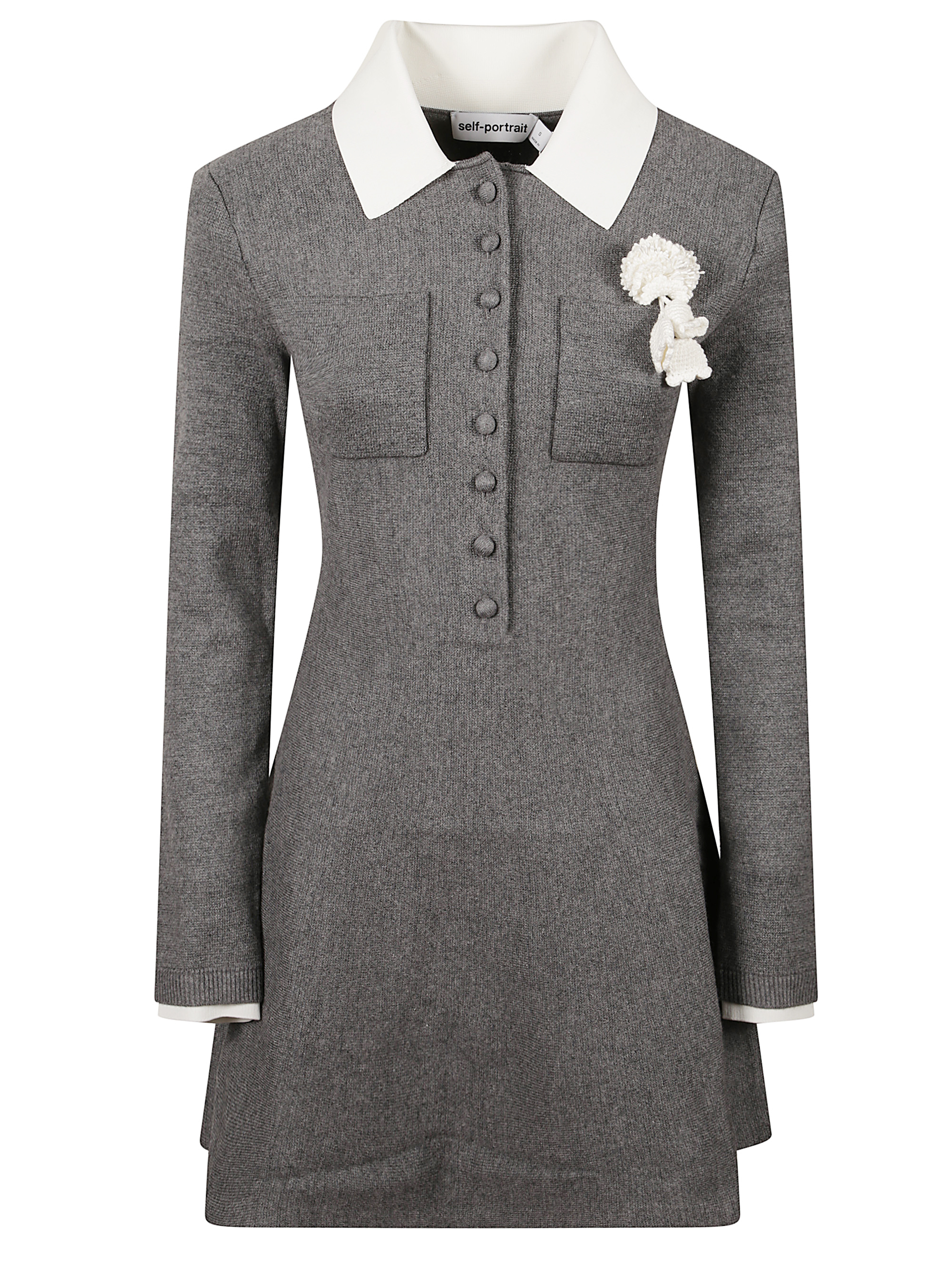SELF PORTRAIT grey crochet floral mini dress in knit featuring a crochet floral motif, a removable flower brooch and a button fastening.