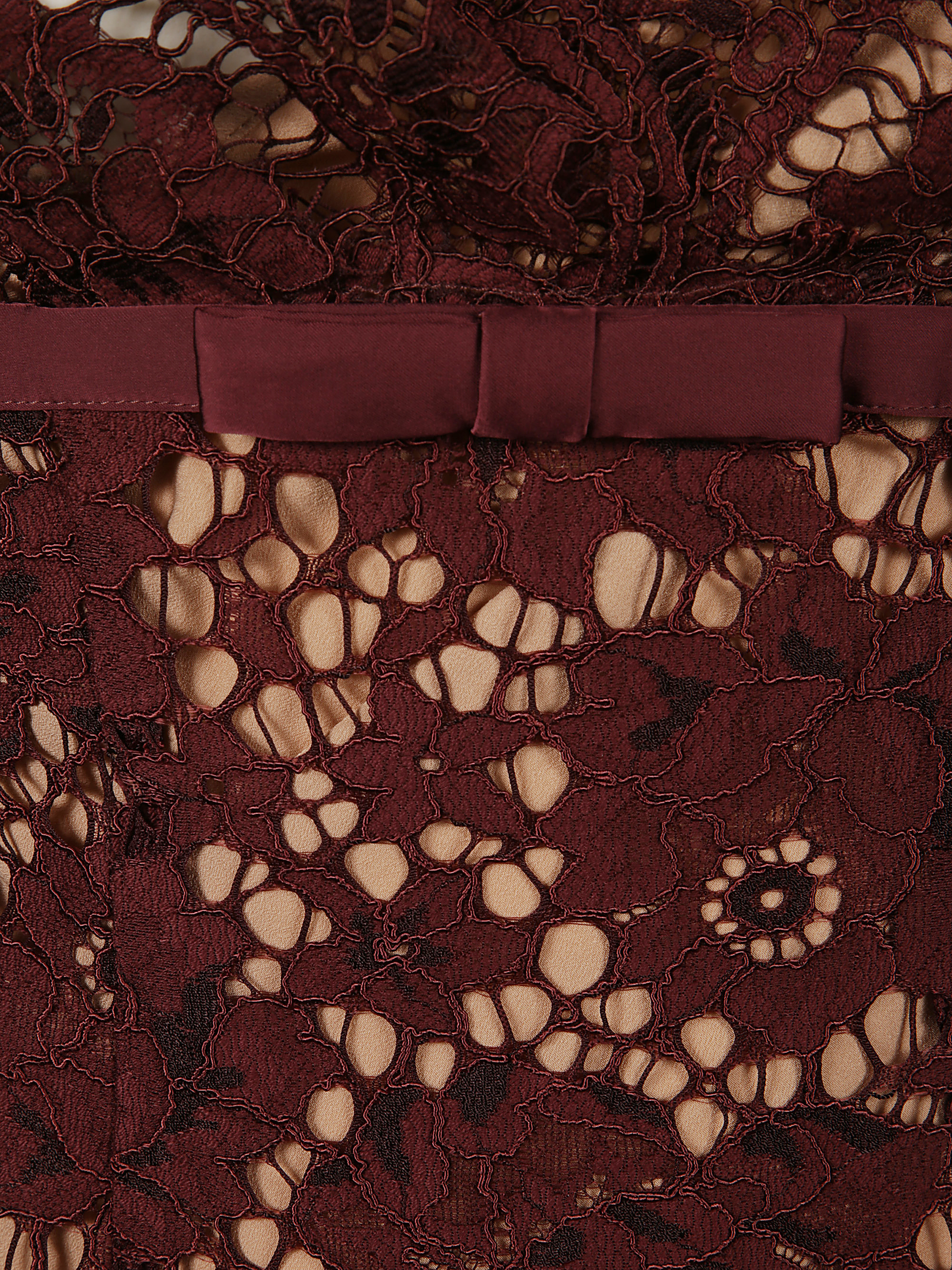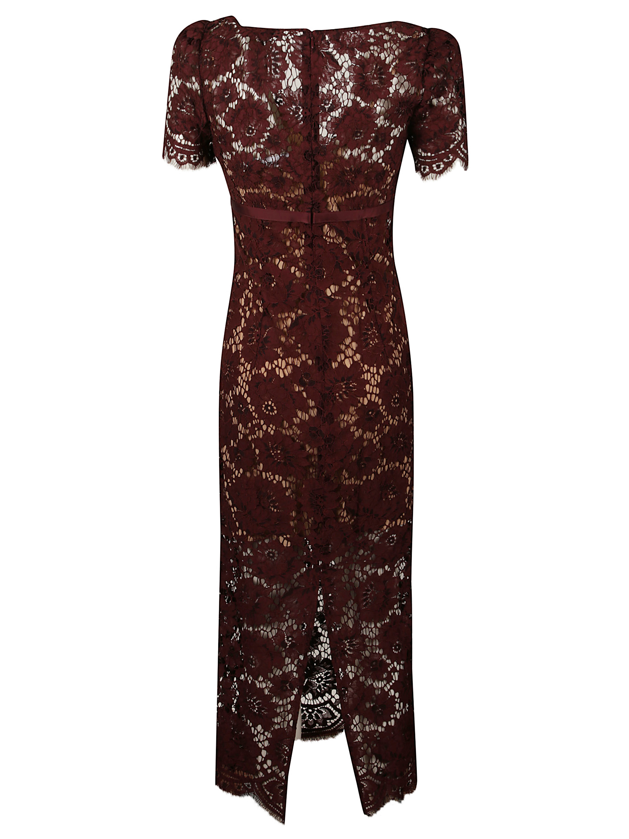 SELF PORTRAIT burgundy floral lace midi dress featuring a V-neck, short sleeves, a fitted bodice and a midi length.