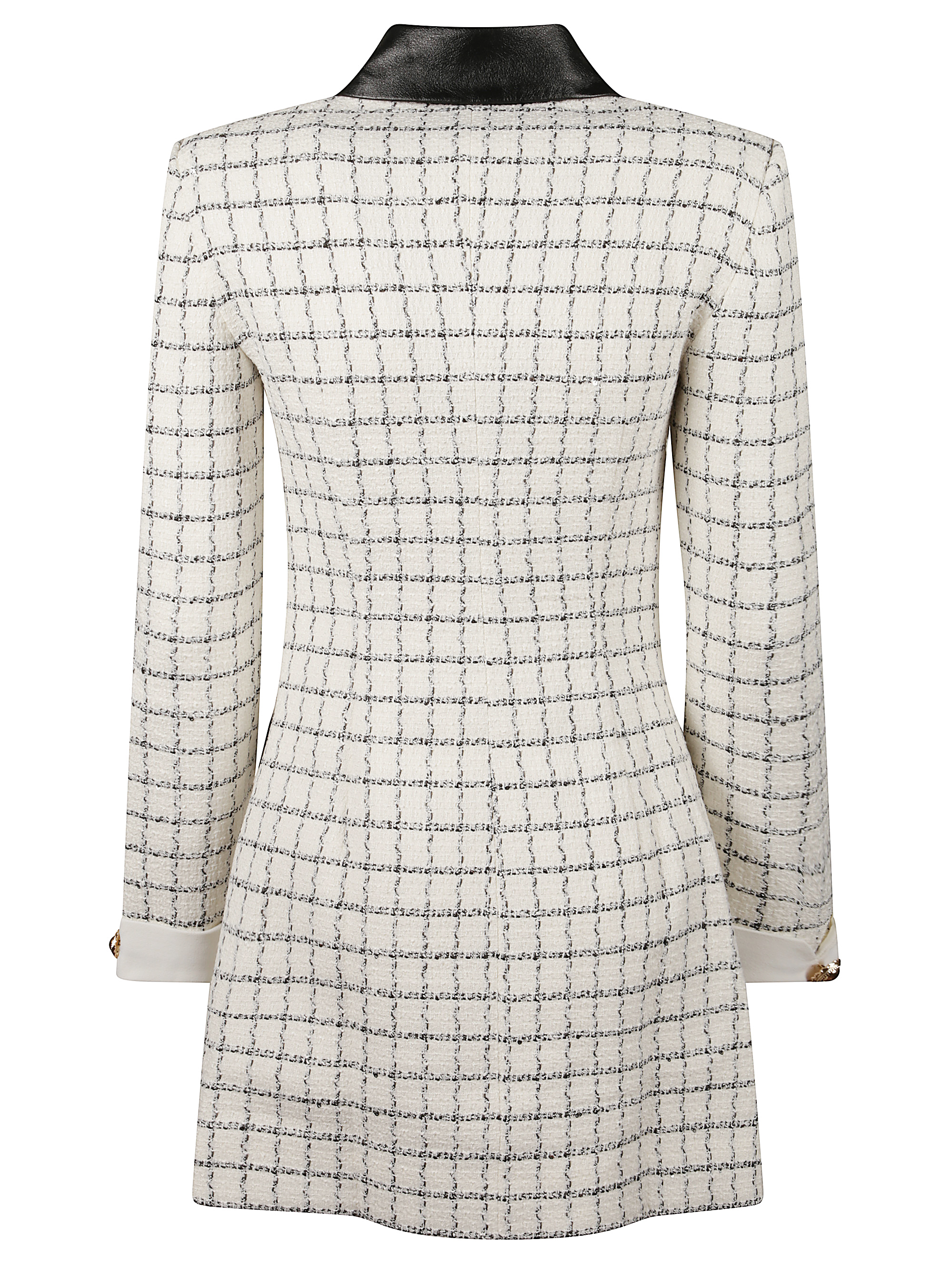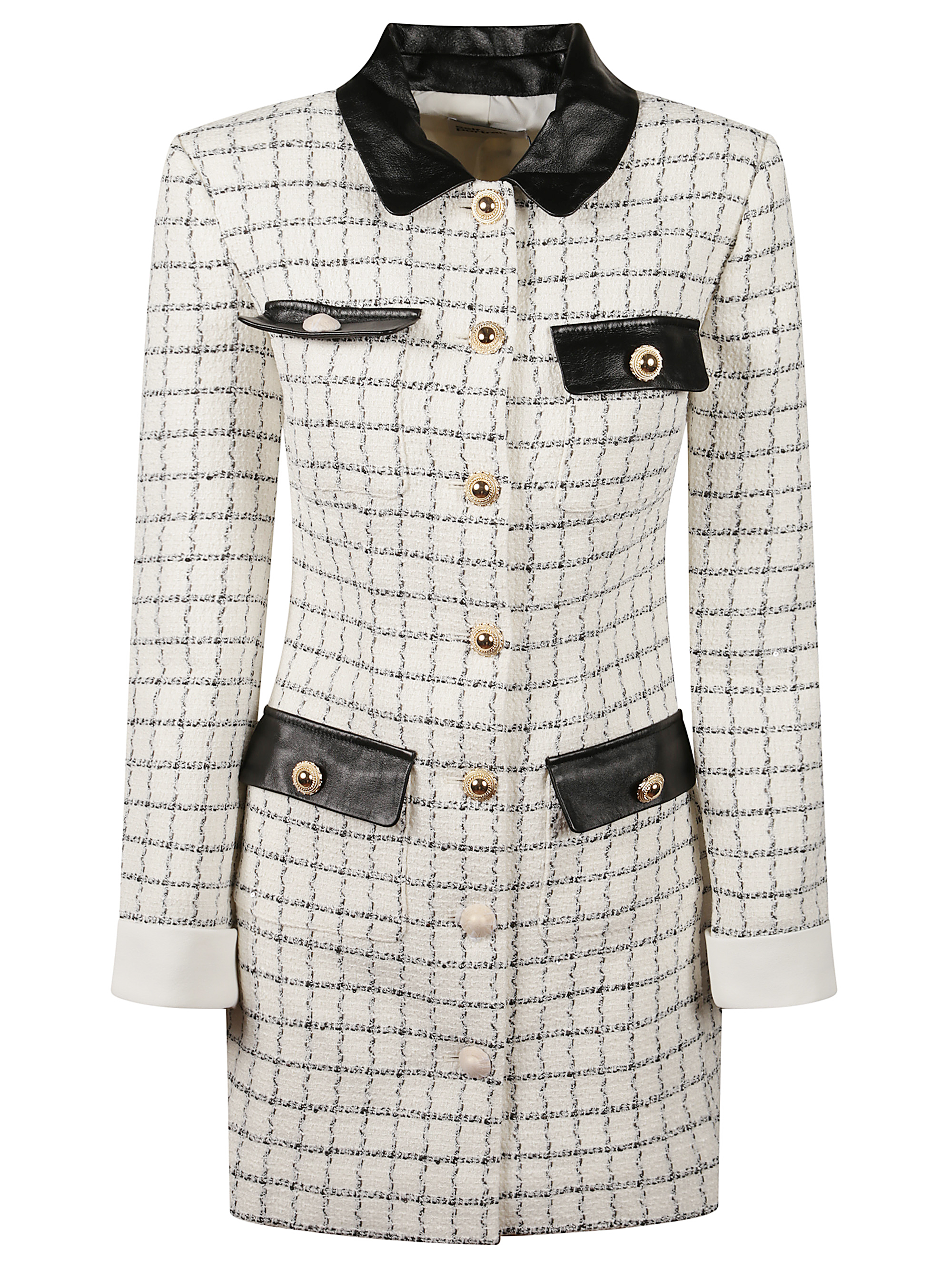 SELF PORTRAIT white checked bouclé long sleeve mini dress in bouclé fabric, featuring a black leather collar, functional pockets with leather flaps and a gold button fastening.