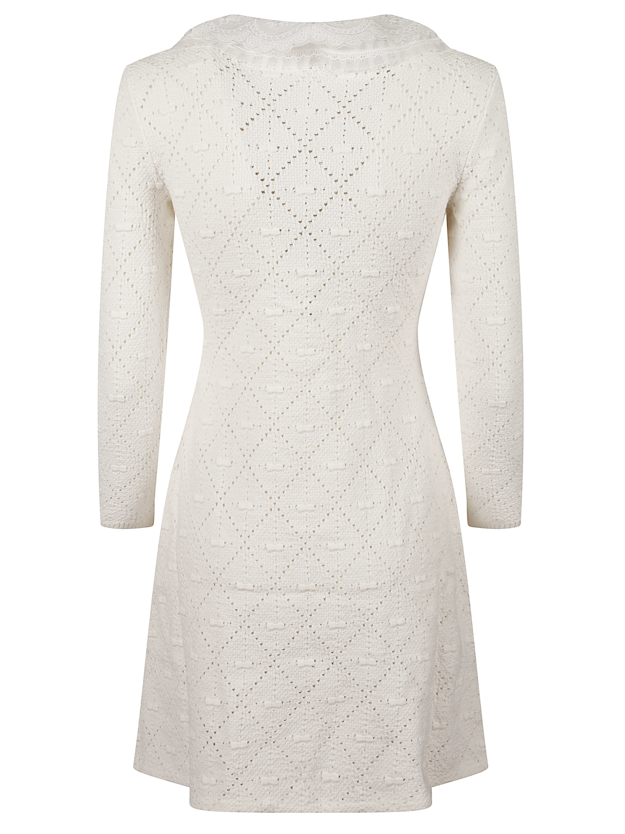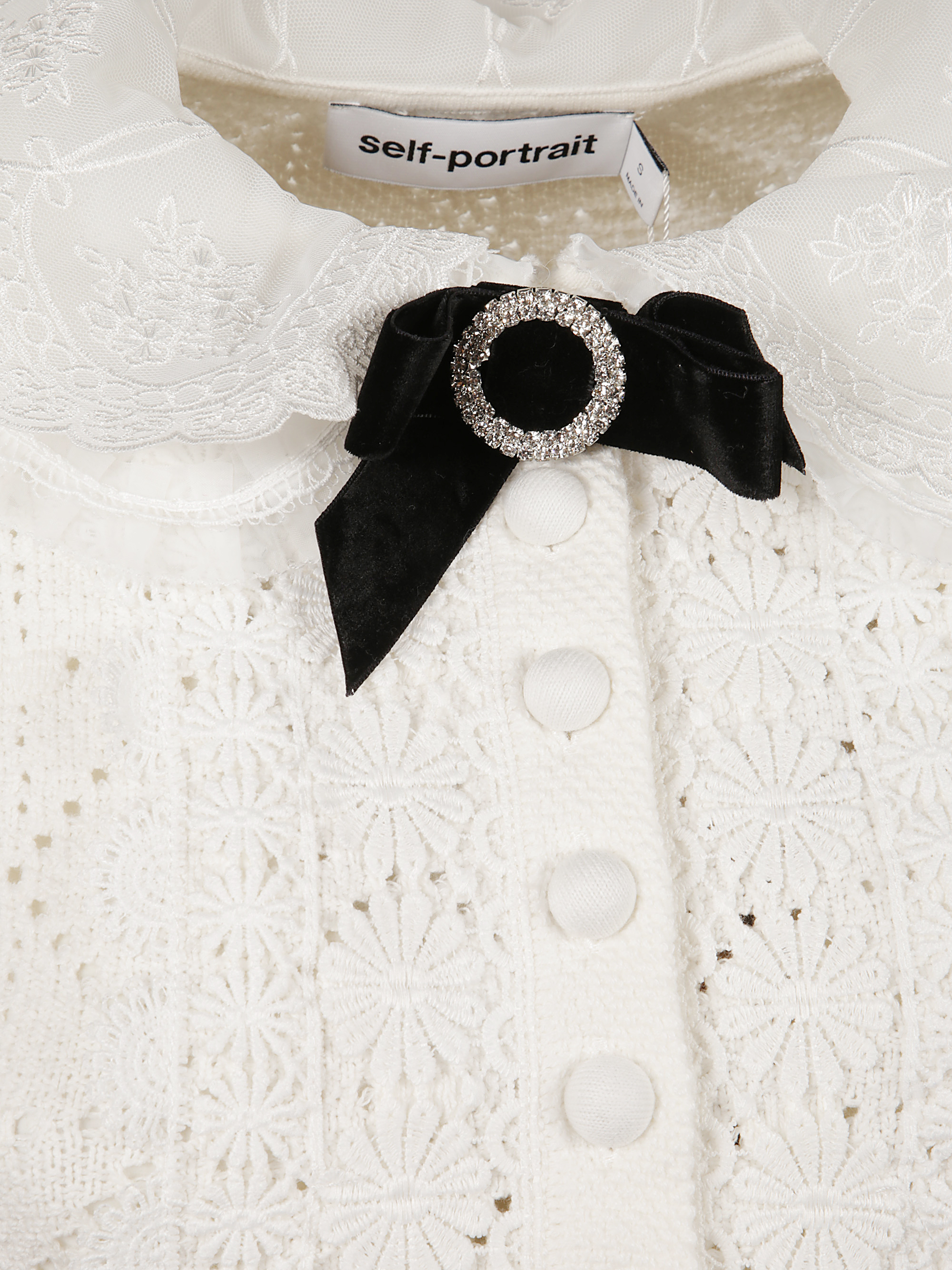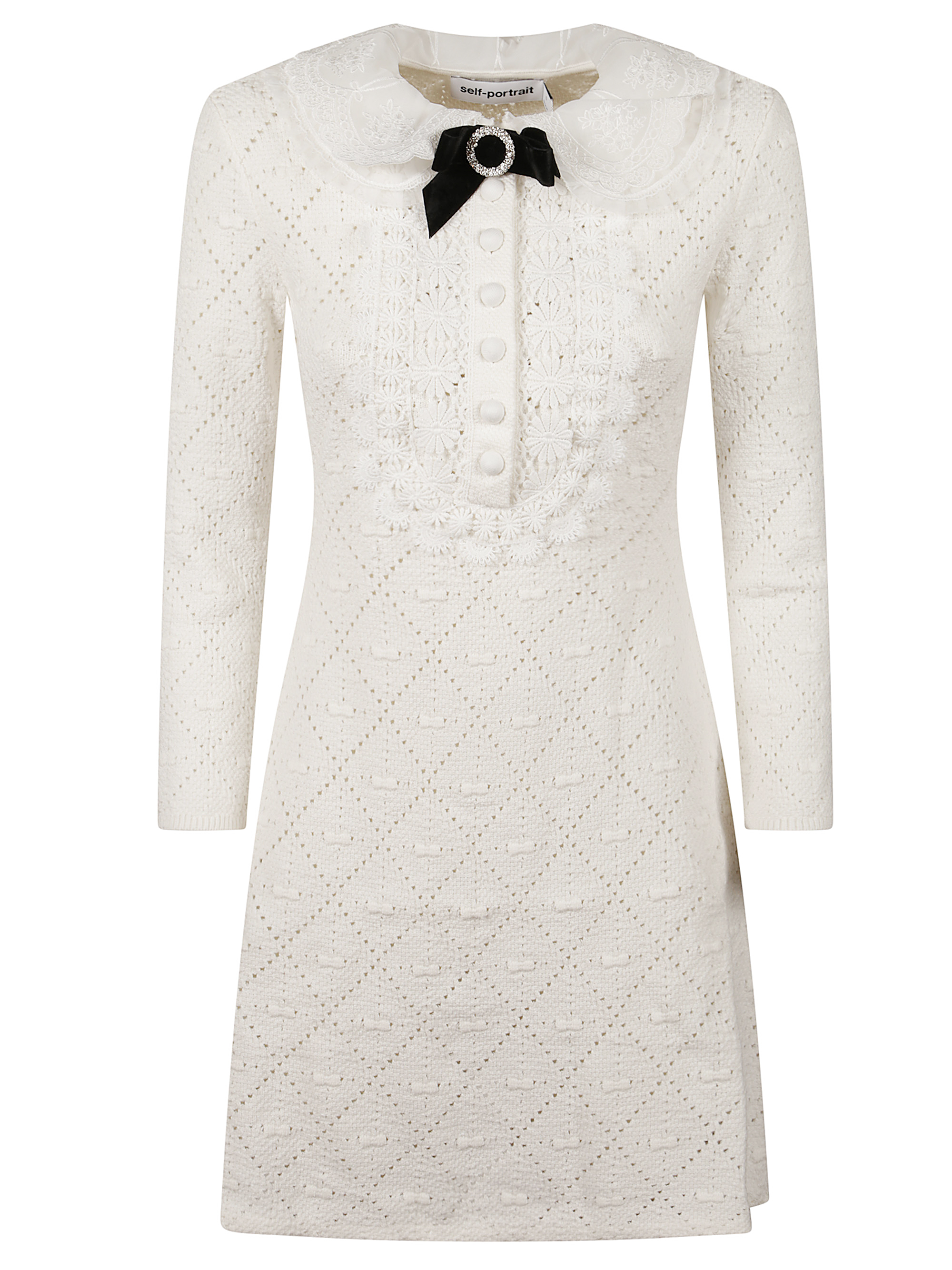SELF PORTRAIT white knitted lace mini dress featuring a lace bib, removable bow brooch, hidden button fastening to the front and a bib detail to the chest.